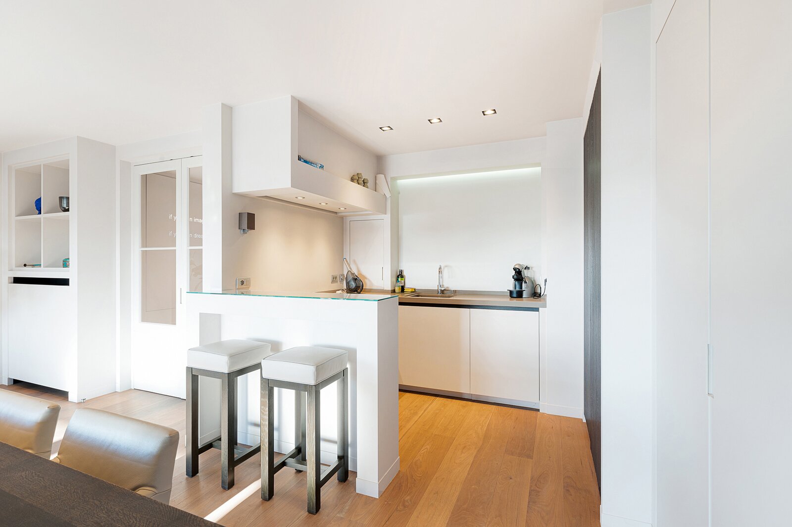 De open keuken is stijlvol geïntegreerd in de living en werd afgewerkt met kwalitatieve materialen — een perfecte balans tussen schoonheid en functionaliteit.