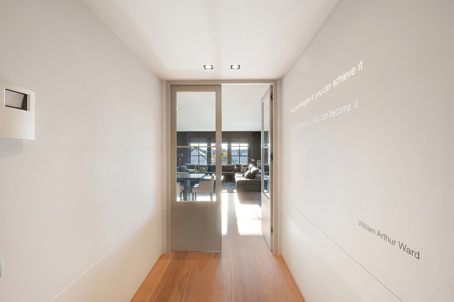 De leefruimte straalt warmte en sereniteit uit, met grote raampartijen die het natuurlijke licht optimaal binnenbrengen en een prachtig, ruimtelijk gevoel creëren. Het aangename, zuidgerichte terras vormt een ideale plek om te ontspannen en de zon in alle privacy te ervaren.
