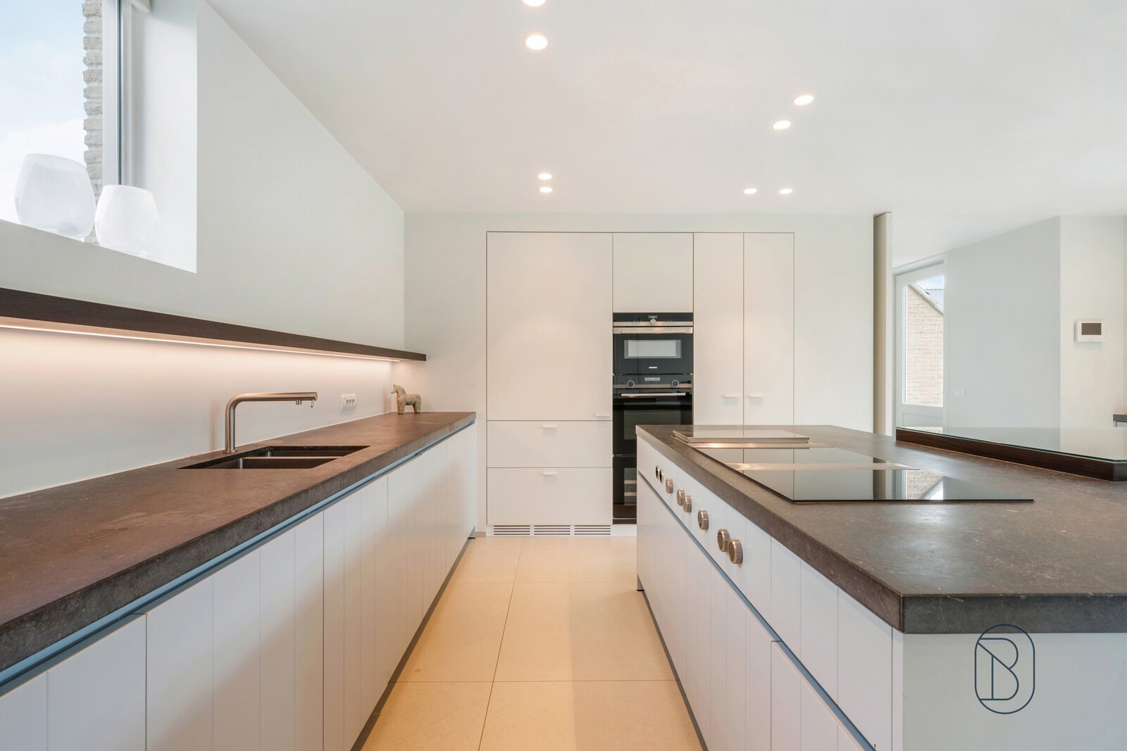 INDELING: inkom en traphal, apart toilet en vestiaire, gezellige grote lichtrijke leefruimte, eetplaats, moderne luxekeuken met eiland en extra ontbijthoek, handige bijkeuken/wasplaats, dubbele garage en kelder.
