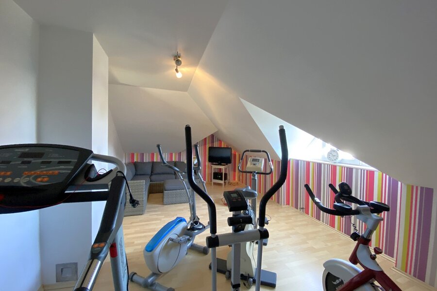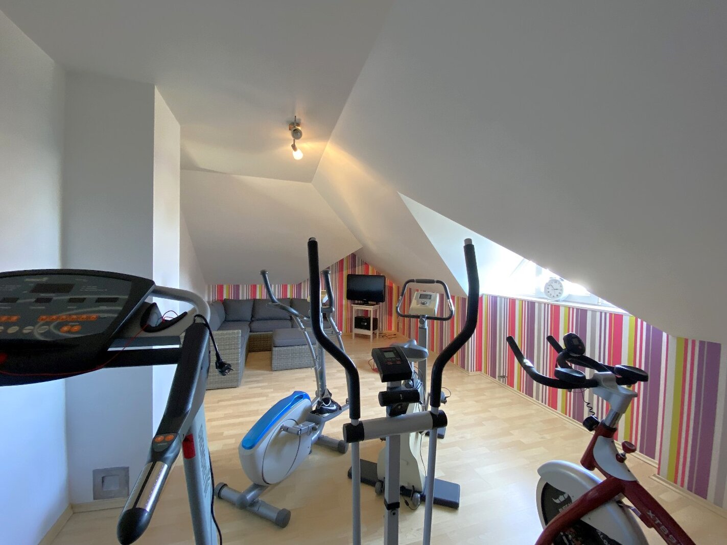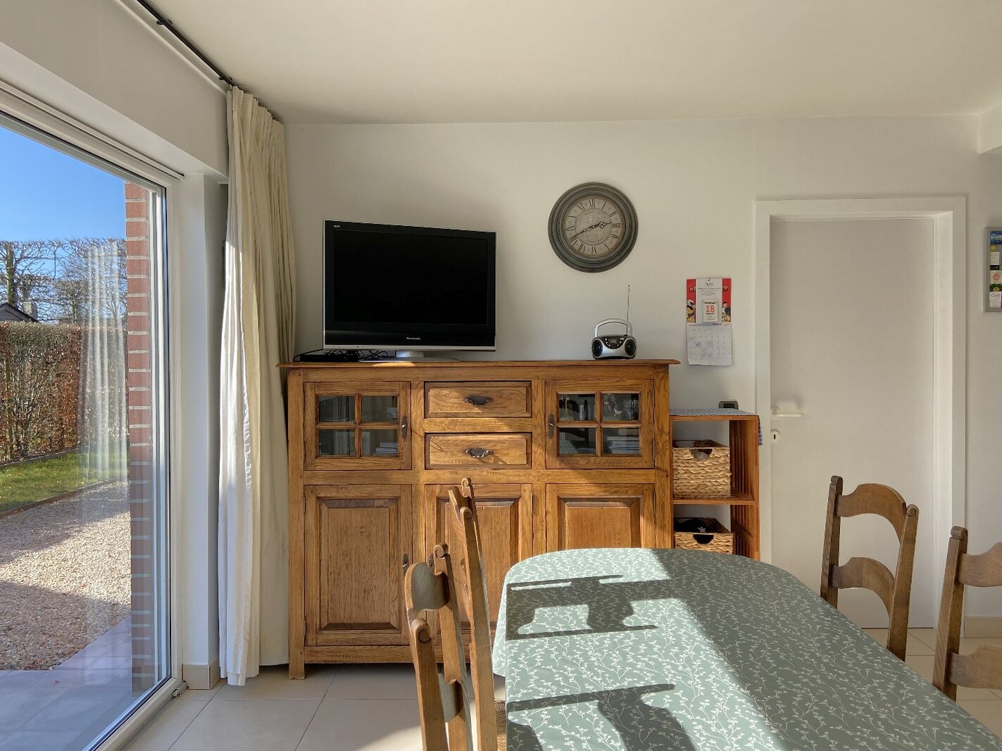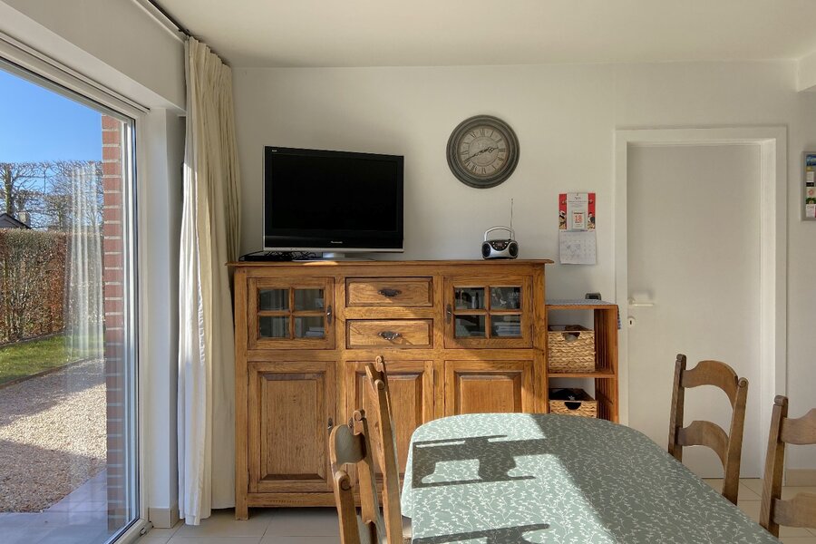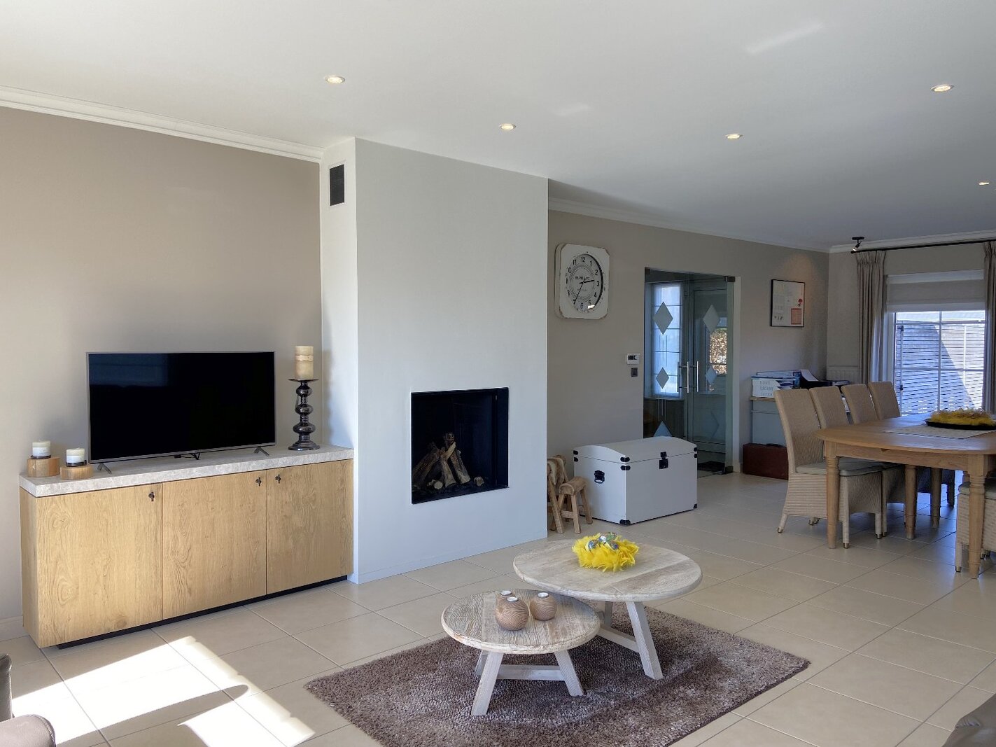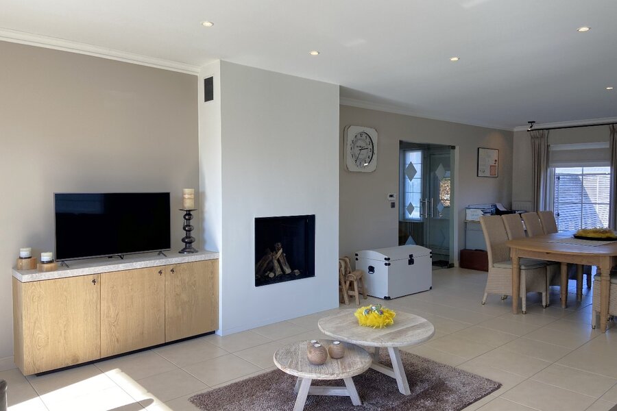 - Zeer lichtrijke en ruime leefruimte met aardgascassette, geïntegreerd in een stijlvolle wand met TV-meubel