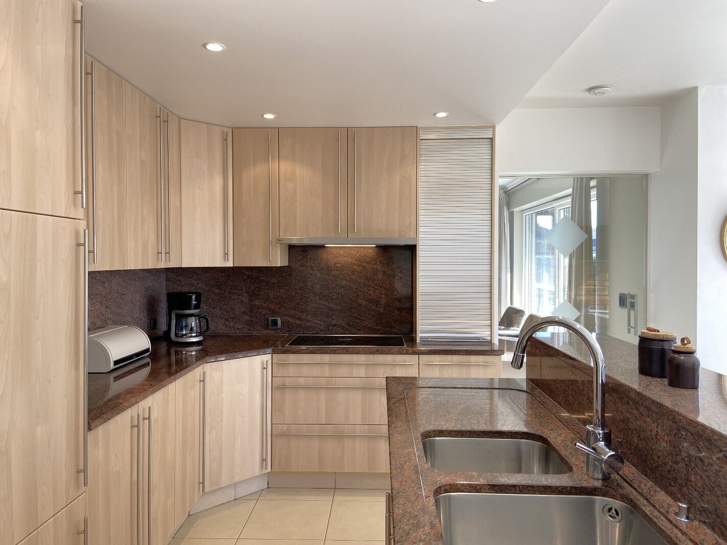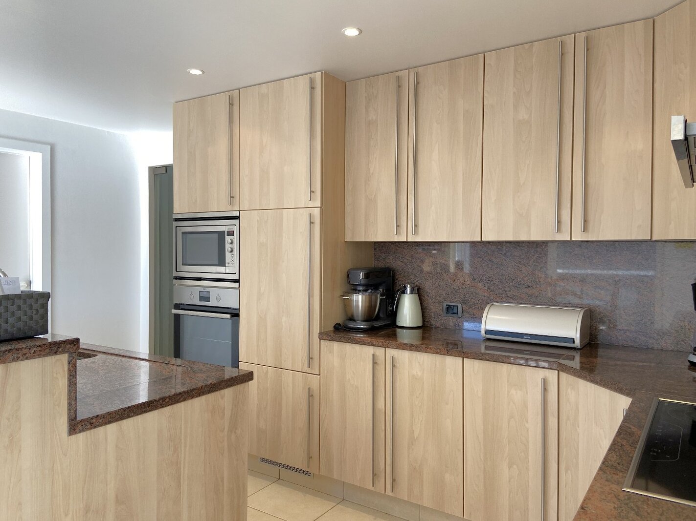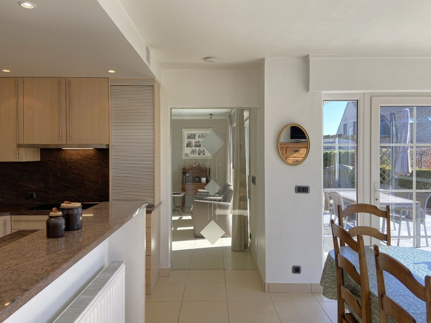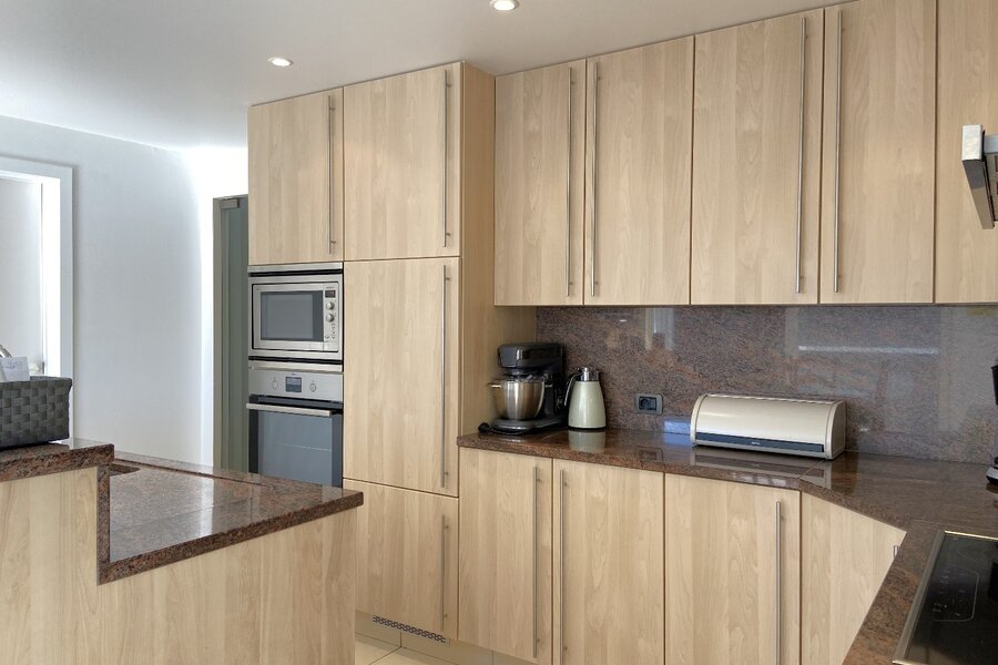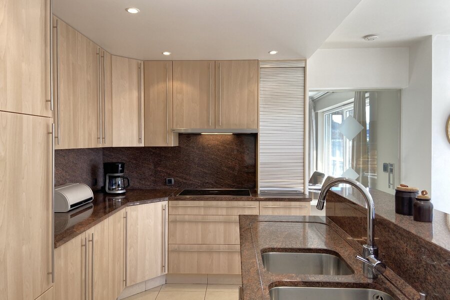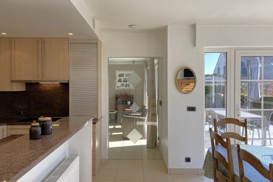 - Aparte, volledig ingerichte keuken met dubbele spoelbak, koelkast, oven, microgolf, vaatwasser, keramische kookplaat en dampkap, afgewerkt met granieten werkblad