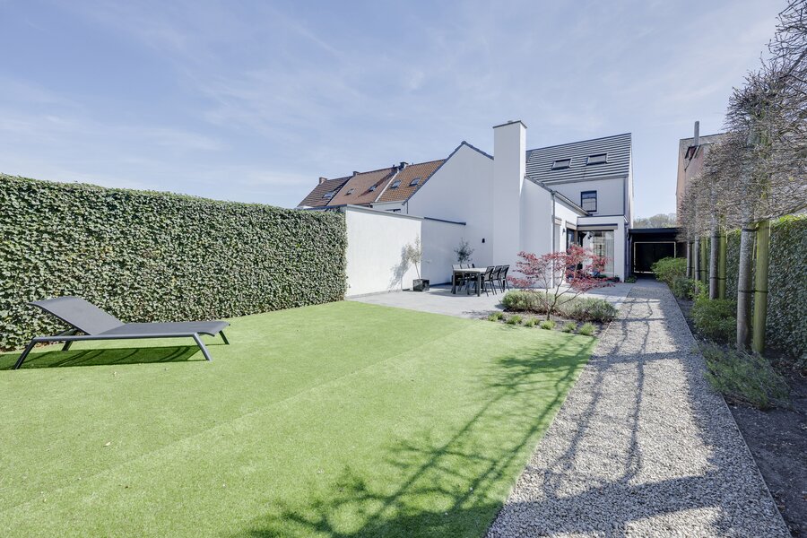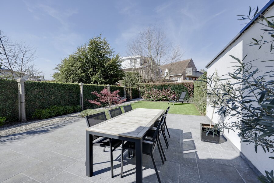 Buiten geniet u van een aangelegde tuin, welke perfect werd onderhouden, met ruime terrassen. Dankzij de hoge bomen rondom ervaart u hier een uitzonderlijke privacy. Vooraan het perceel is een carport voorzien en achteraan kan u gebruik maken van een dubbele parking met een geautomatiseerde poort.