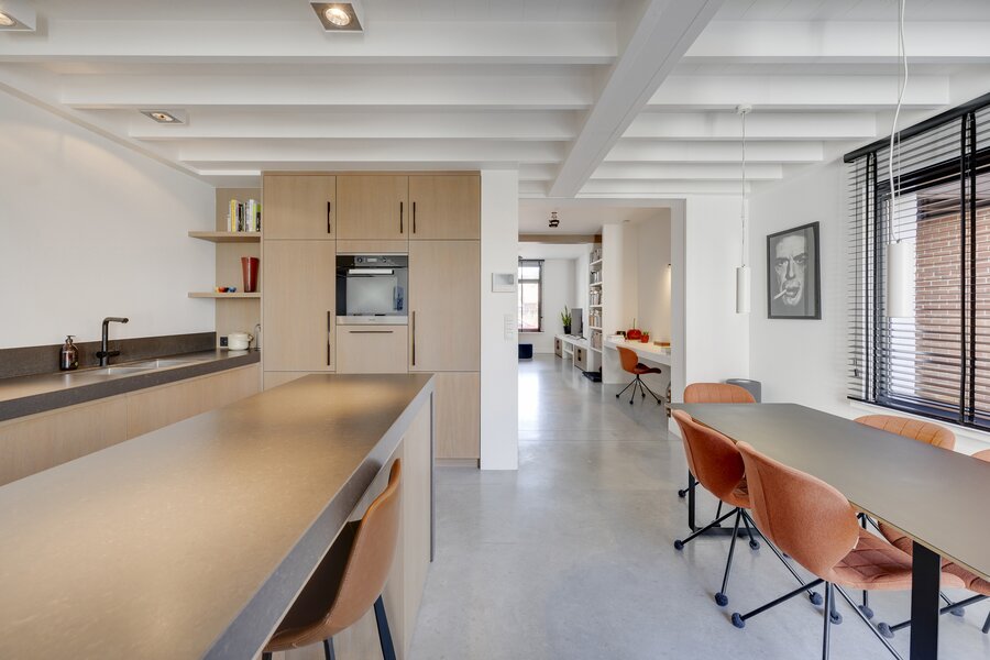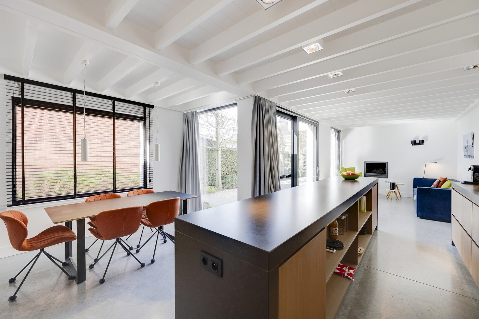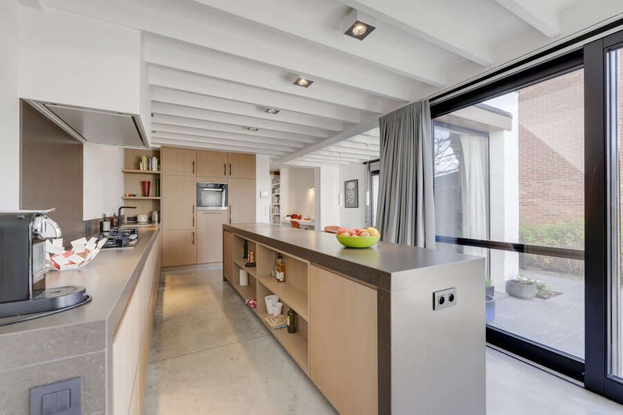 Bij het betreden van de woning komt u in de inkomhal met een gastentoilet en toegang tot de kelder. De lichtrijke en ruime woonkamer sluit naadloos aan op een bureelruimte en eetkamer. De gezellige leefkeuken is voorzien van eindeloos veel kastruimte met een groot kookeiland inclusief ontbijttoog. Alle kwalitatieve inbouwtoestellen zorgen voor de nodige hedendaagse luxe. Verder is er nog eens een zithoek waar u kan genieten van een sfeervolle open haard. De tuin is toegankelijk vanuit de keuken en zithoek.