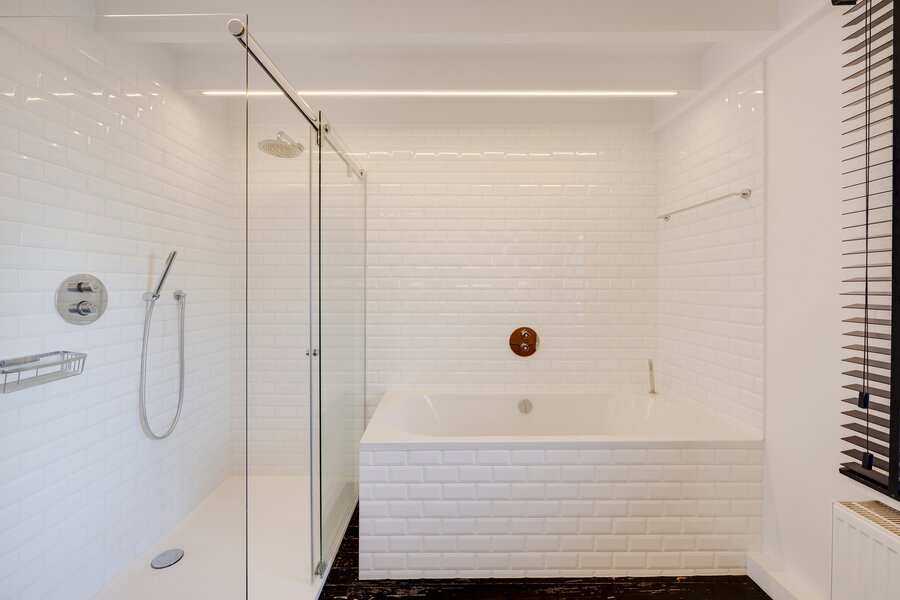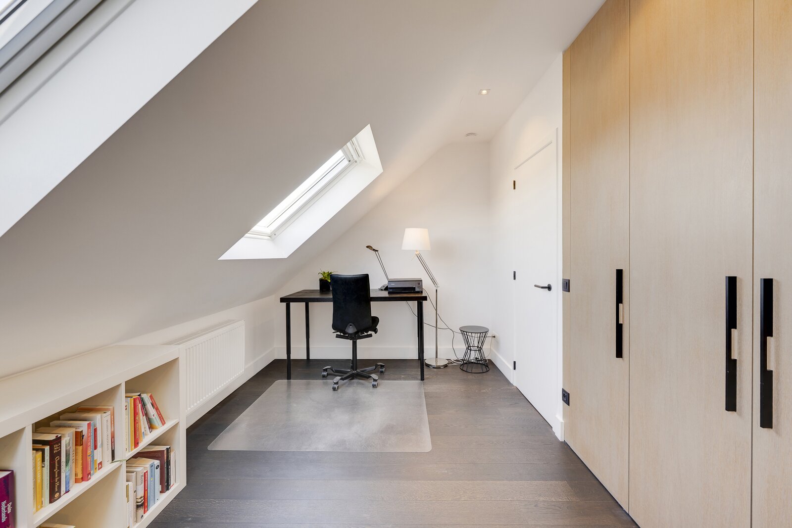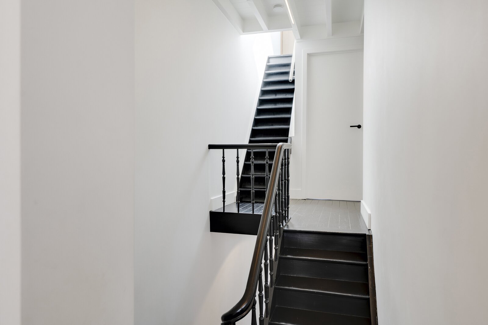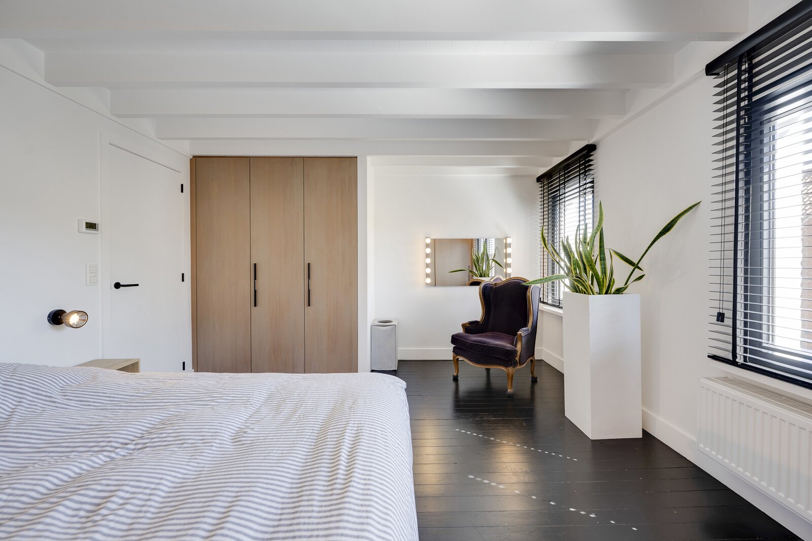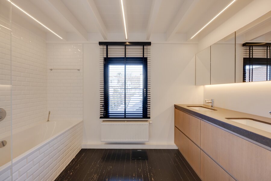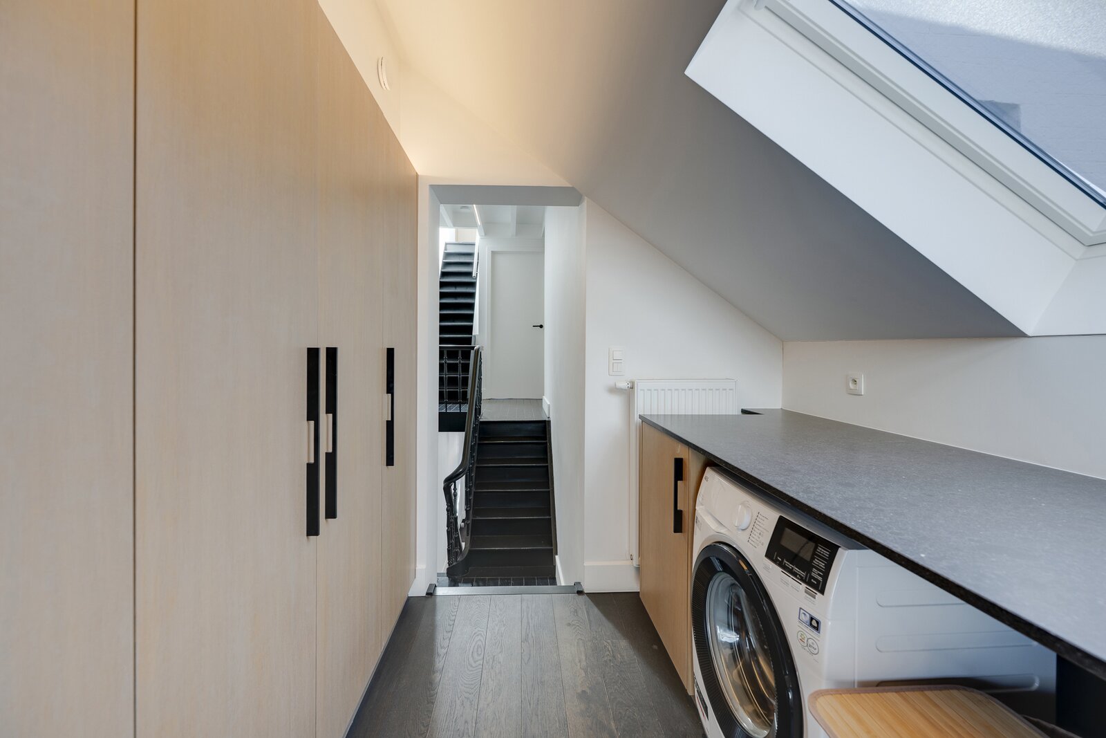 Op de eerste verdieping bevinden zich twee ruime slaapkamers met ingebouwde kasten en een stijlvolle badkamer met inloopdouche, ligbad, dubbele lavabo en toilet. Verder is er nog een praktische wasplaats, extra douchekamer en bergplaats.