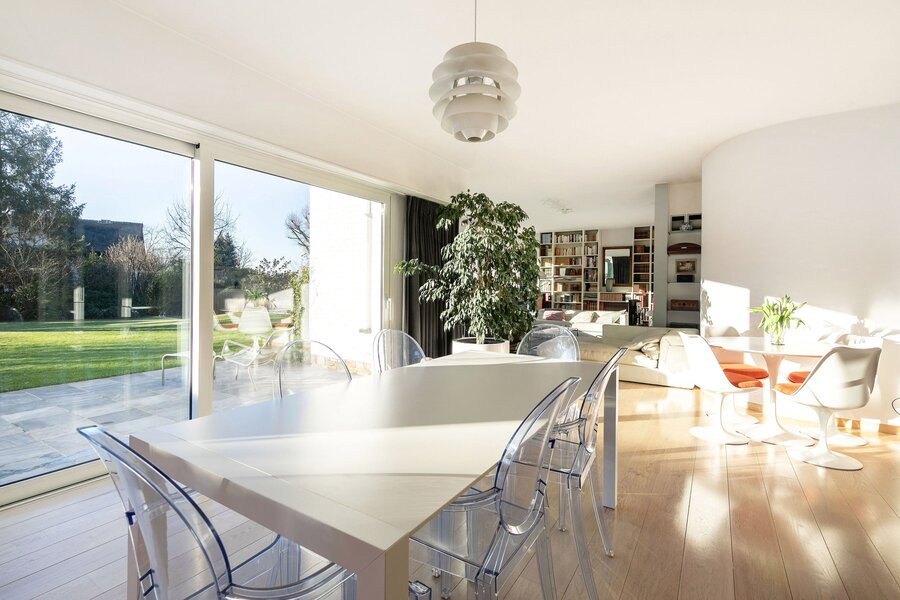 Eetkamer ± 25m² met directe toegang tot het terras en de tuin, parketvloer