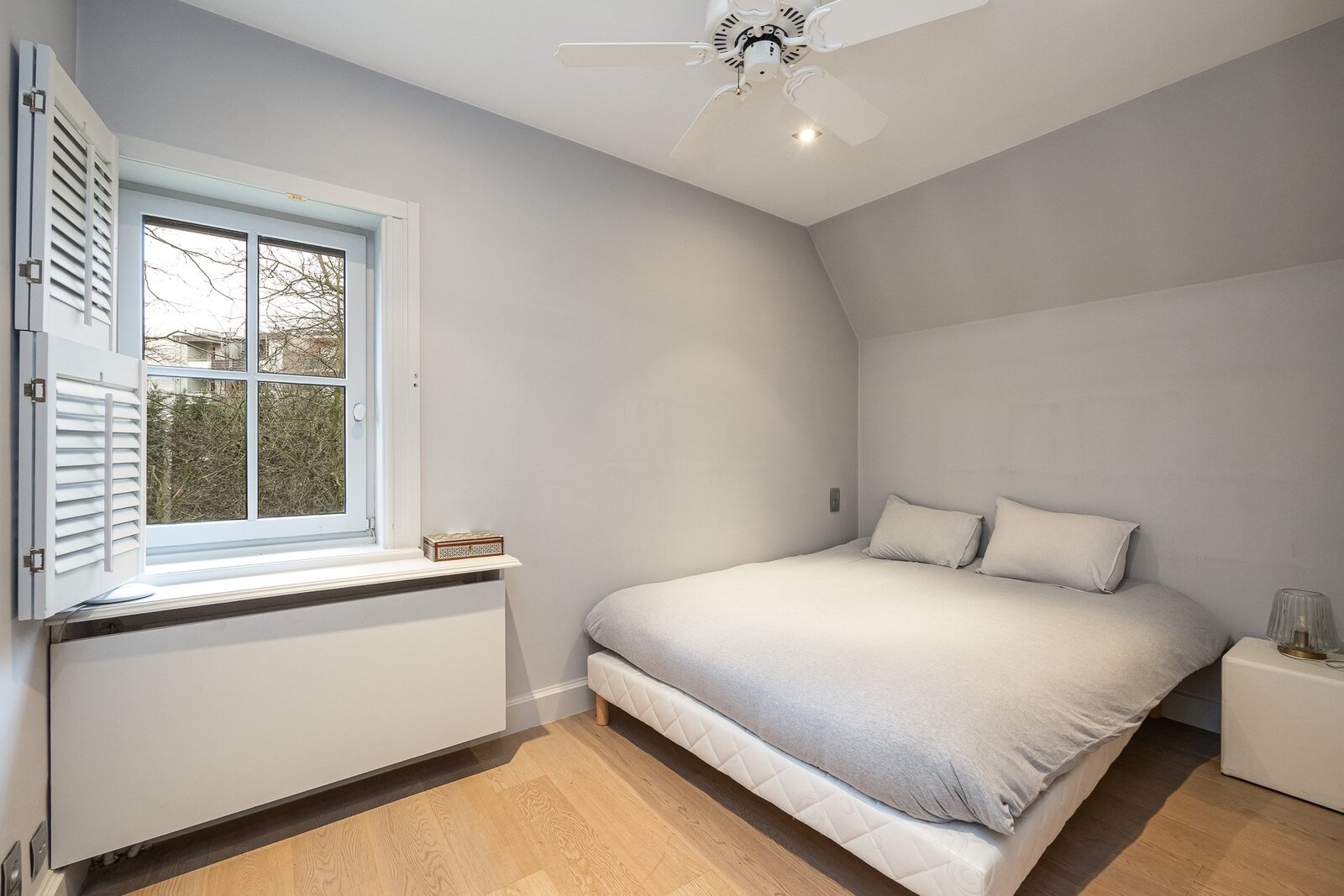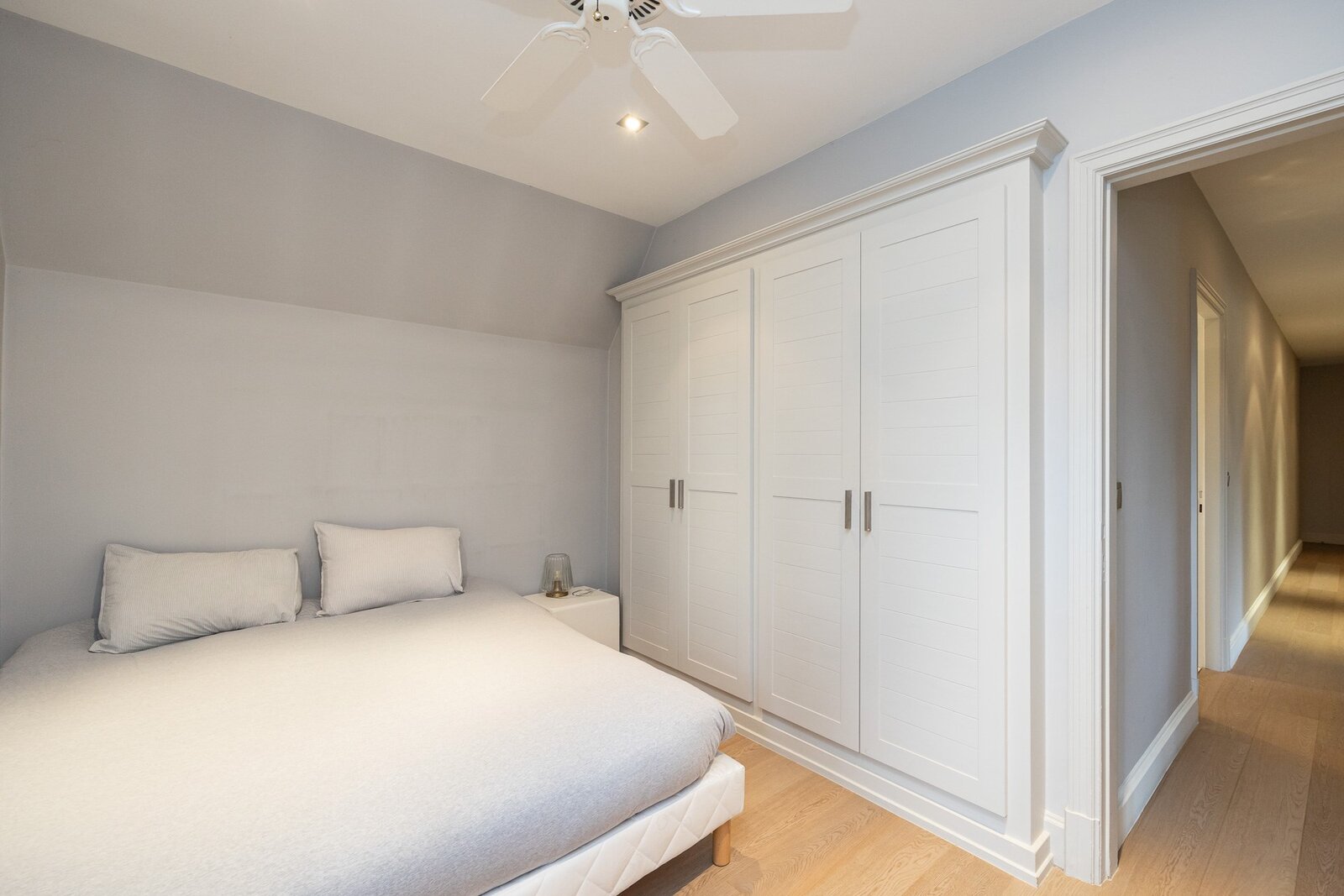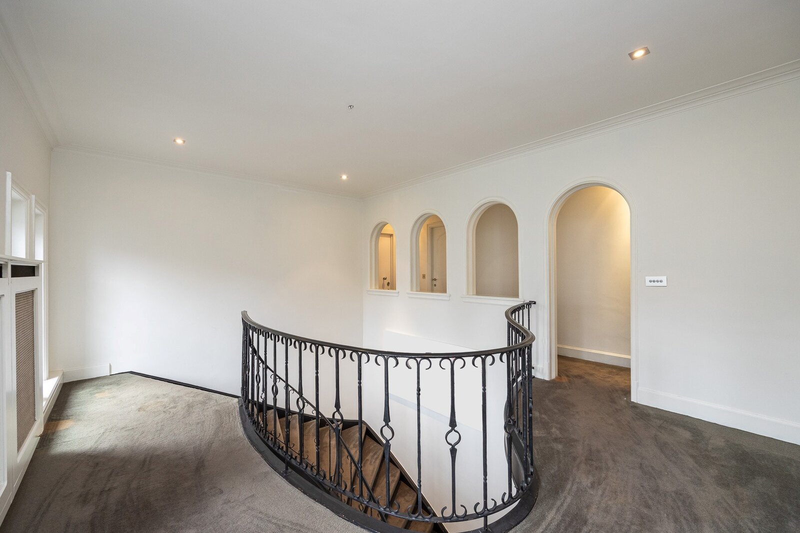 De 1ste verdieping kan je zowel via de hoofdtrap in de inkomhal of via de dienstentrap aan de zij-ingang bereiken. Master bedroom met aangrenzend bureau of dressingruimte en badkamer. Op de eerste verdieping bevinden zich nog 4 slaapkamers en 2 badkamers. Grote troef: er is nog een riante ruimte dewelke benut kan worden als atelier, speelkamer voor kinderen, tweede woonkamer, wat het hartje ook maar begeerd.