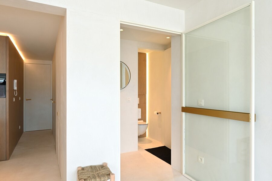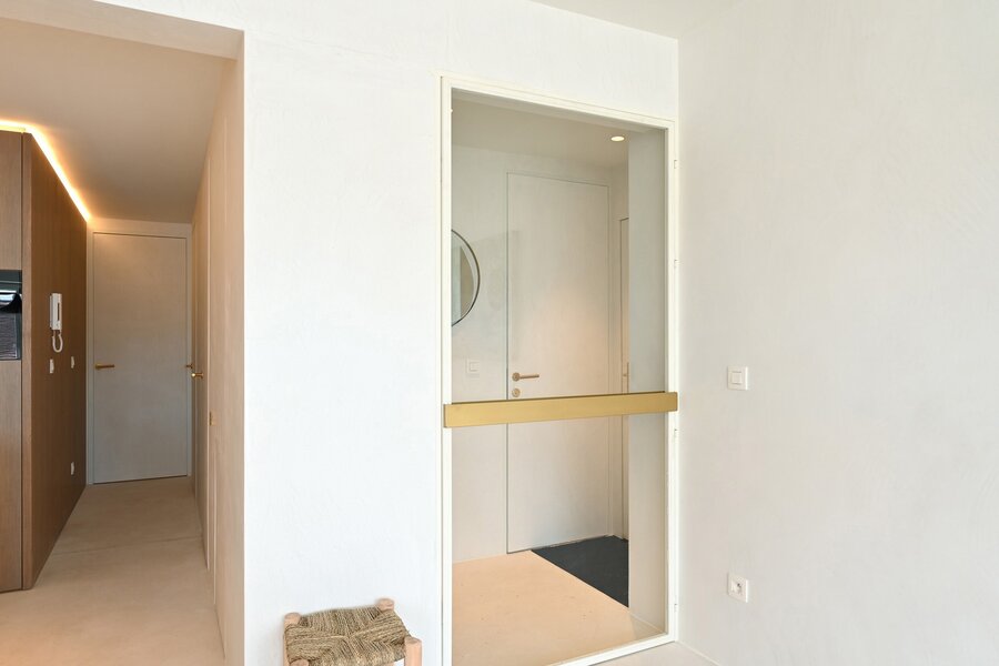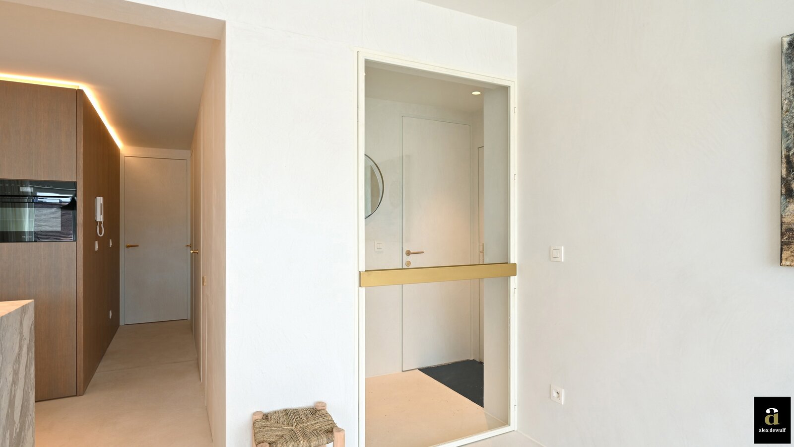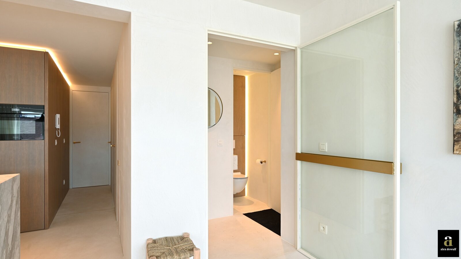 Het appartement verwelkomt u in een ruime inkomhal met vestiaire en gastentoilet. De lichtrijke woon- en eetkamer is stijlvol afgewerkt en beschikt over ingemaakte kasten, en biedt directe toegang tot het zuidgerichte terras. De moderne open keuken met eethoek is uitgerust met alle luxueuze voorzieningen die u zich kunt wensen. Een volledige kastenwand in de leefruimte zorgt voor extra opbergruimte. Daarnaast is er een handige berging met aansluiting voor een wasmachine en droogkast.