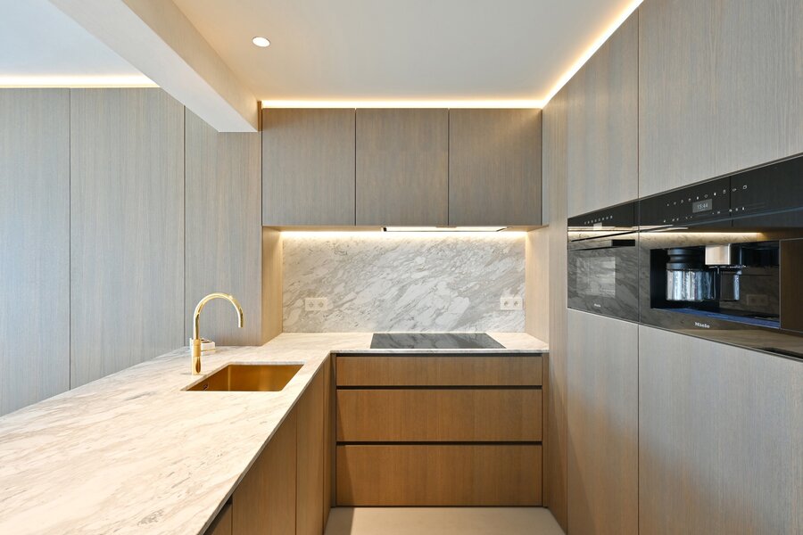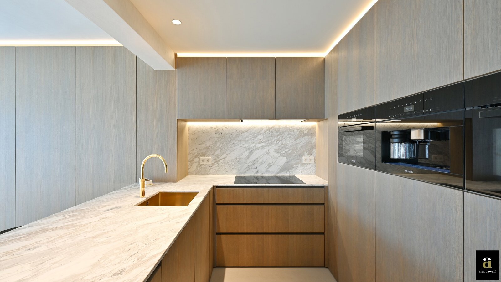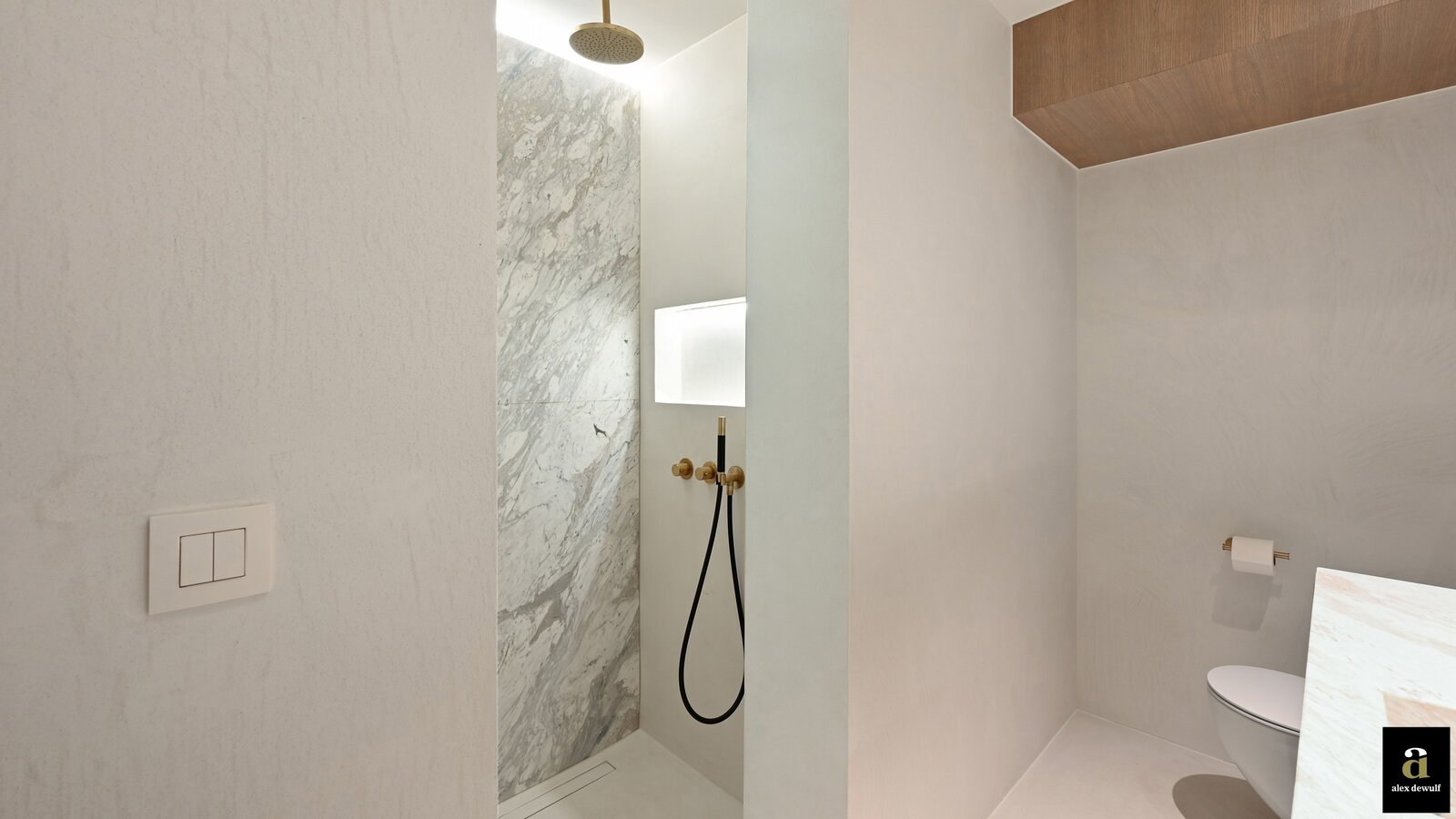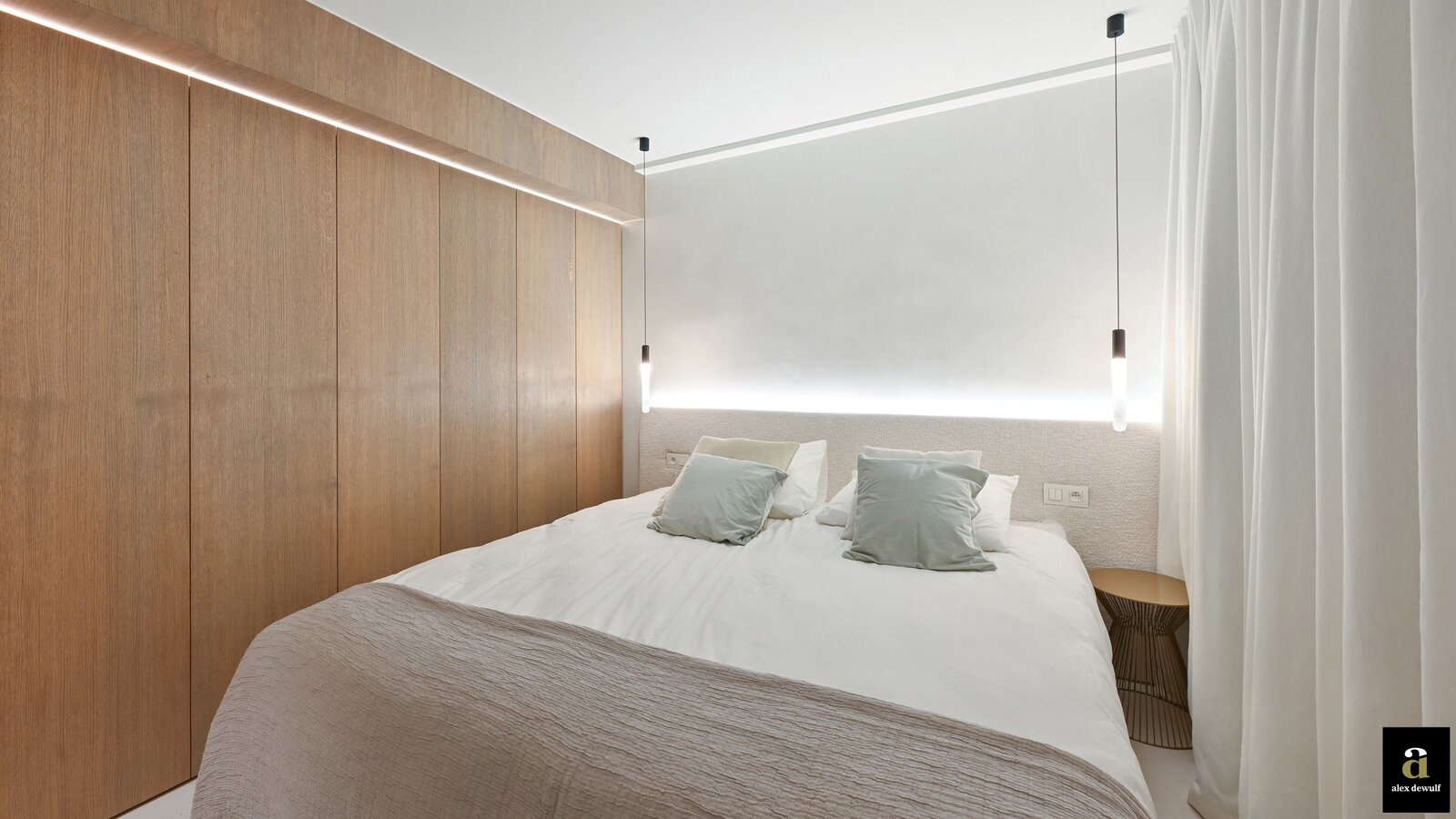 Het appartement verwelkomt u in een ruime inkomhal met vestiaire en gastentoilet. De lichtrijke woon- en eetkamer is stijlvol afgewerkt en beschikt over ingemaakte kasten, en biedt directe toegang tot het zuidgerichte terras. De moderne open keuken met eethoek is uitgerust met alle luxueuze voorzieningen die u zich kunt wensen. Een volledige kastenwand in de leefruimte zorgt voor extra opbergruimte. Daarnaast is er een handige berging met aansluiting voor een wasmachine en droogkast.