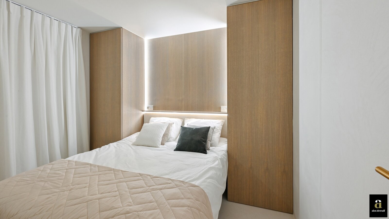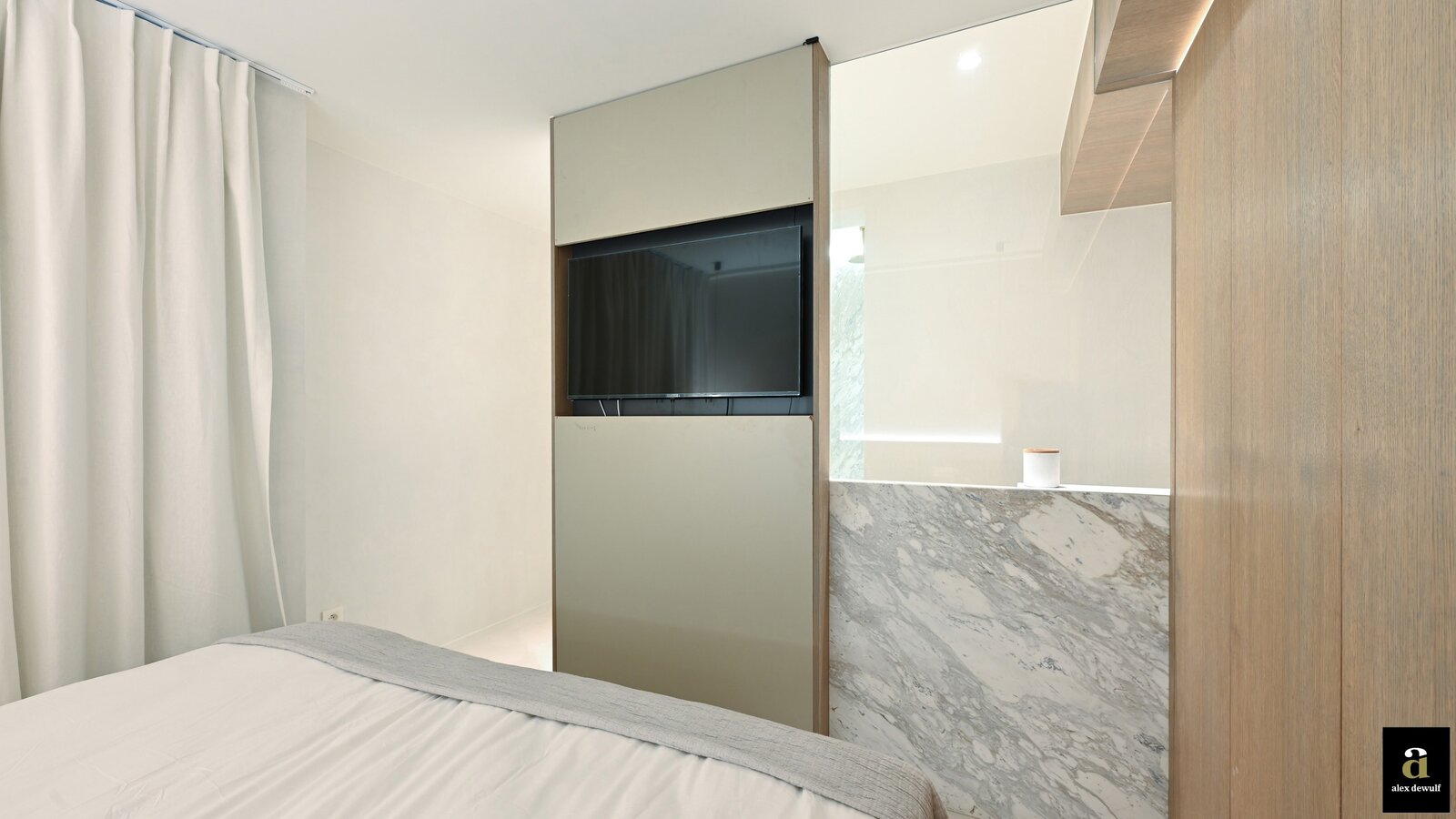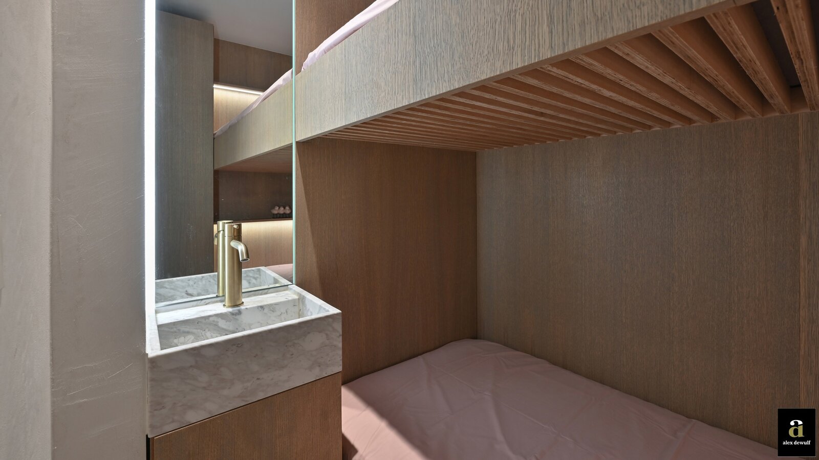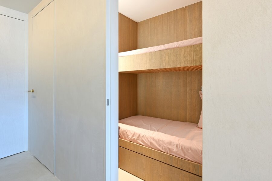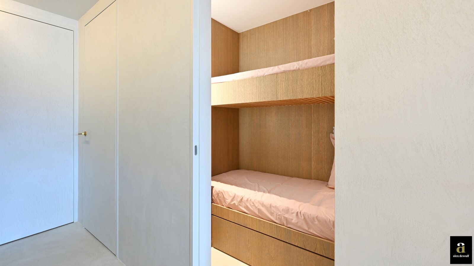 Het appartement biedt drie comfortabele slaapkamers. De masterbedroom beschikt over een aansluitende douchekamer met wastafel, toilet en inloopdouche. De tweede ruime slaapkamer is voorzien van een douchekamer en apart toilet, terwijl de derde slaapkamer is uitgerust met een stapelbed, kast en lavabo. Alle slaapkamers zijn smaakvol voorzien van ingemaakte kasten.