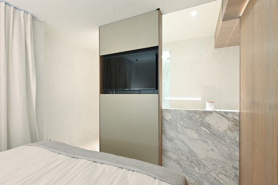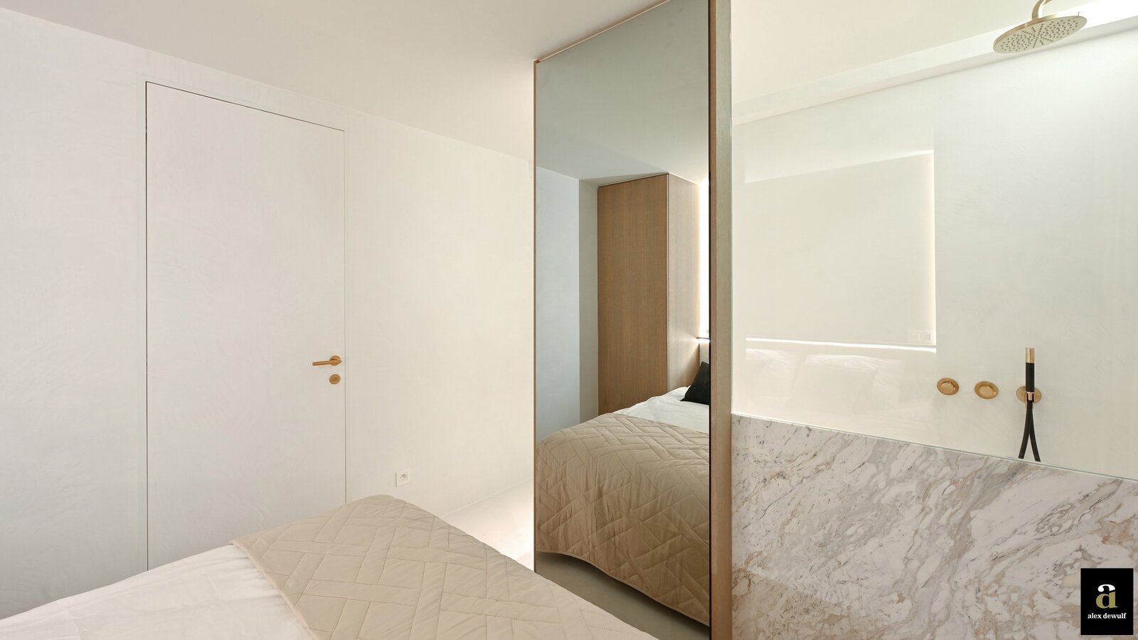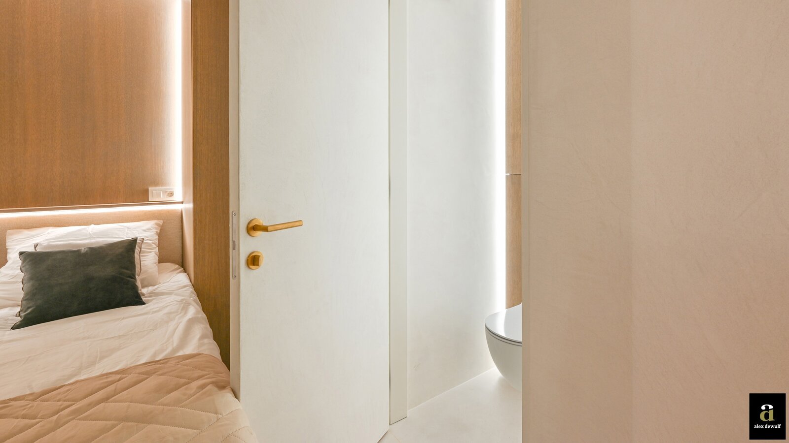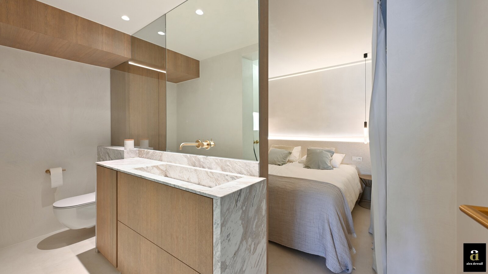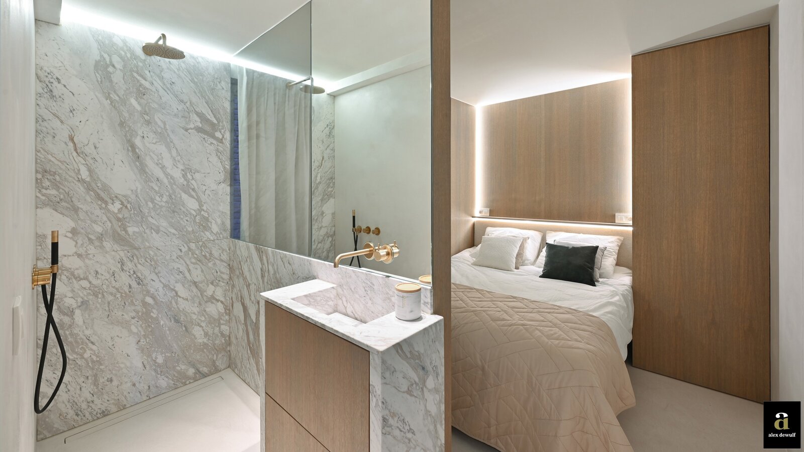 Het appartement biedt drie comfortabele slaapkamers. De masterbedroom beschikt over een aansluitende douchekamer met wastafel, toilet en inloopdouche. De tweede ruime slaapkamer is voorzien van een douchekamer en apart toilet, terwijl de derde slaapkamer is uitgerust met een stapelbed, kast en lavabo. Alle slaapkamers zijn smaakvol voorzien van ingemaakte kasten.