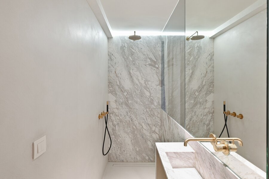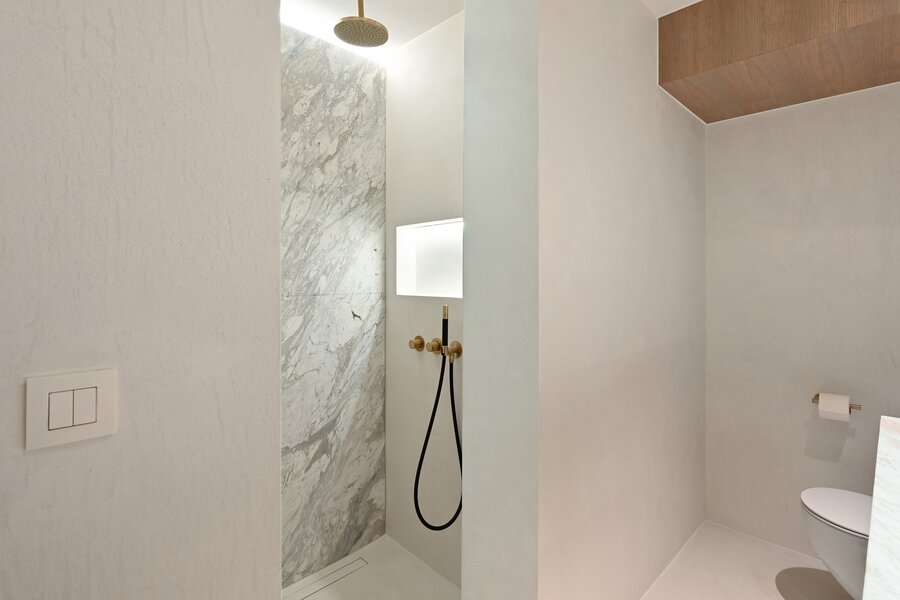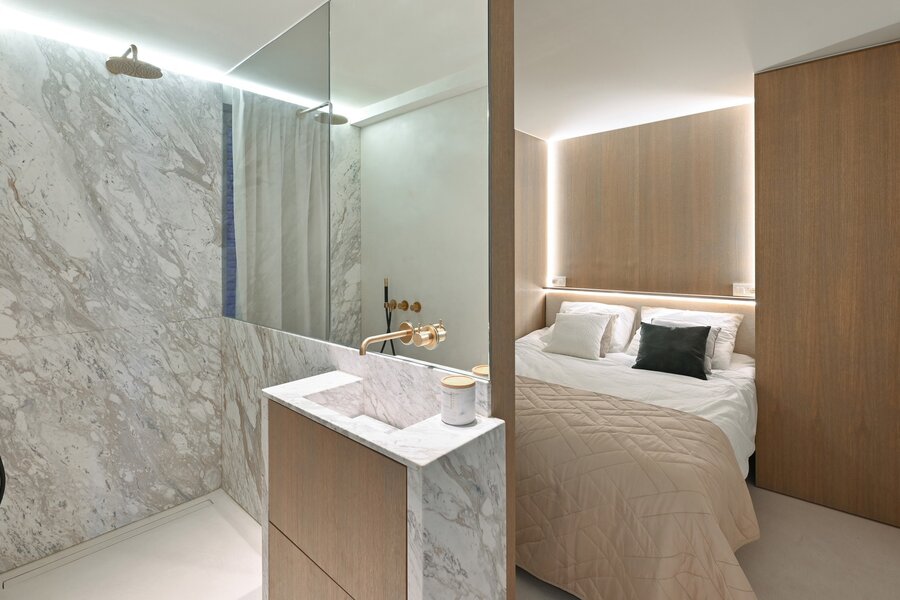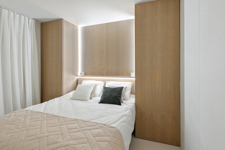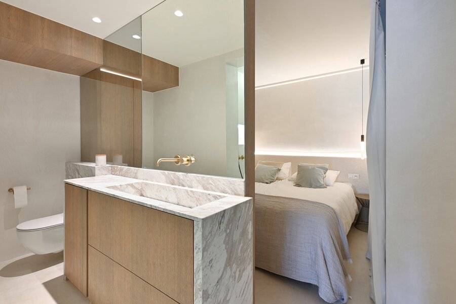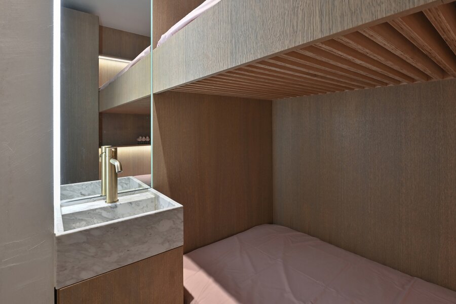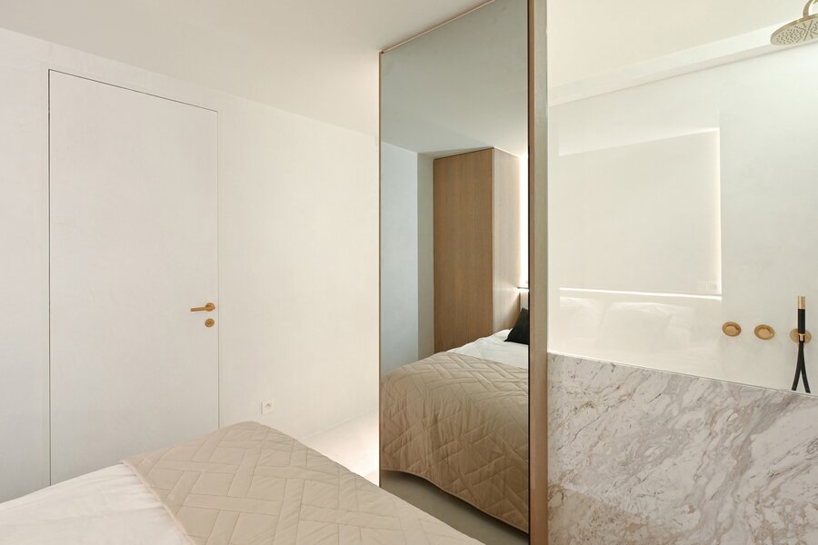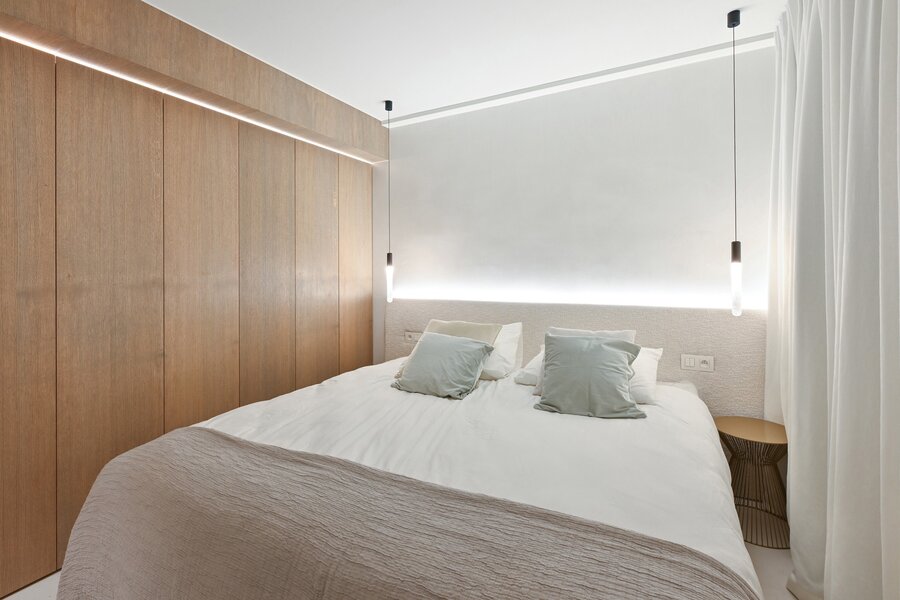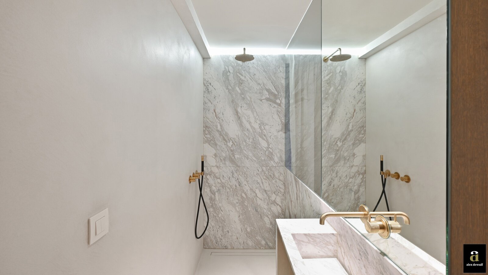Het appartement biedt drie comfortabele slaapkamers. De masterbedroom beschikt over een aansluitende douchekamer met wastafel, toilet en inloopdouche. De tweede ruime slaapkamer is voorzien van een douchekamer en apart toilet, terwijl de derde slaapkamer is uitgerust met een stapelbed, kast en lavabo. Alle slaapkamers zijn smaakvol voorzien van ingemaakte kasten.