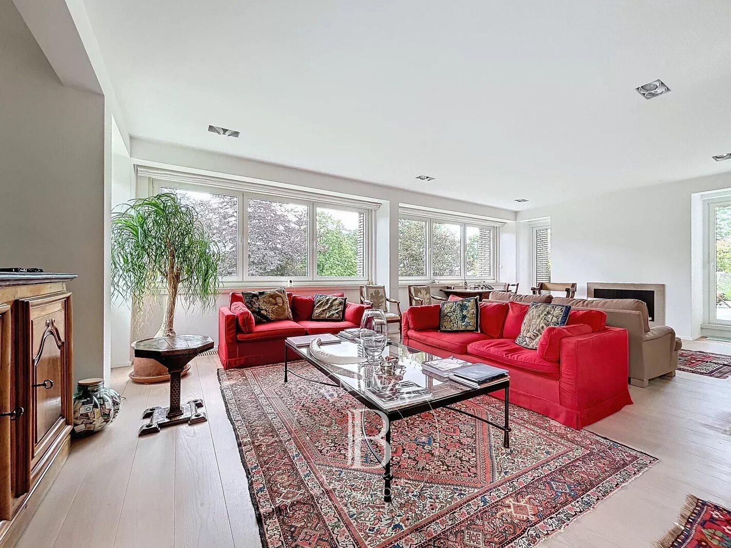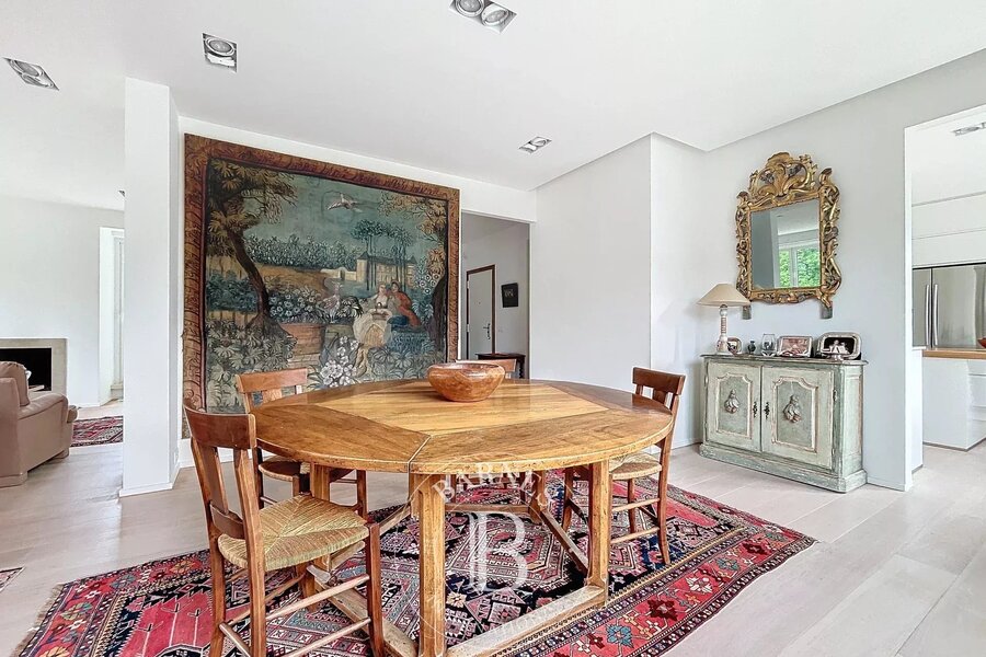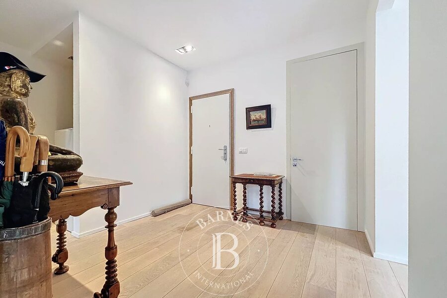Inkomhal met vestiaire en gastentoilet, wasruimte met opbergkasten, ruime ontvangstruimte met massief eiken parketvloer en open haard, toegang tot het terras (zuid-west gericht).