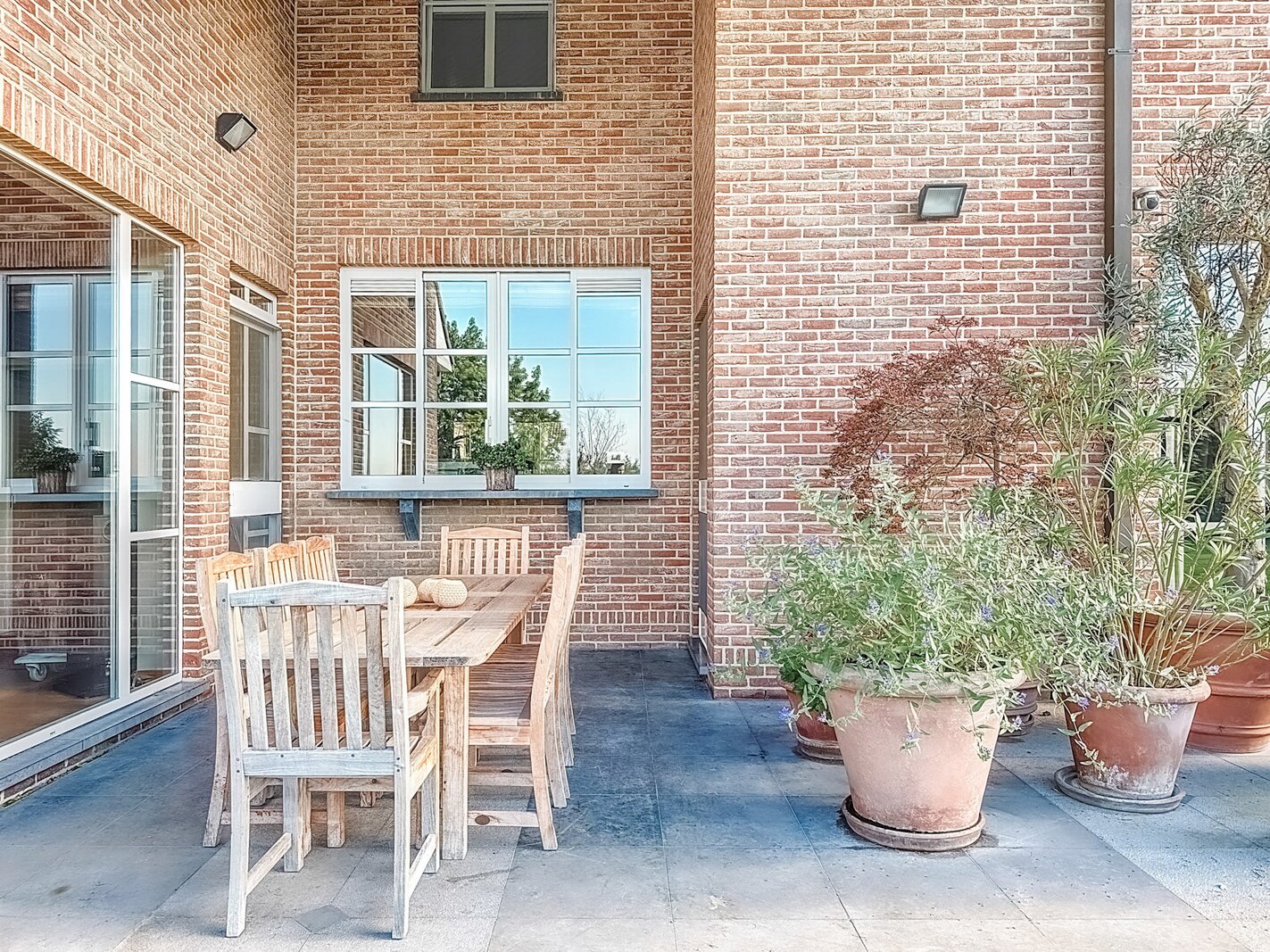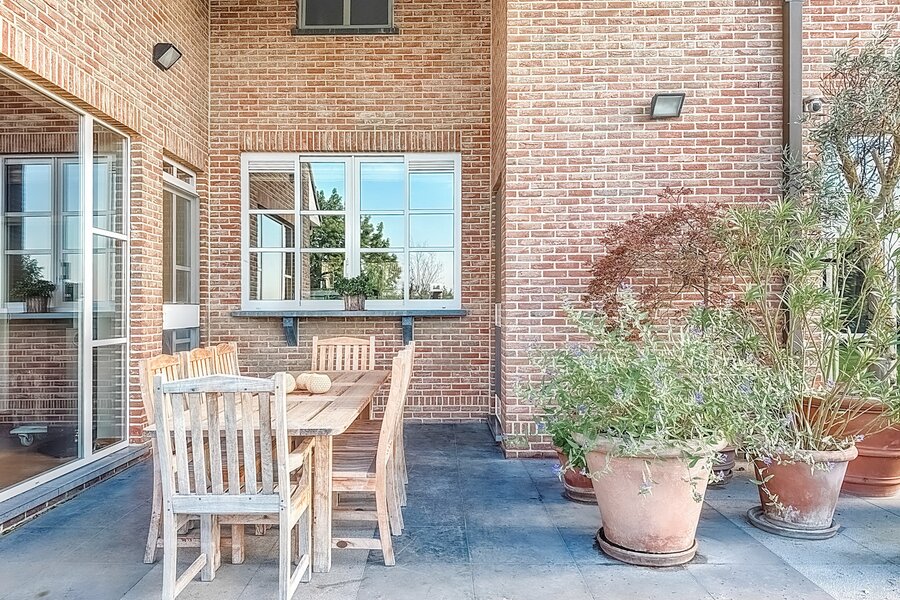 Langs de volledige achterzijde van de woning ligt een uitgestrekt terras dat doorloopt rondom het verwarmde zwembad van 5 op 11 meter, uitgerust met een thermisch rolluik.