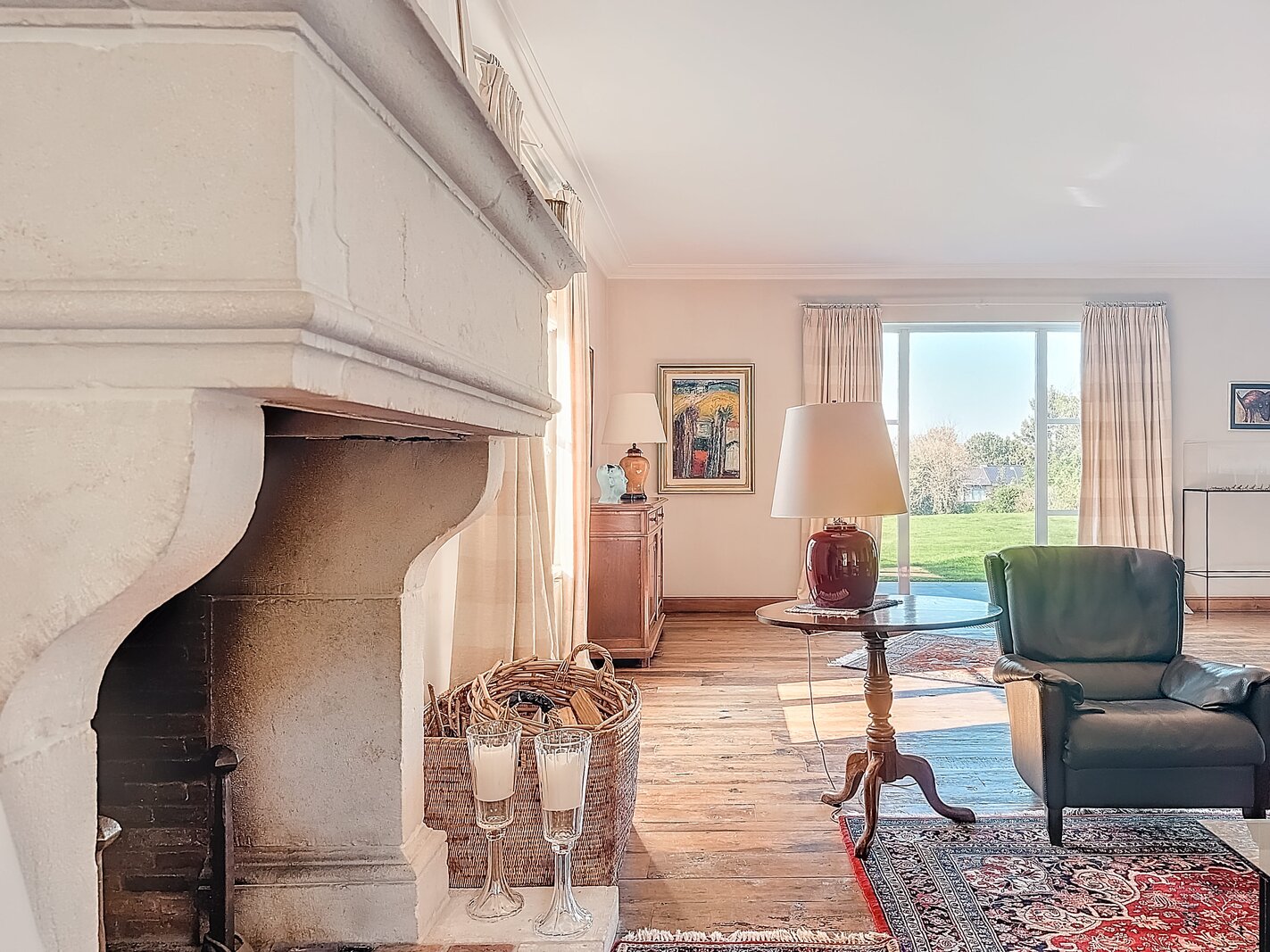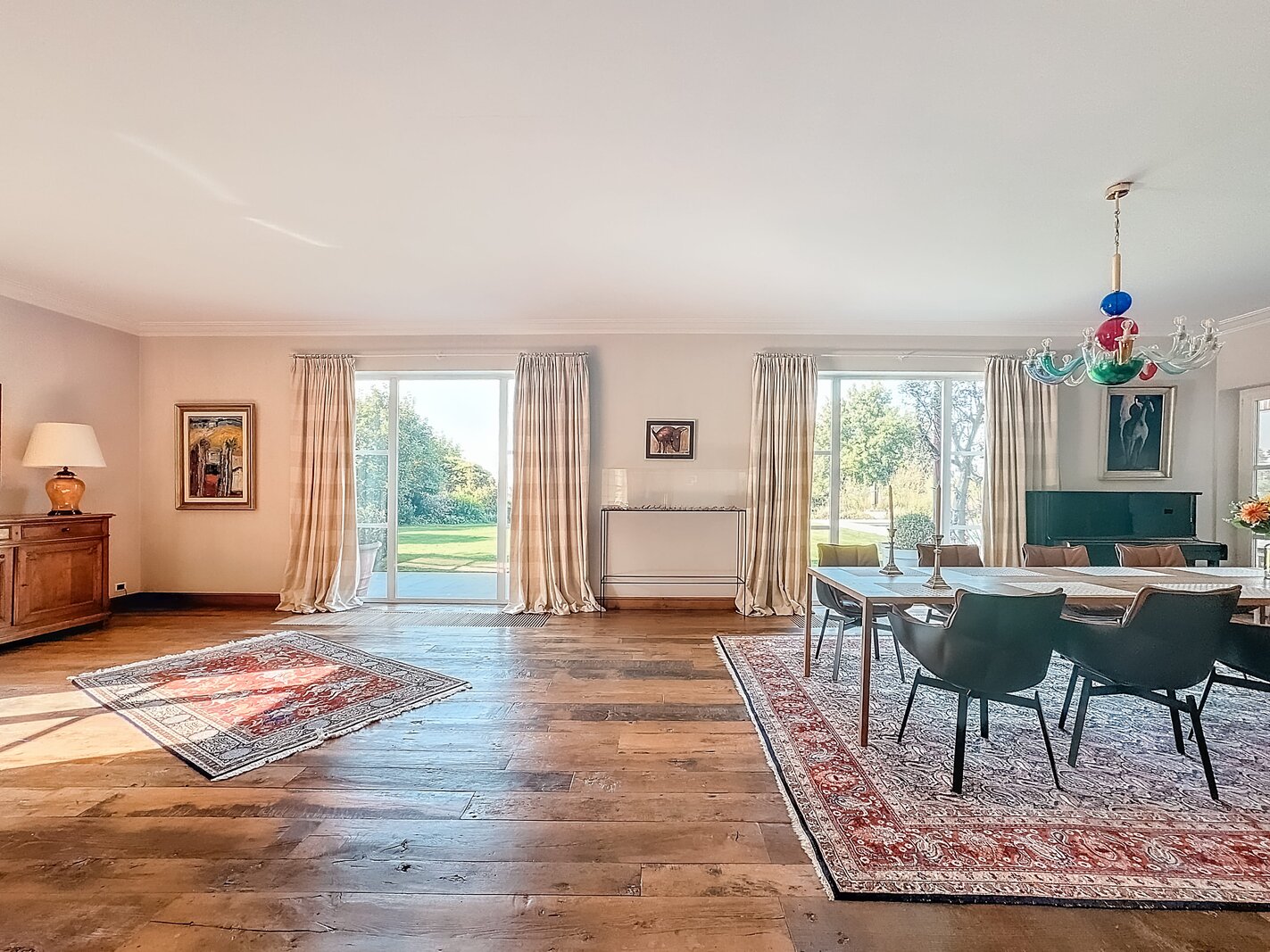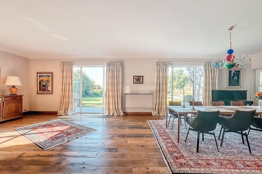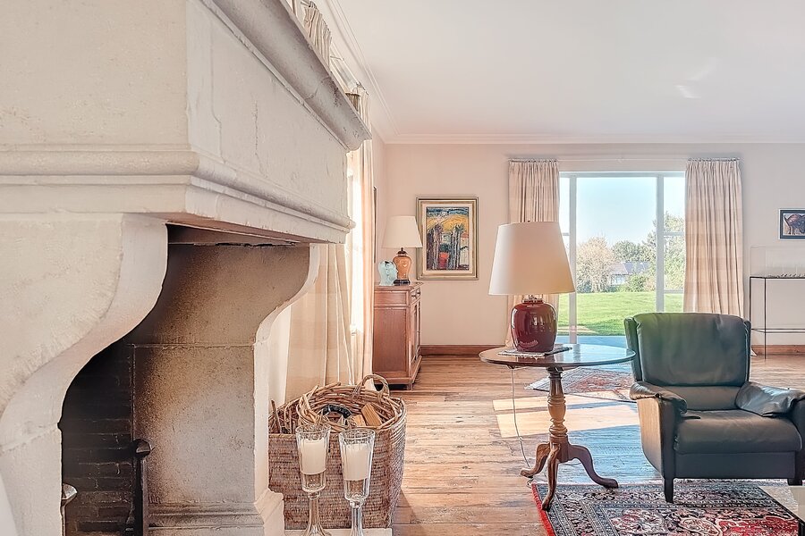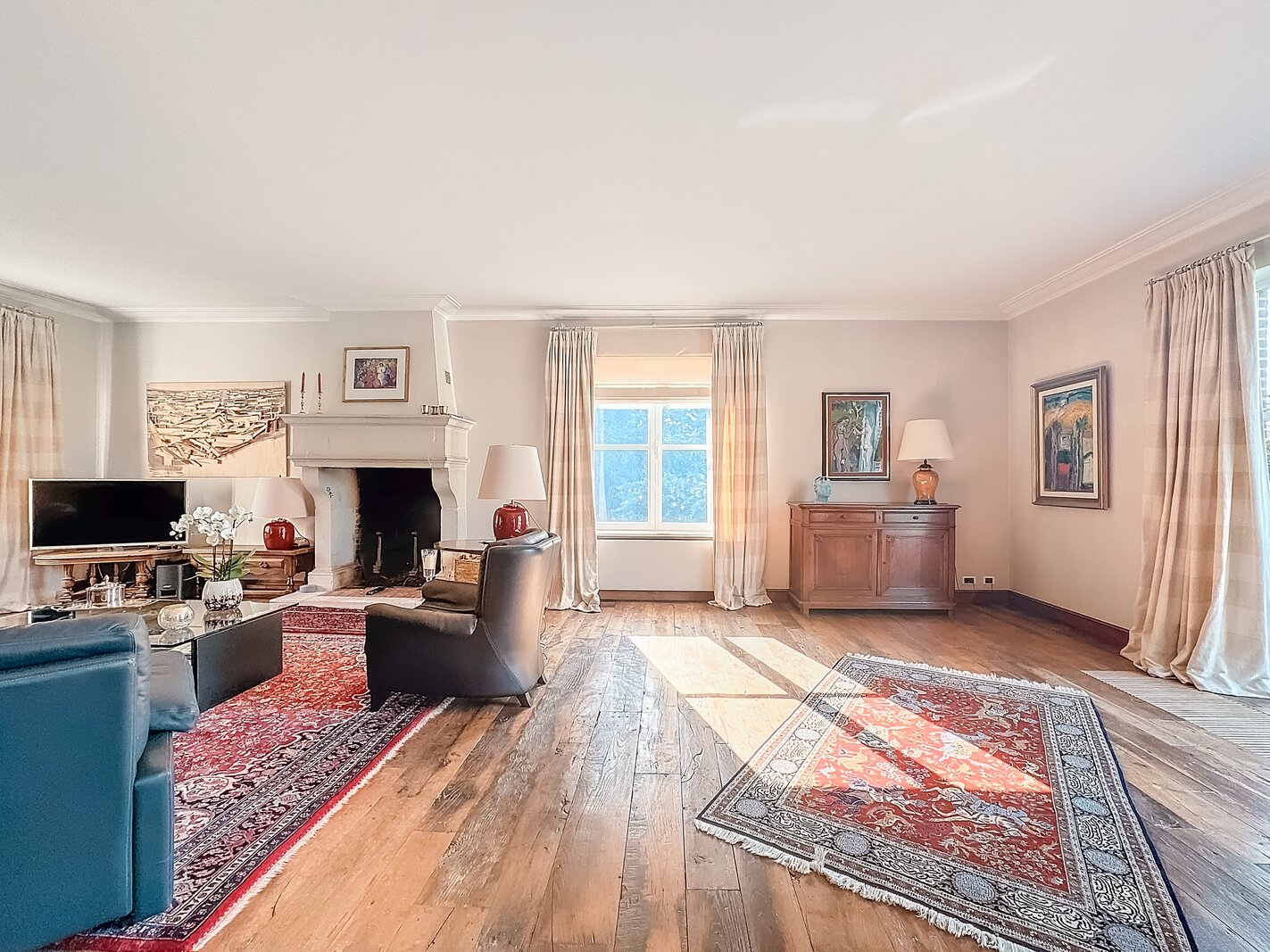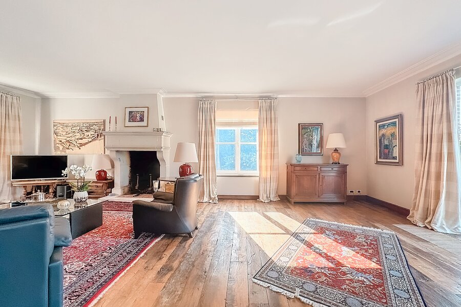 Op het gelijkvloers bevindt zich de impressionante inkomhal met authentieke Bourgondische hartsteen die toegang geeft tot de ruime L-vormige living met eetkamer (± 85 m²), voorzien van een functionele open haard. De Bulthaup-keuken met Gaggenau-toestellen heeft een centraal opbergeiland en een eethoek. Daarnaast is er een grote polyvalente ruimte met vide tot in de nokhoogte en een waskeuken met douche.