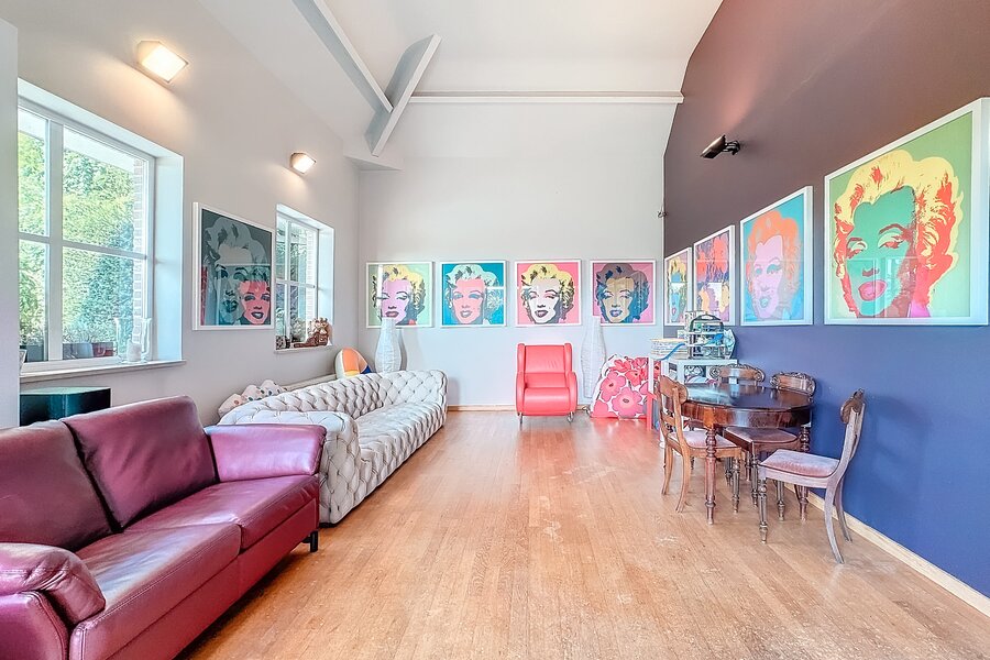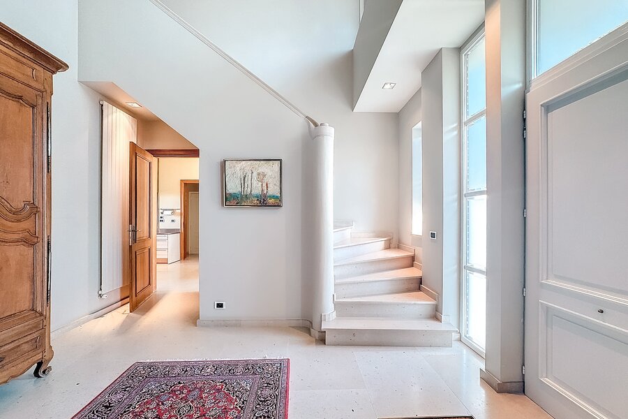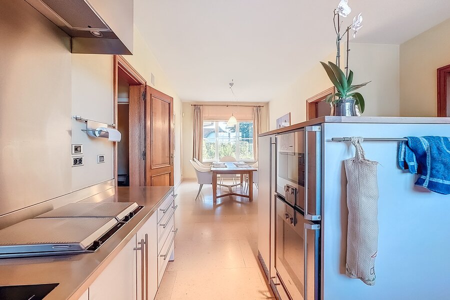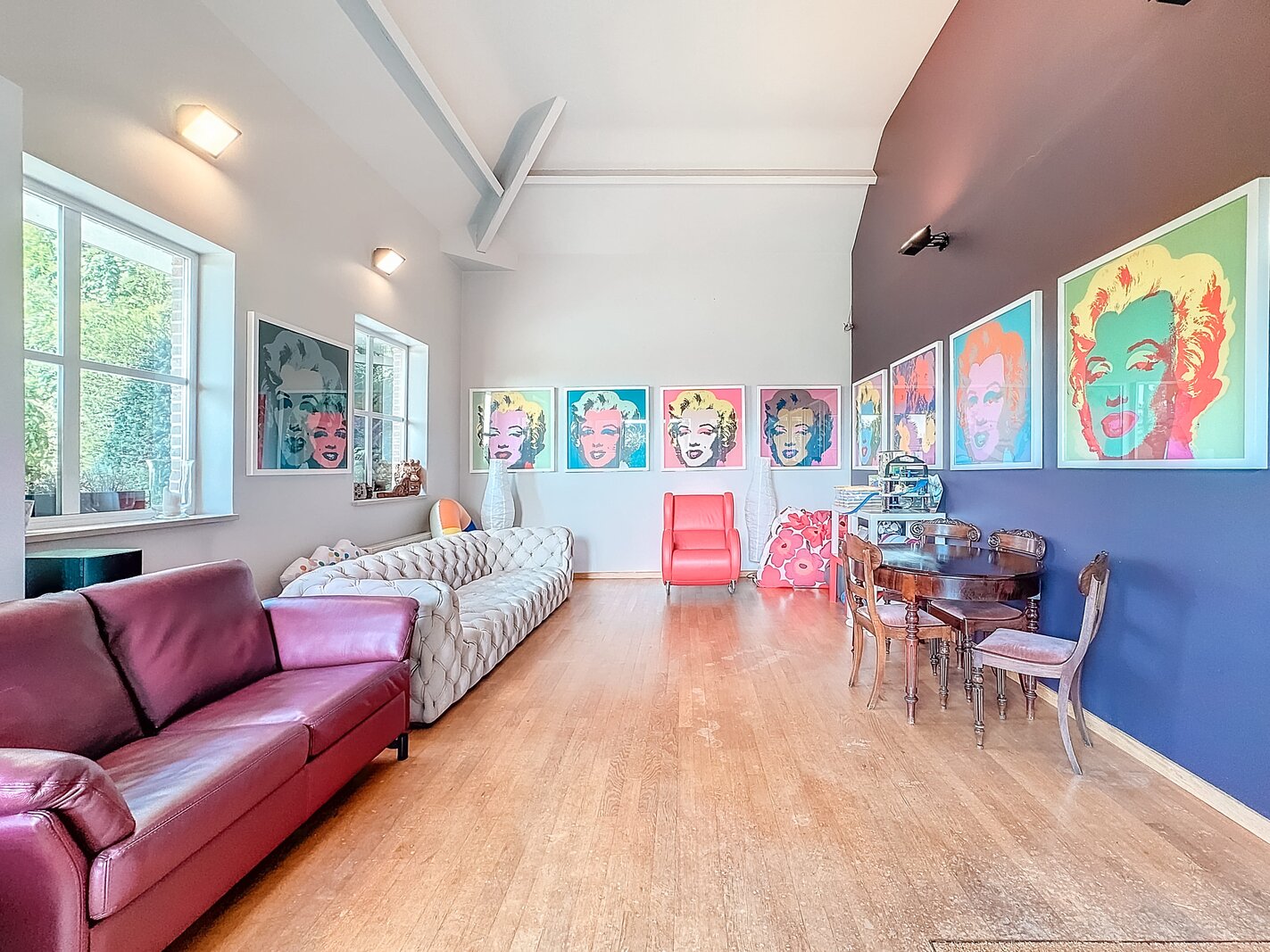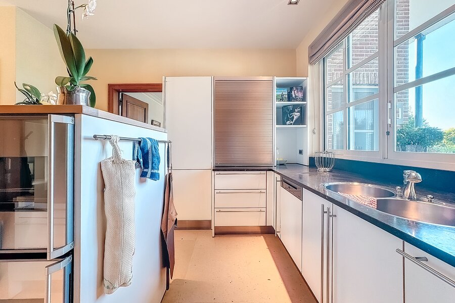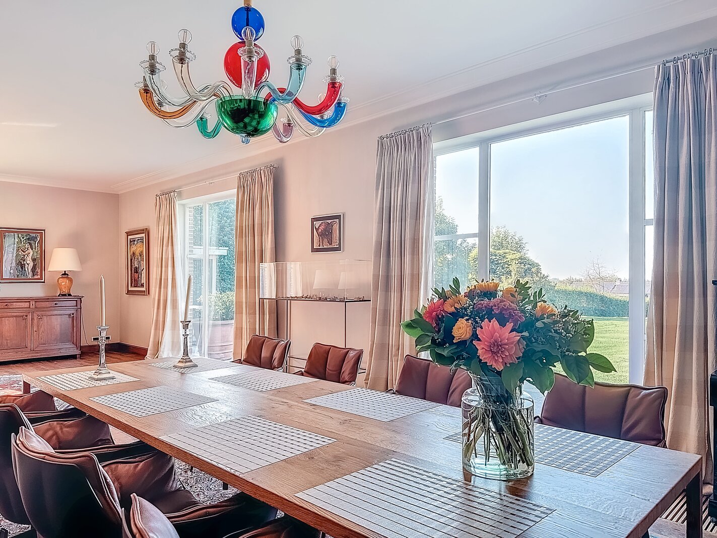 Op het gelijkvloers bevindt zich de impressionante inkomhal met authentieke Bourgondische hartsteen die toegang geeft tot de ruime L-vormige living met eetkamer (± 85 m²), voorzien van een functionele open haard. De Bulthaup-keuken met Gaggenau-toestellen heeft een centraal opbergeiland en een eethoek. Daarnaast is er een grote polyvalente ruimte met vide tot in de nokhoogte en een waskeuken met douche.