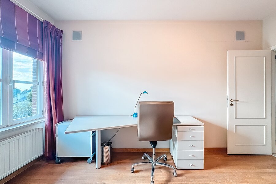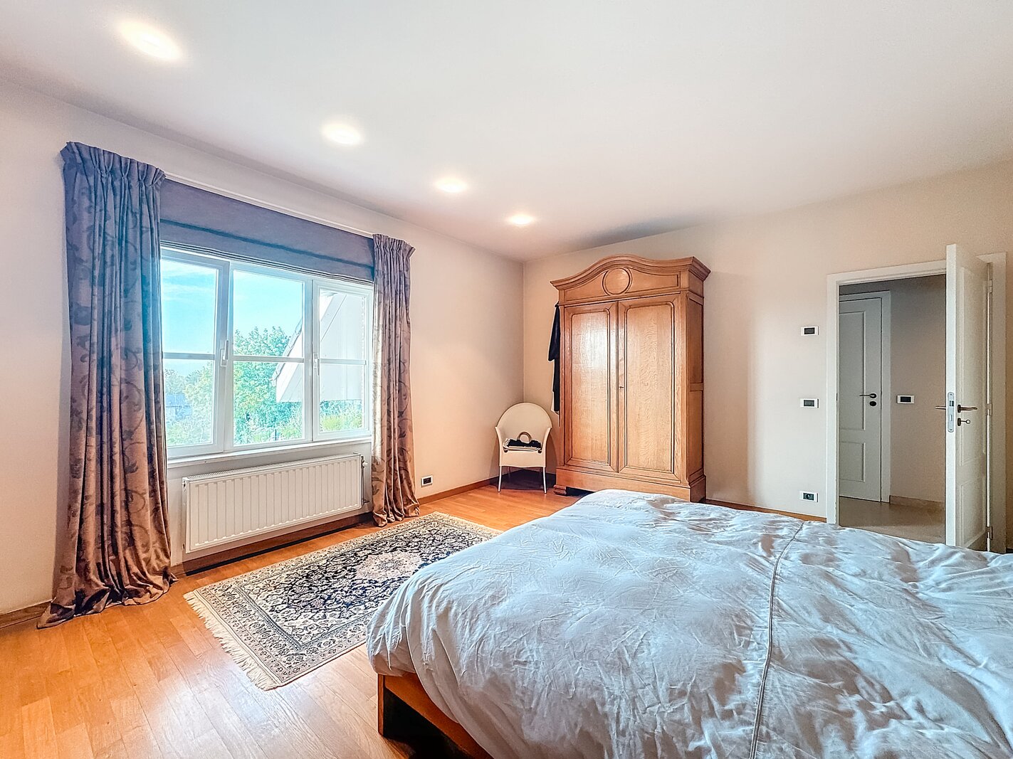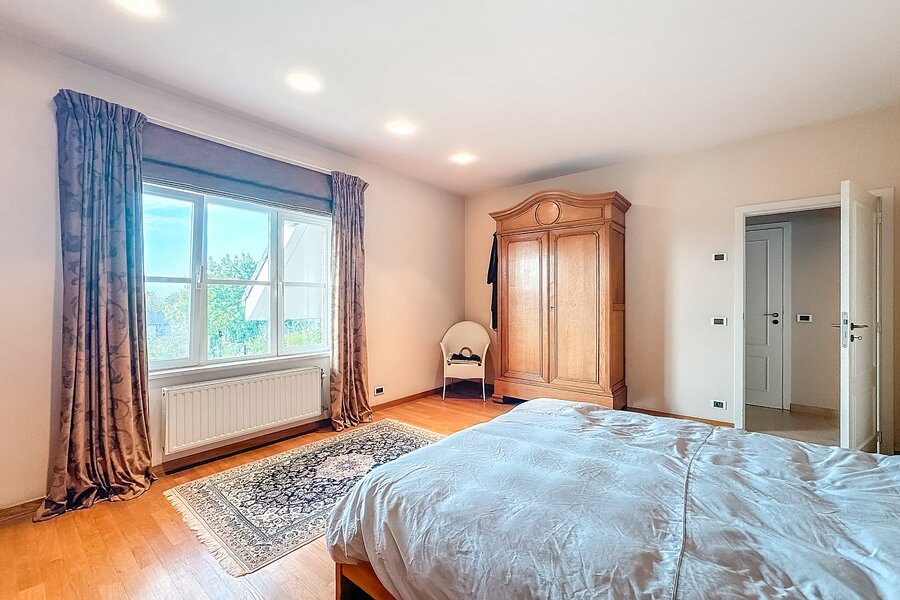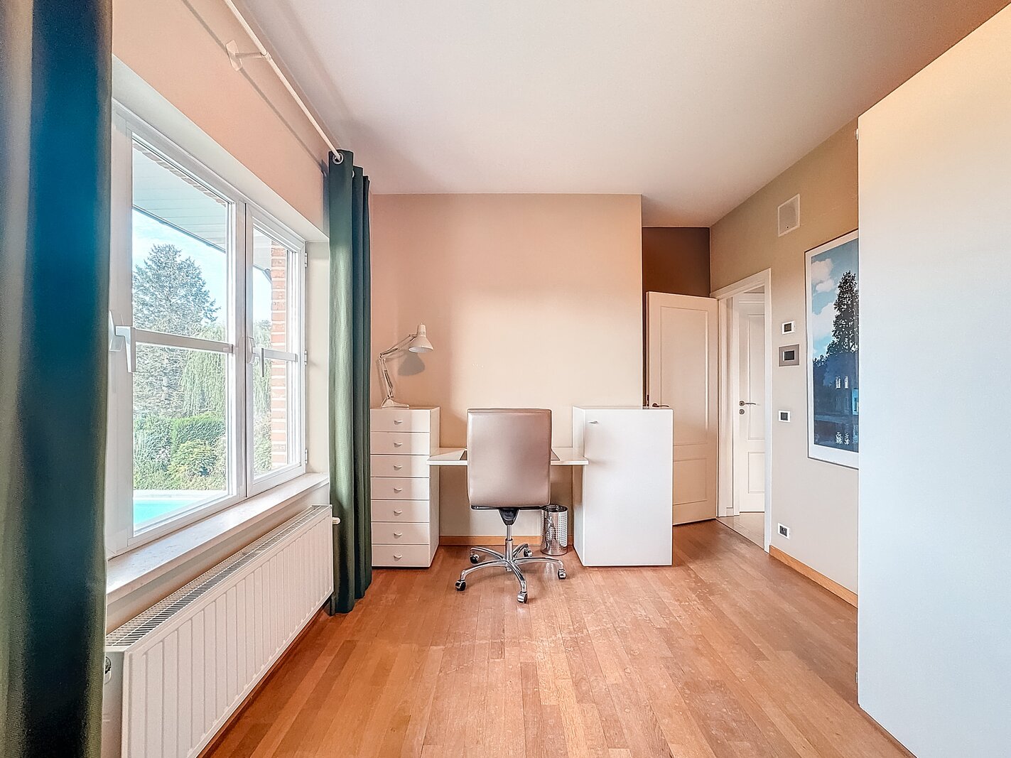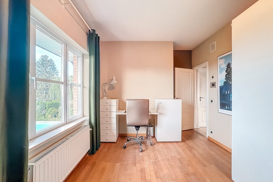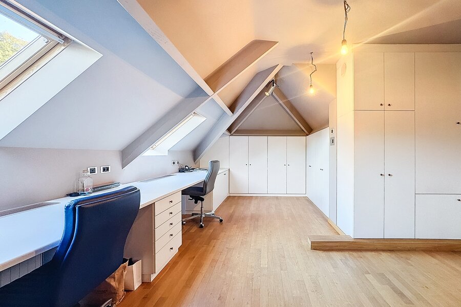 Op de eerste verdieping bevinden zich vier slaapkamers, een badkamer, een douchekamer en de master bedroom met en-suite badkamer en dressing. Een polyvalente ruimte, momenteel in gebruik als bureau, geeft via een vaste trap toegang tot de zolder, die nog verder kan worden ingericht.