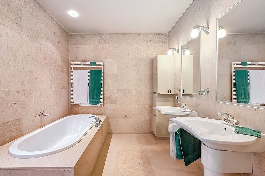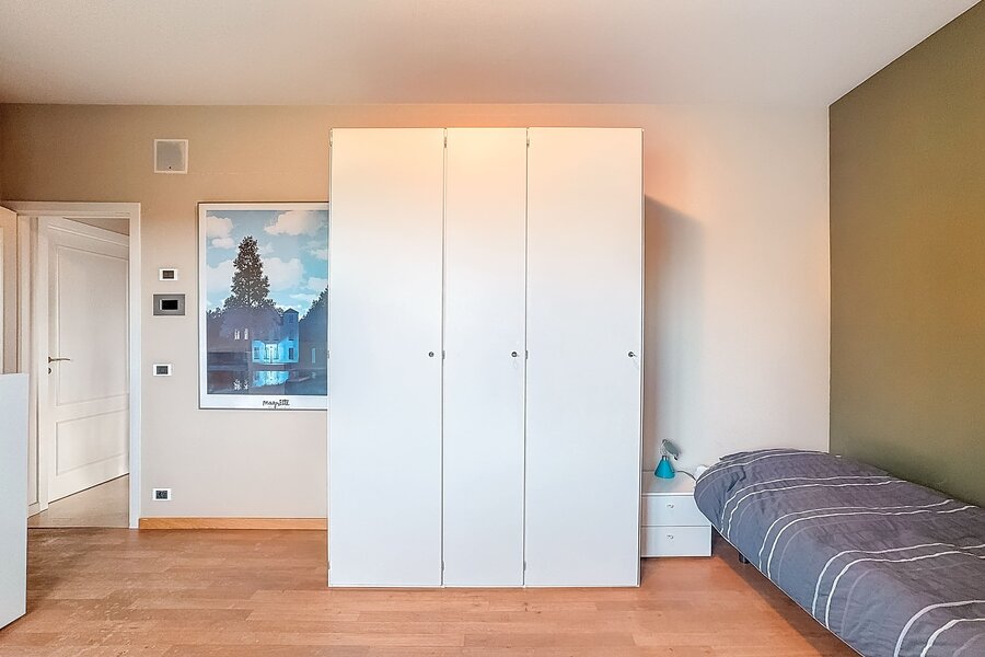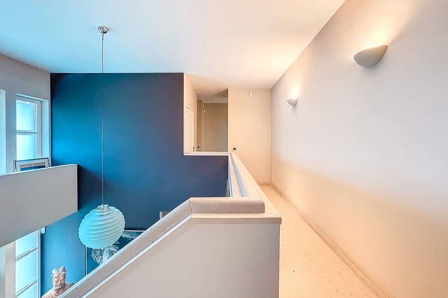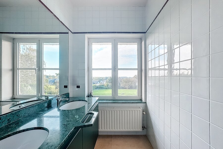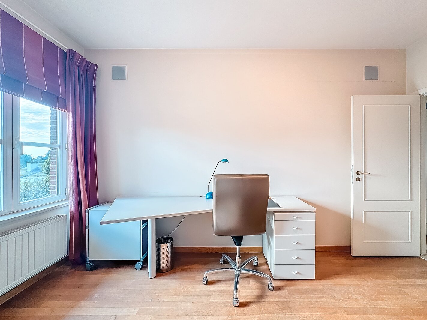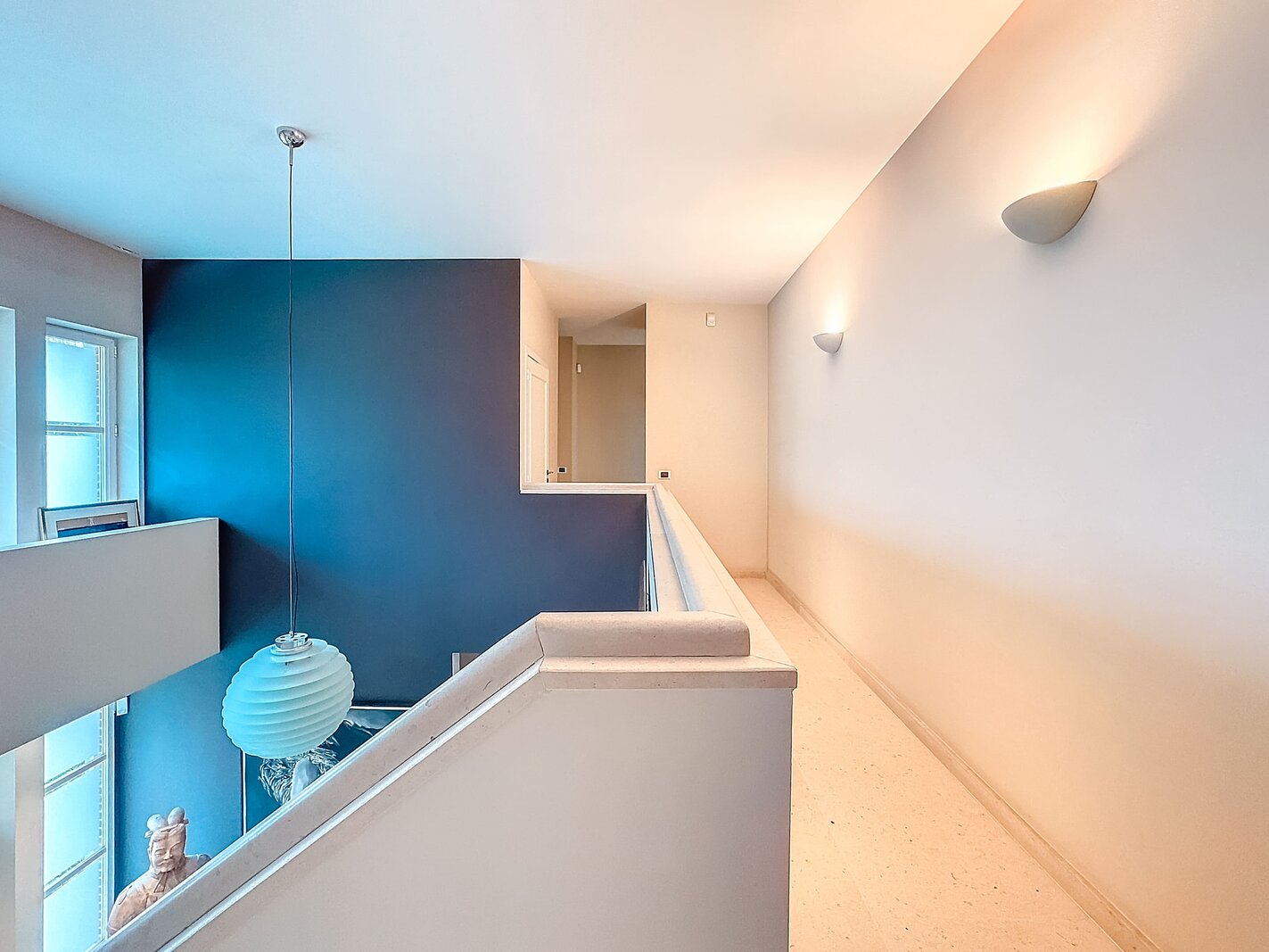 Op de eerste verdieping bevinden zich vier slaapkamers, een badkamer, een douchekamer en de master bedroom met en-suite badkamer en dressing. Een polyvalente ruimte, momenteel in gebruik als bureau, geeft via een vaste trap toegang tot de zolder, die nog verder kan worden ingericht.