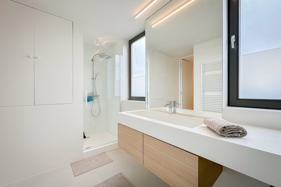 Indeling: De inkomhal leidt naar een gastentoilet. De open keuken, uitgerust met alle comfort en een eethoek, gaat over in de woonkamer die uitkomt op een aangenaam terras. Aan de achterzijde, op dezelfde verdieping, bevindt zich de 1e slaapkamer met dressing en een aangrenzende badkamer met dubbele lavabo en ligbad. Er is ook een berging met aansluiting voor een wasmachine.