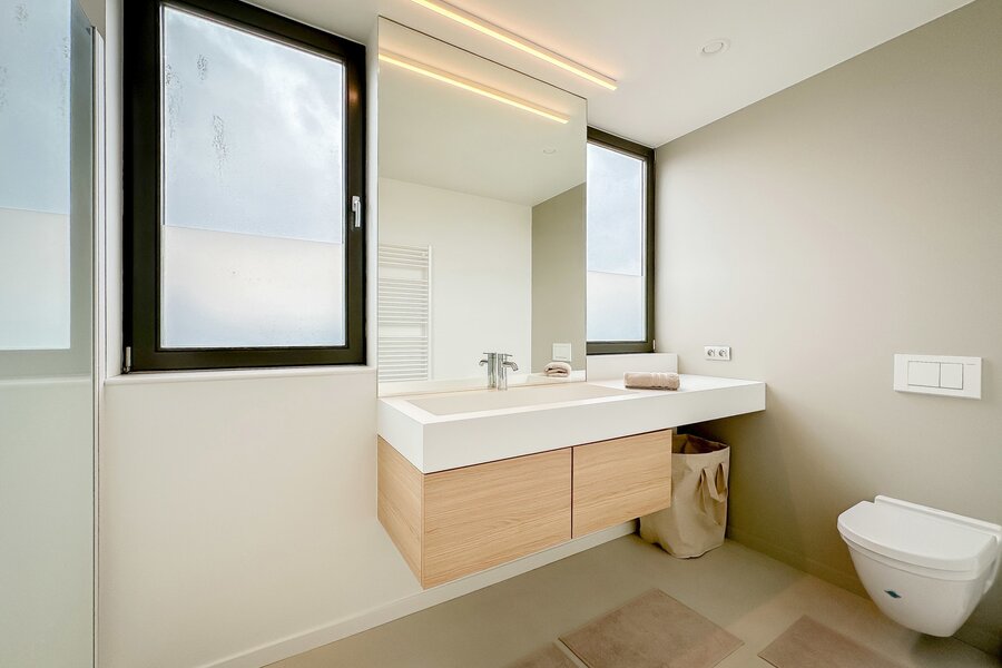 Op de bovenverdieping bevindt zich een ruime tweede slaapkamer met aangrenzende douchekamer en toilet. Deze tweede slaapkamer is 19m² groot en kan indien gewenst gebruikt worden als multifunctionele ruimte.