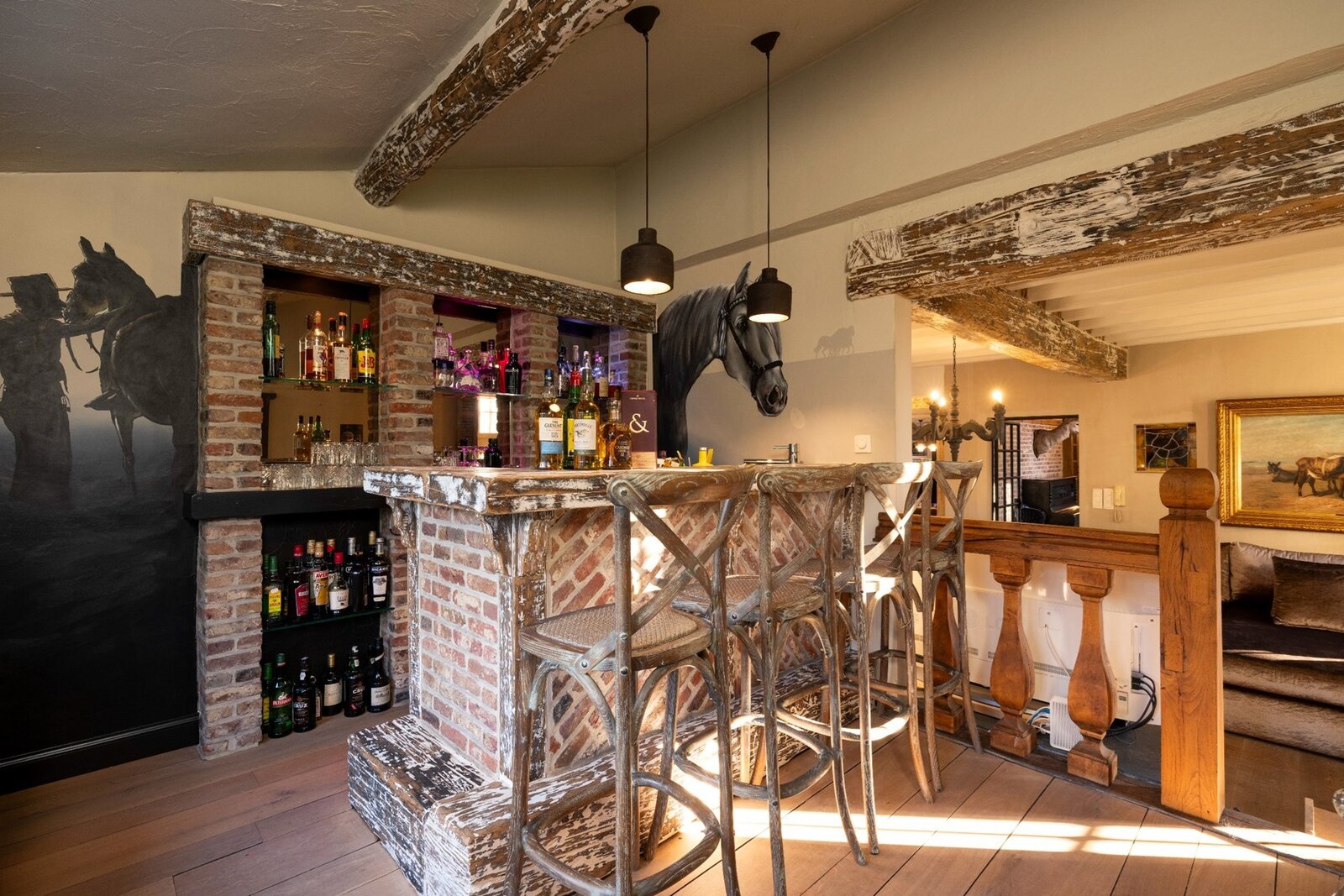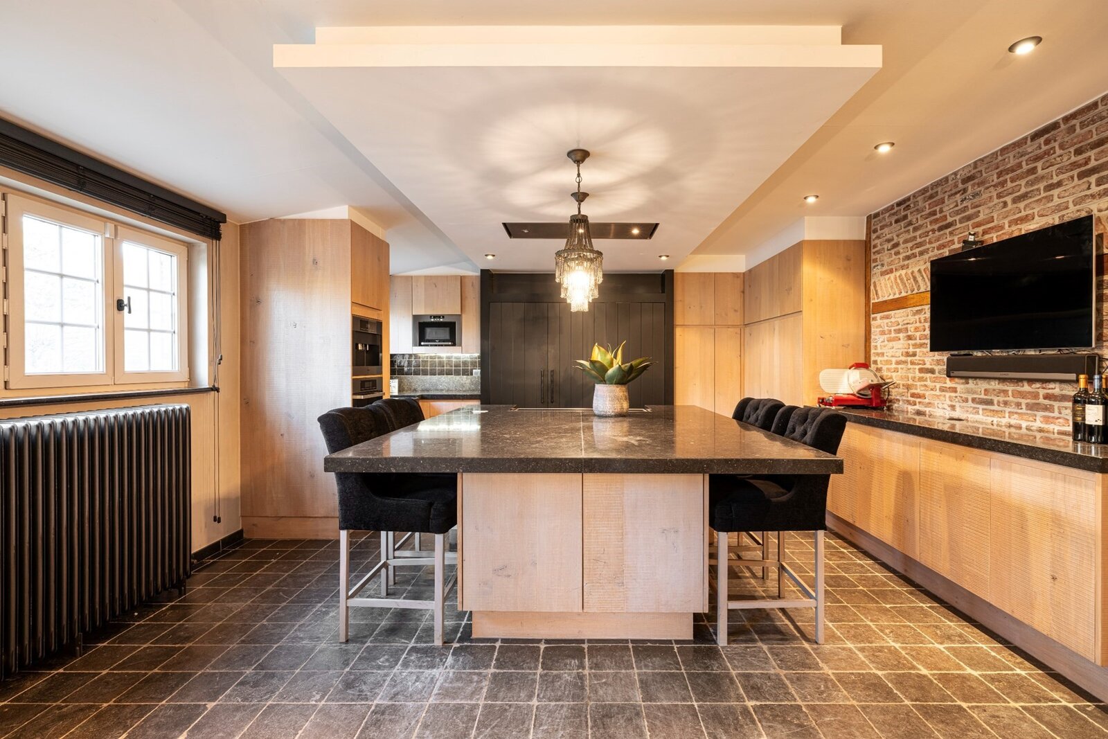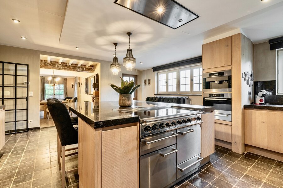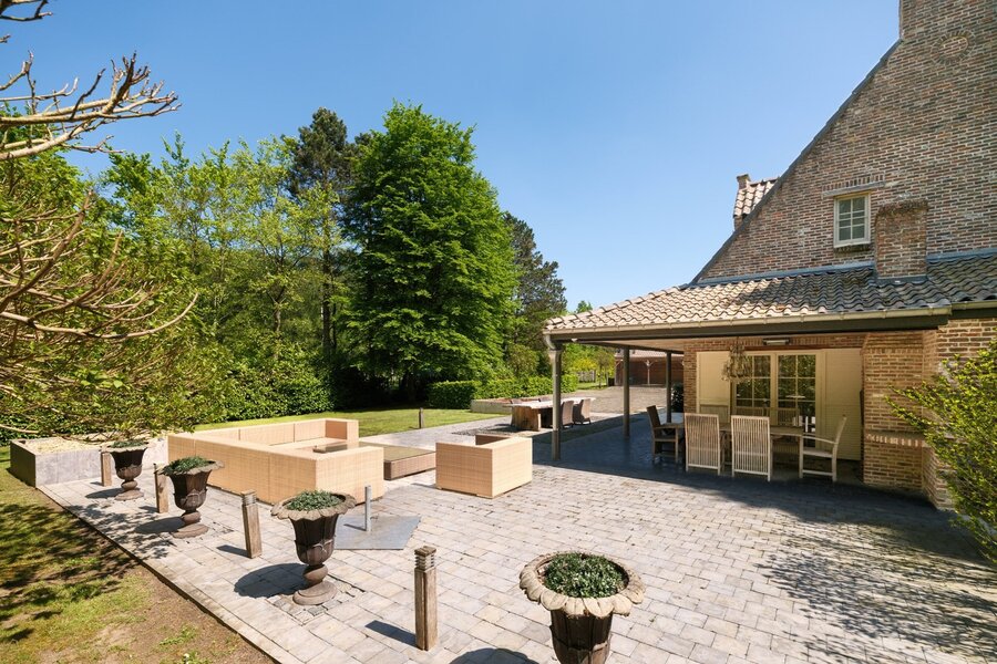 De statige oprijlaan leidt naar een elegante woning met een woonoppervlakte van 425 m², omringd door een zuidelijk georiënteerde tuin en volledig afgesloten voor optimale veiligheid. Binnen wacht een royale inkomhal met gastentoilet, een lichtrijke leefruimte met bar en eetkamer, een luxueuze keuken met Falcon fornuis en kookeiland, een aparte bureauruimte, wellnessruimte, wasplaats en bergruimte. Twee droge kelders waaronder een wijnkelder bieden extra opslagcapaciteit.