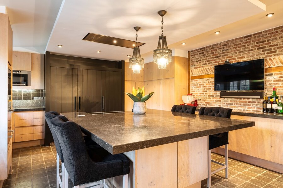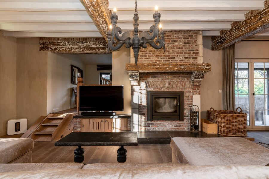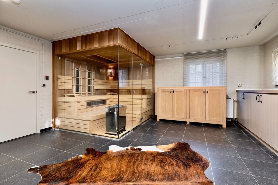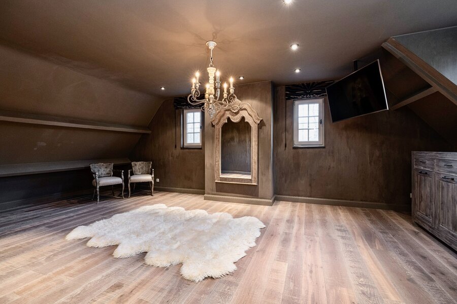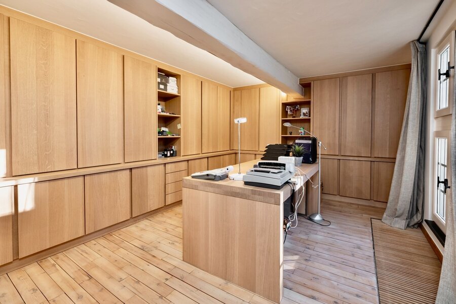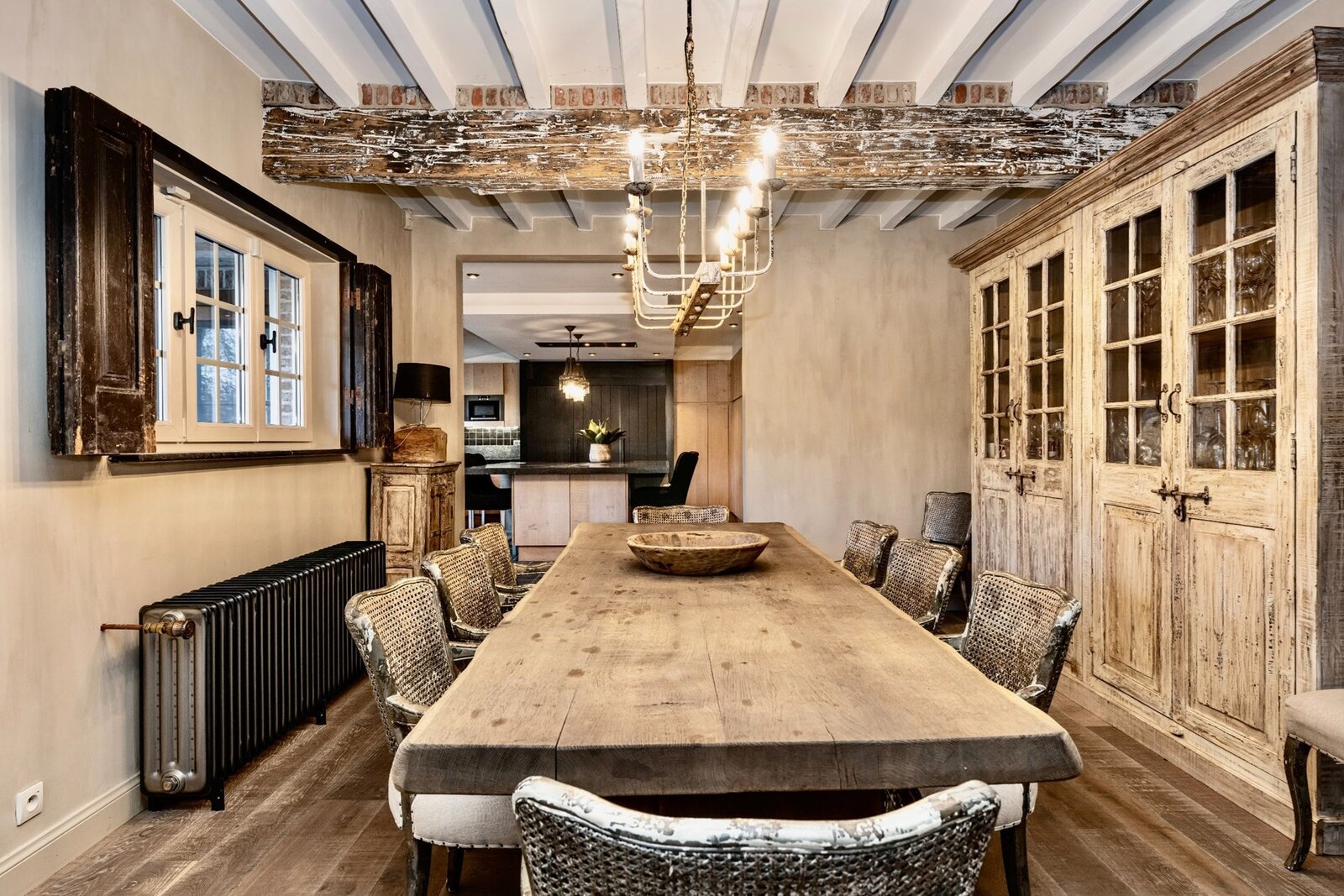 De statige oprijlaan leidt naar een elegante woning met een woonoppervlakte van 425 m², omringd door een zuidelijk georiënteerde tuin en volledig afgesloten voor optimale veiligheid. Binnen wacht een royale inkomhal met gastentoilet, een lichtrijke leefruimte met bar en eetkamer, een luxueuze keuken met Falcon fornuis en kookeiland, een aparte bureauruimte, wellnessruimte, wasplaats en bergruimte. Twee droge kelders waaronder een wijnkelder bieden extra opslagcapaciteit.