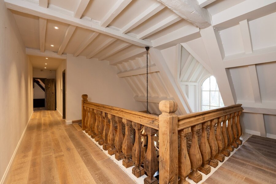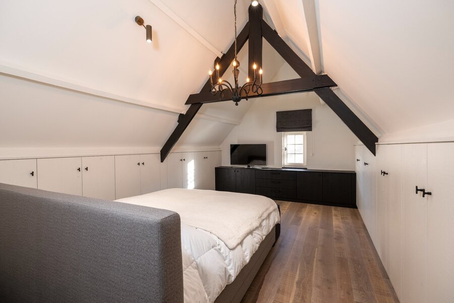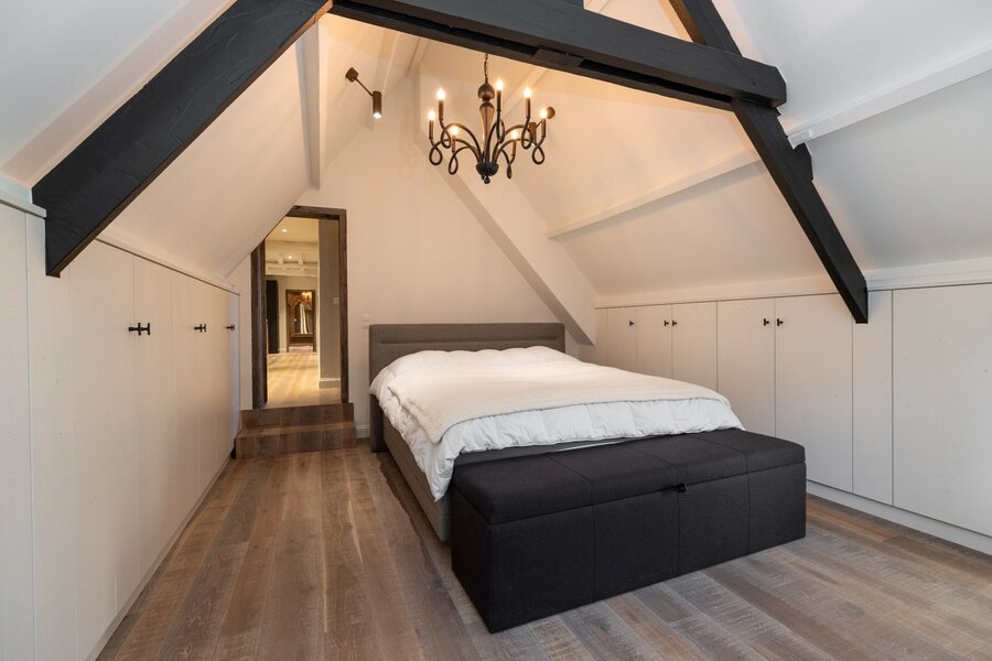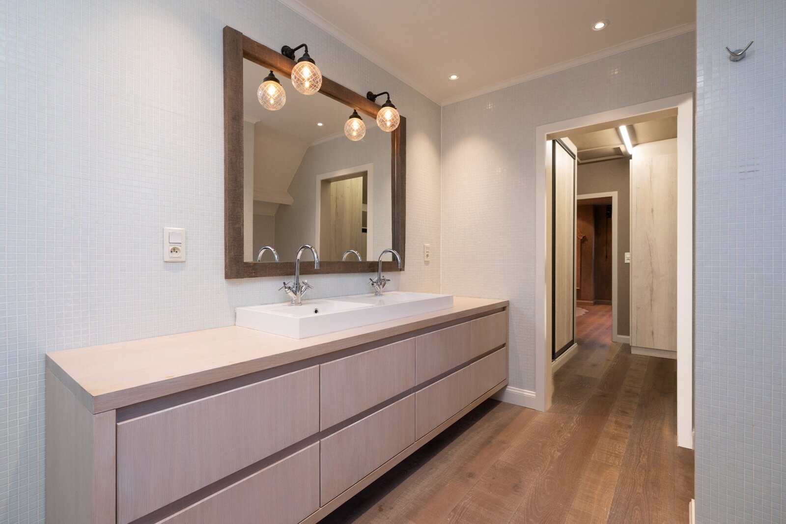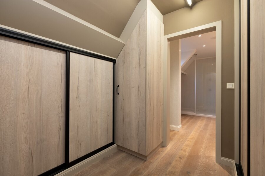 De verdieping telt drie ruime slaapkamers, waaronder een master suite met eigen badkamer en dressing. De andere kamers delen een tweede, volledig uitgeruste badkamer.
