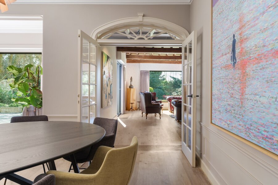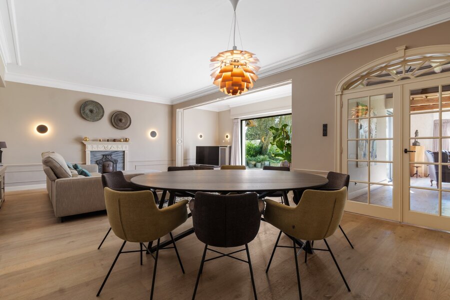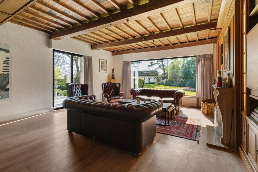 De leefruimtes baden in natuurlijk licht dankzij grote raampartijen en vloeien naadloos over in een volledig uitgeruste keuken op maat. Warme materialen, een sfeervolle doorkijkhaard en hoogwaardige afwerking zorgen voor een luxueus, huiselijk gevoel. De woning telt meerdere slaapkamers, een praktische bureauruimte en is perfect ingedeeld voor gezinnen of koppels die op zoek zijn naar ruimte en rust.