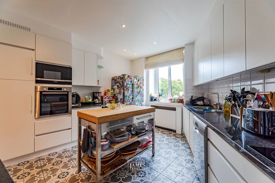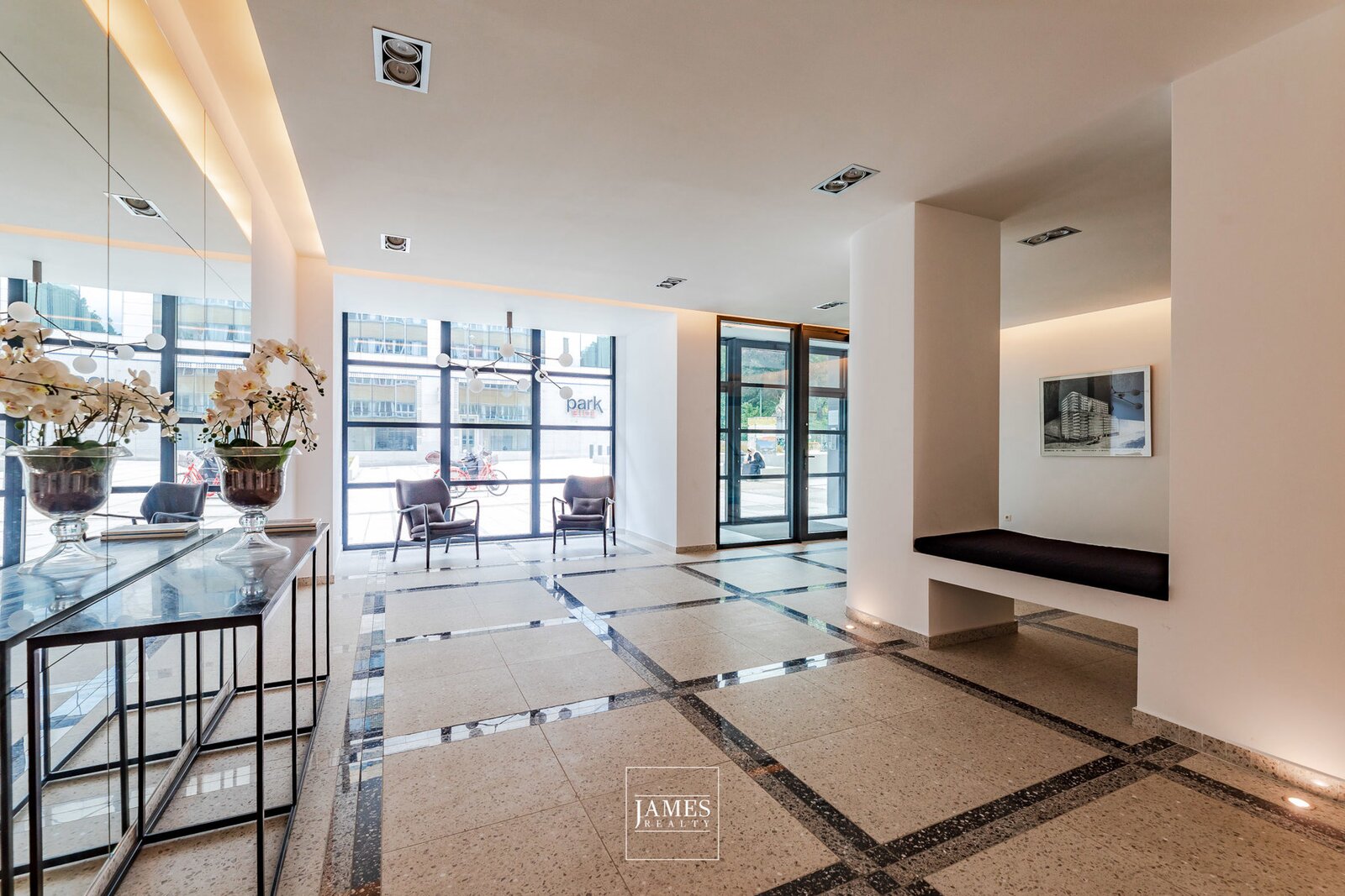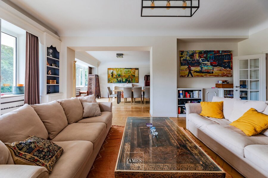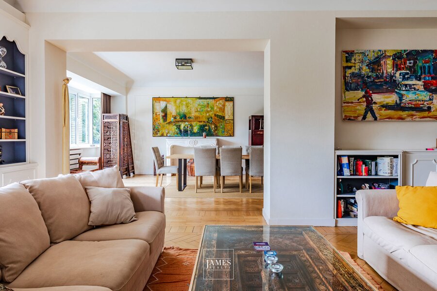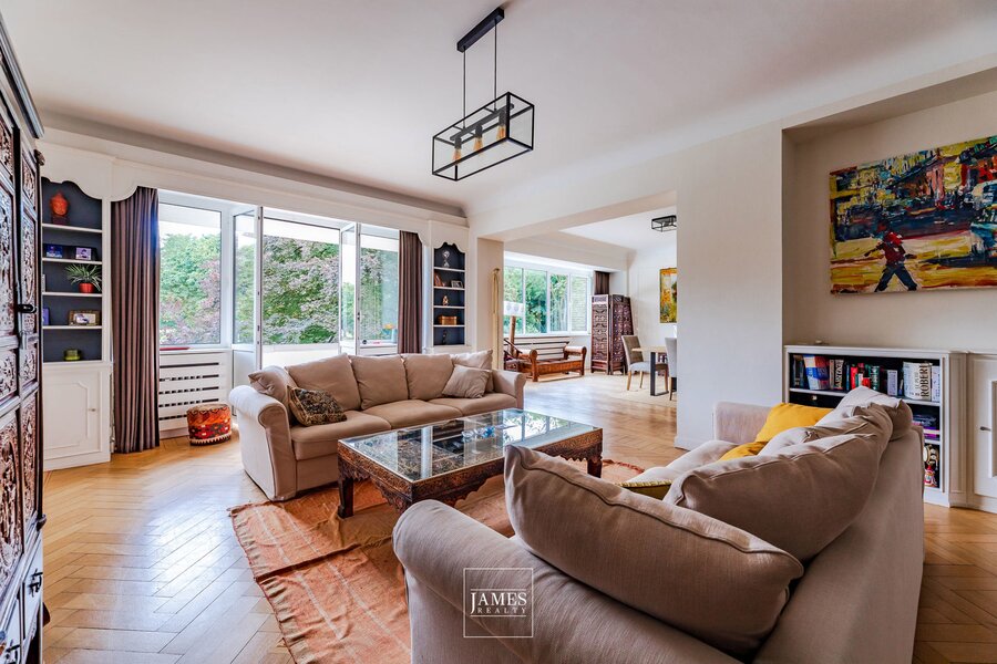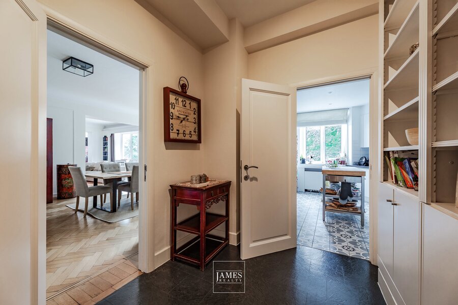 Het appartement bevindt zich op een hoge verdieping en bestaat uit een ruime hal die toegang geeft tot drie grote, lichte woonkamers met een adembenemend uitzicht op het park. De volledig uitgeruste keuken, met veel opbergruimte en een bijkeuken, is verbonden met een dienstlift, wat het dagelijks huishouden vergemakkelijkt.
