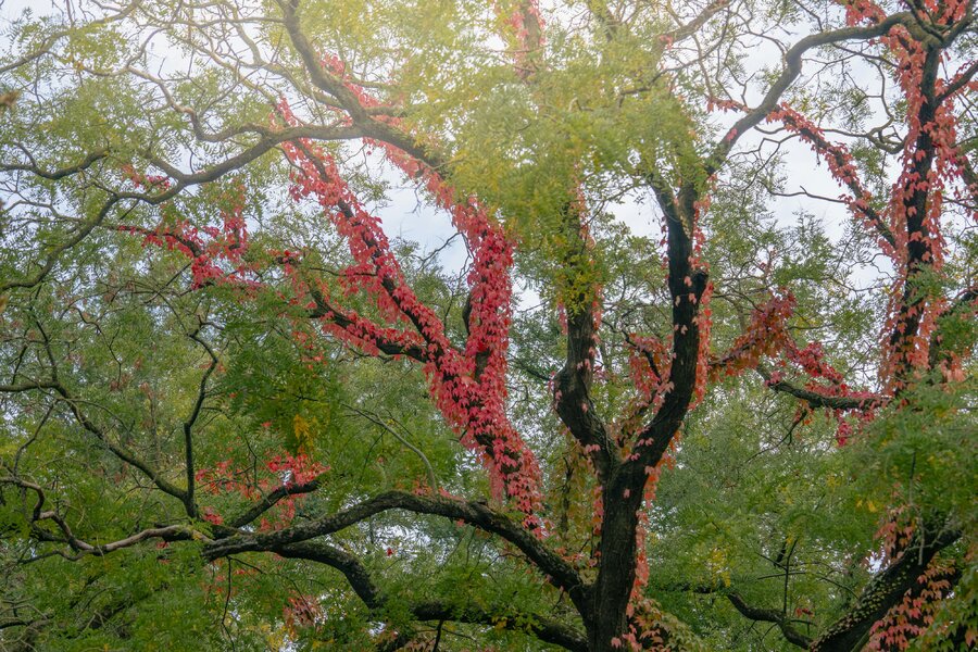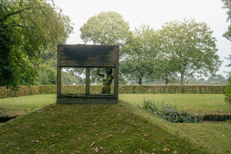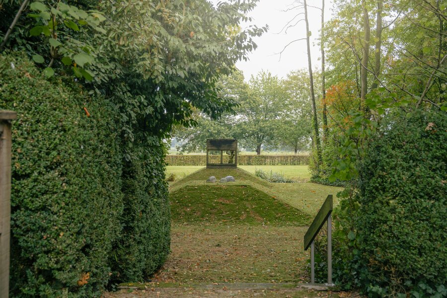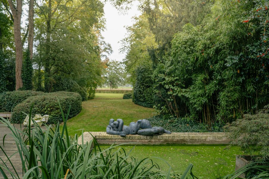 - uitgestrekte tuin met volgroeide bomen, struiken en natuurlijke vijver