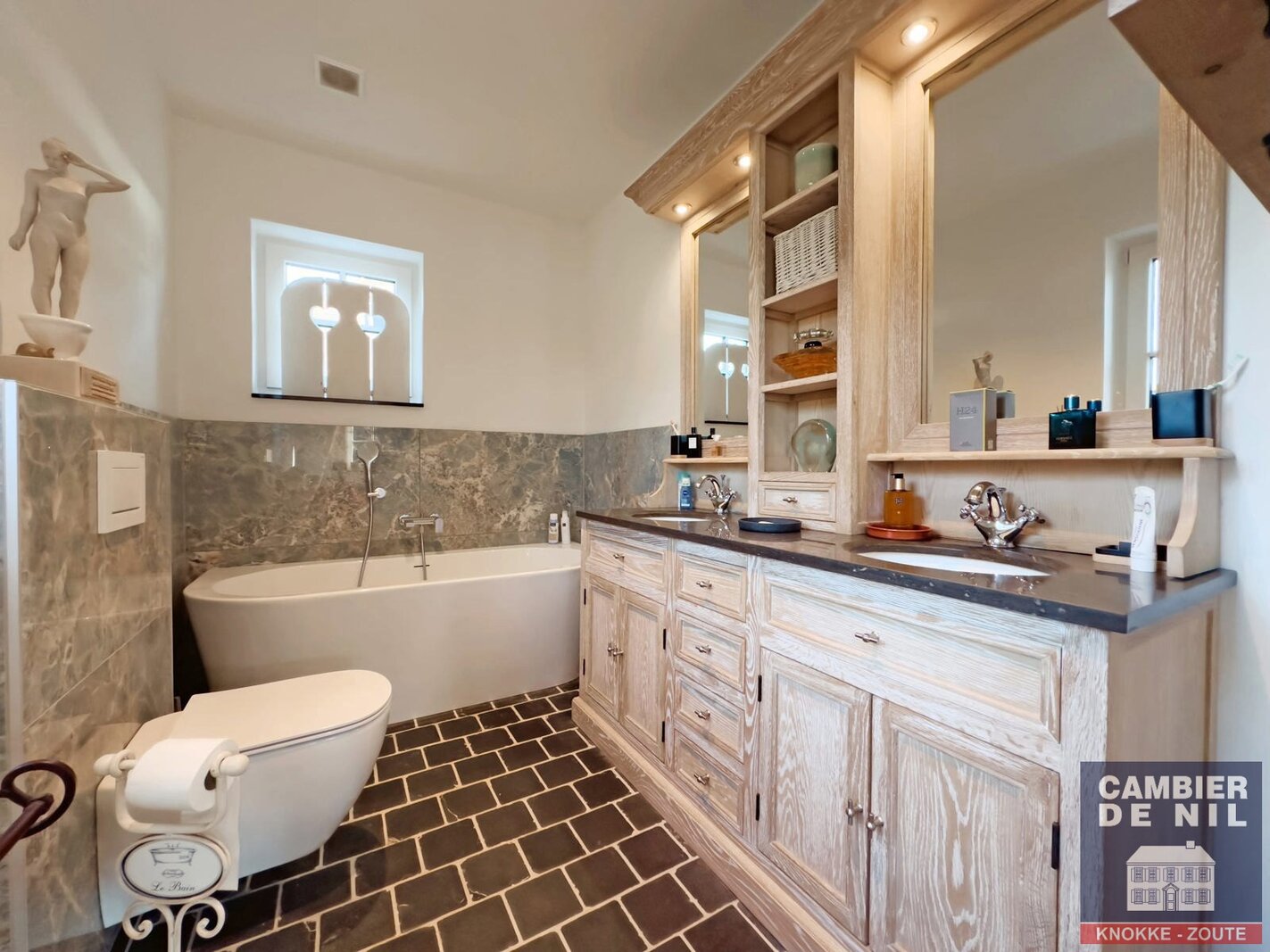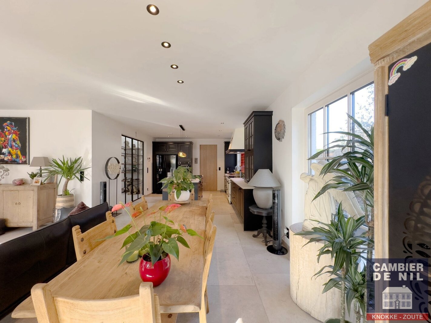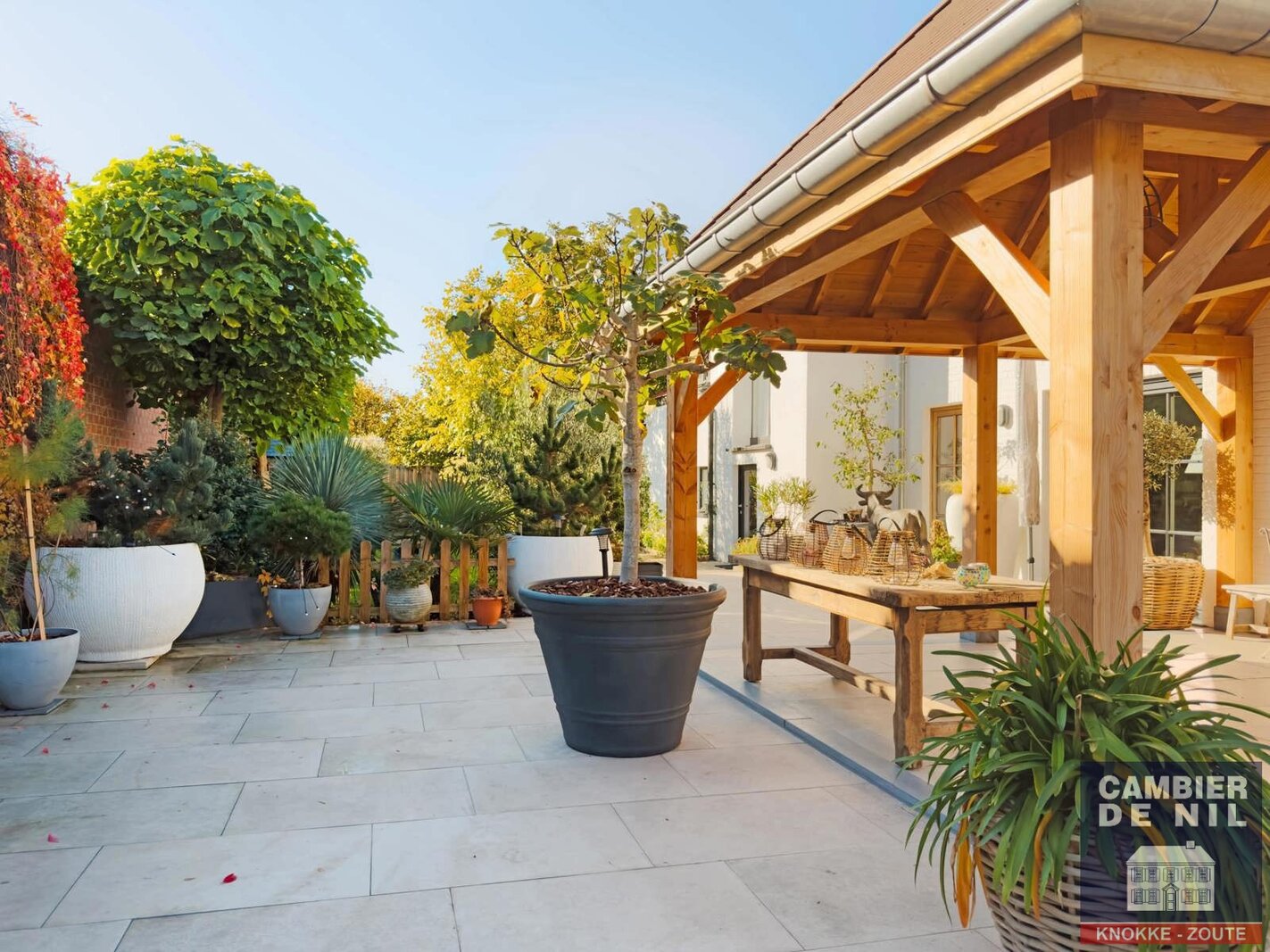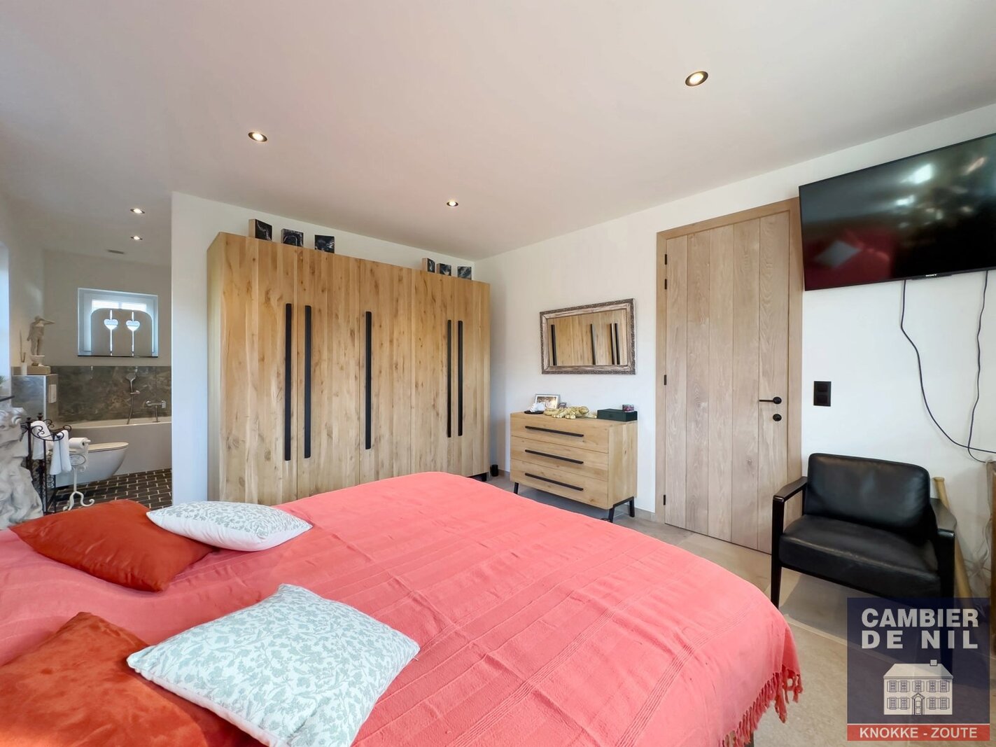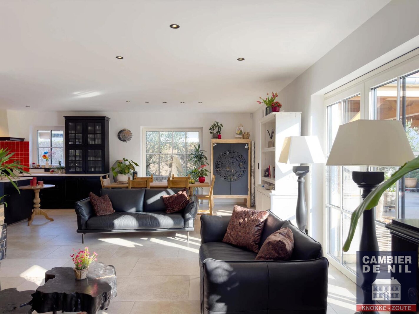 Indeling: Ruime inkomhal, gastentoilet en onmiddellijke toegang tot de open keuken en lichtrijke leefruimte. Doorlopende toegang tot de zongeoriënteerde tuin en overdekte terras. Masterbedroom op het gelijkvloers met ensuite badkamer (ligbad, dubbele lavabo en toilet). Verder is er een ruime was-en bergruimte.