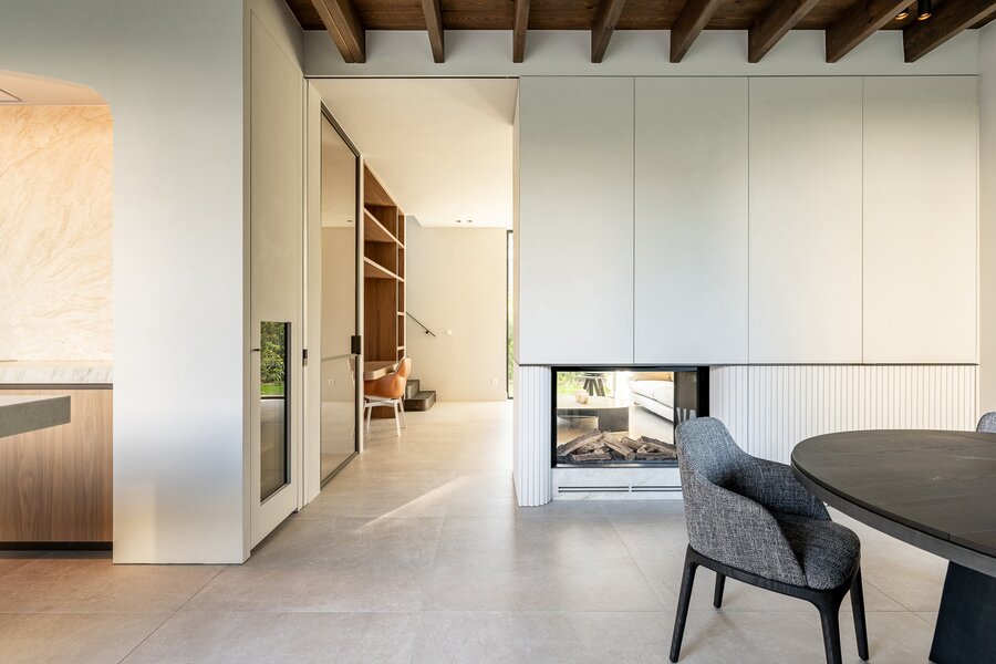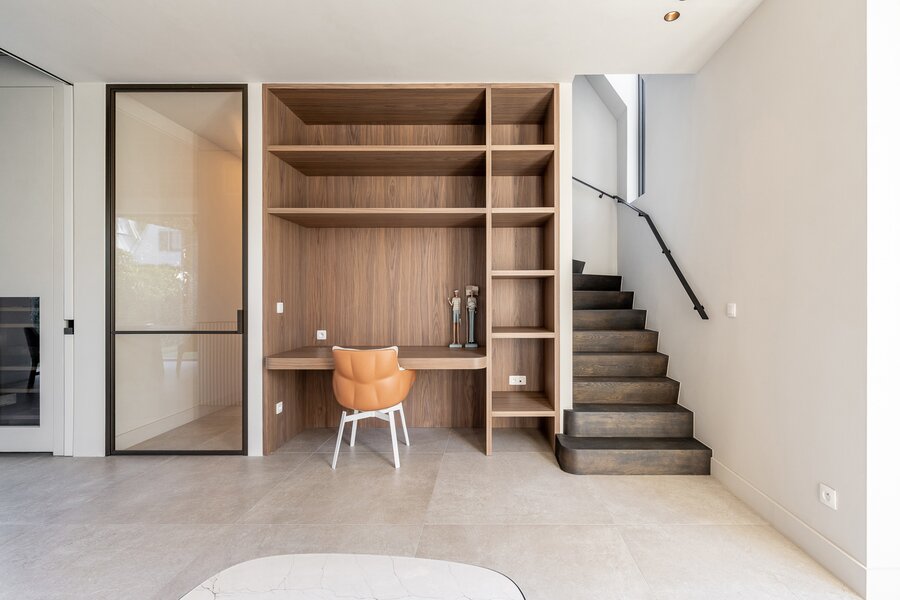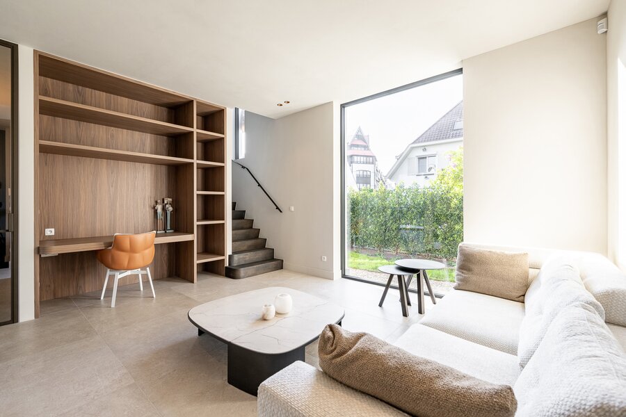 Indeling: inkomhal met vestiaire en gastentoilet, zeer aangename woonkamer met bureauhoek en gashaard, eetplaats en mooie leefkeuken die uitgeeft op een prachtig terras (zuid georiënteerd). Uitzonderlijke plafondhoogte op het gelijkvloers.