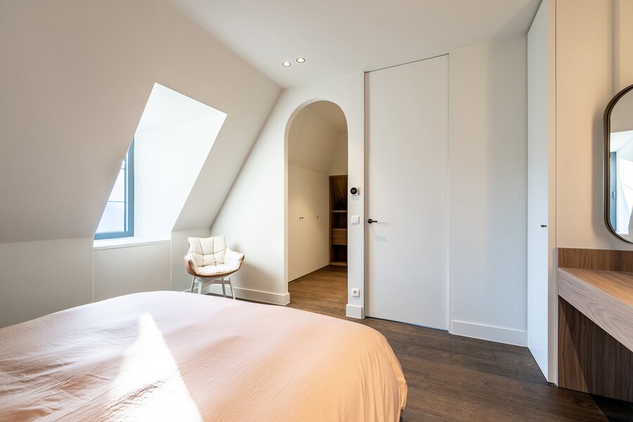 Op het eerste verdiep is de master bedroom met ingemaakte kasten en een dressing, een volledig uitgeruste badkamer met apart wc en een 2de ruime kamer.