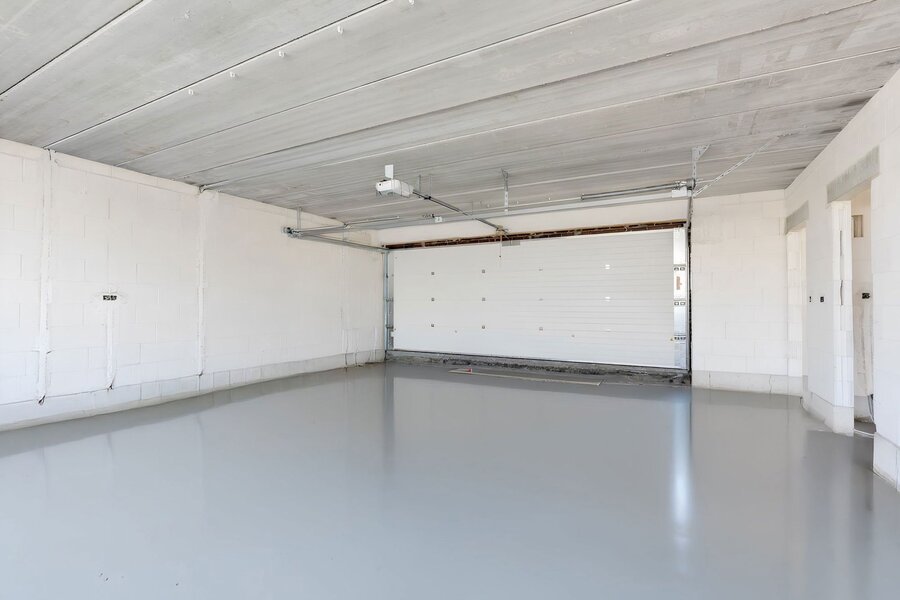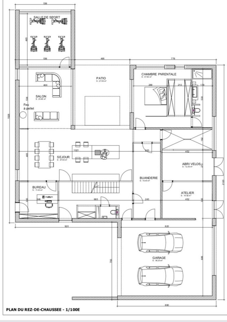 Het gelijkvloers bestaat uit een ruime woon-/eetkamer met open keuken van meer dan 70 m², een bureau, een fitnessruimte, een ouderlijke suite met dressingruimte en badkamer, een wasruimte, een atelier en een dubbele garage met elektrische poort.