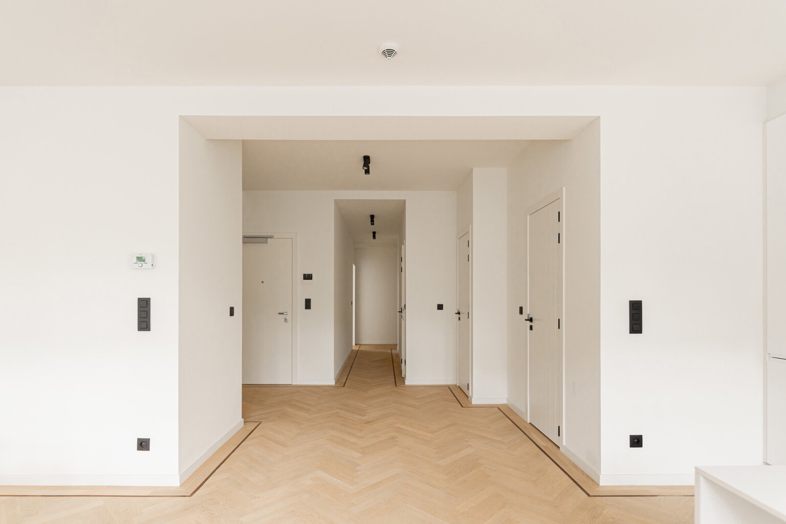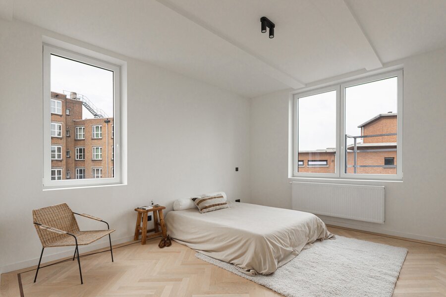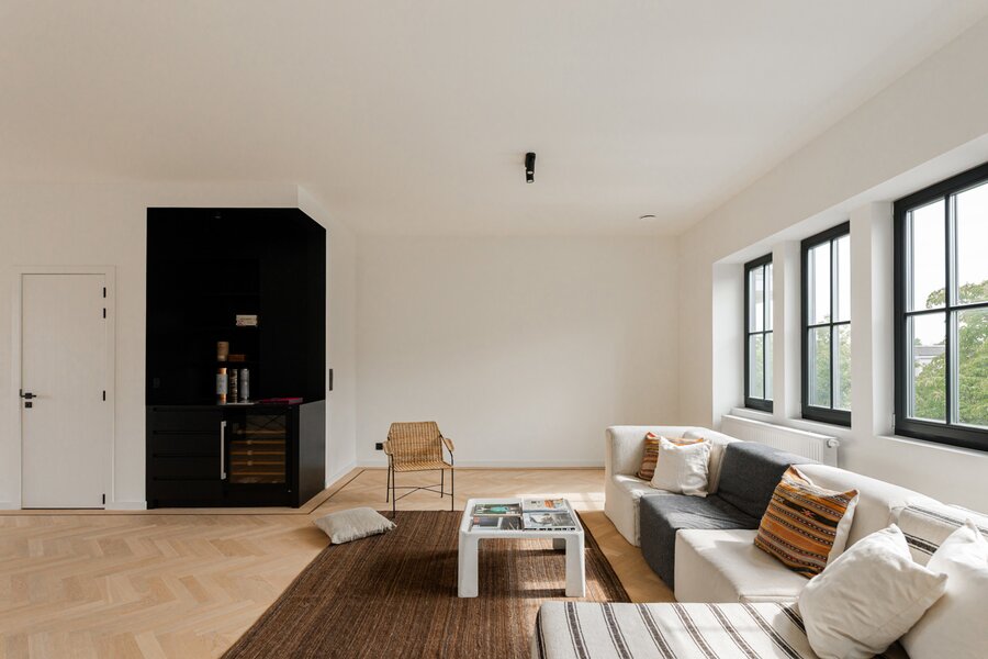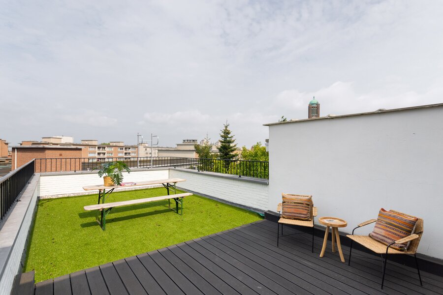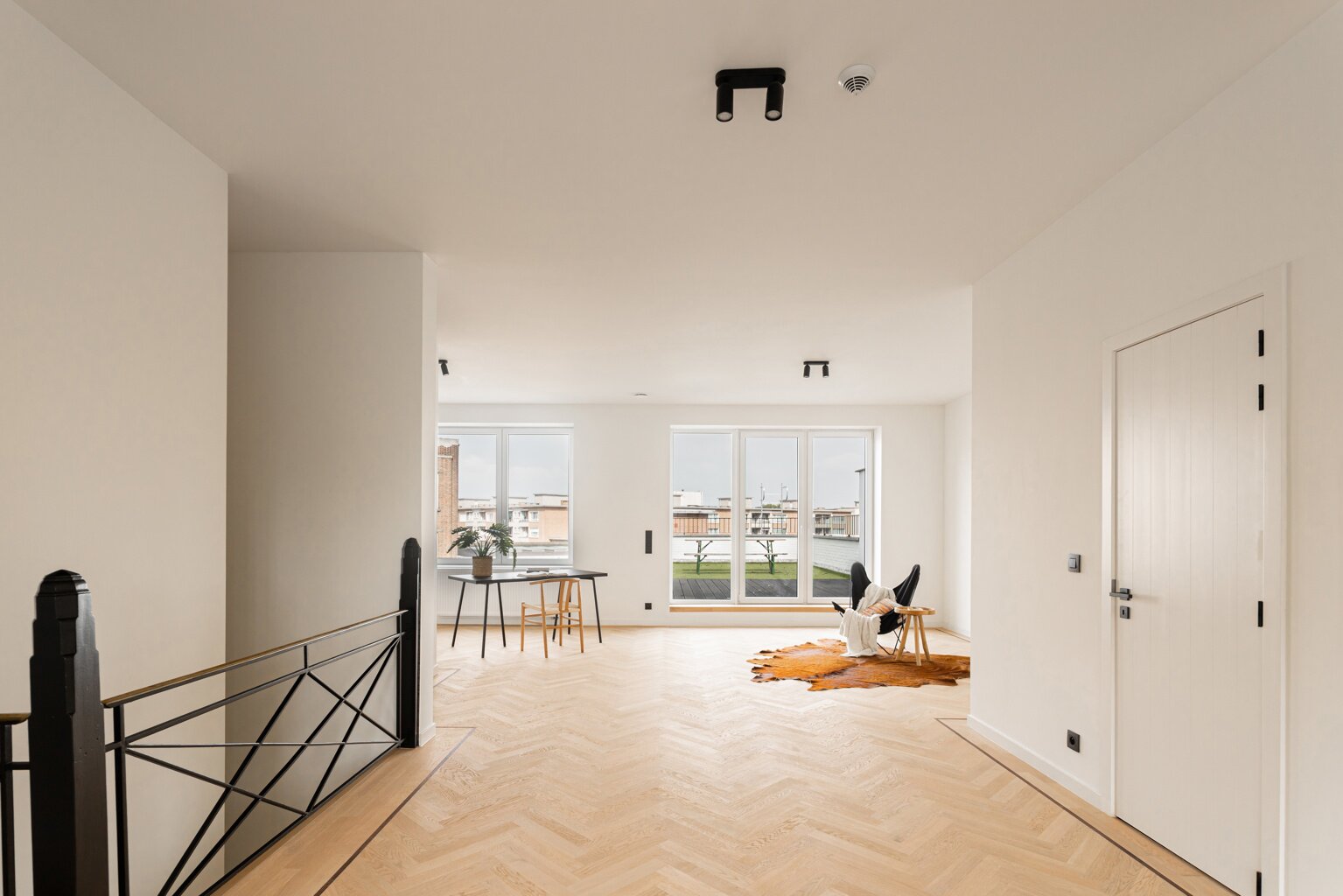 De duplex werd als volgt ingedeeld: via de inkomhal met veiligheidsdeur kom je in de ruime, open leefruimte, waar de keuken met kookeiland en moderne inbouwapparatuur naadloos overgaat in het salon. Fraai eikenhouten visgraatparket met bies geeft een warme uitstraling. Ook op deze verdieping: drie ruime slaapkamers en twee badkamers. De bovenste verdieping: royale tweede living met cocktail corner, ingebouwde wijnklimaatkast en gastentoilet. Openslaande deuren leiden naar het dakterras, de perfecte plek om te genieten van de zon en een gezellige apero of diner. De kelder zit alvast mee in het pakket. Wie wil, kan ook nog een garage aankopen aan de overkant van de straat.