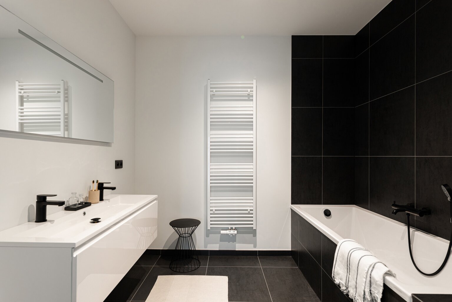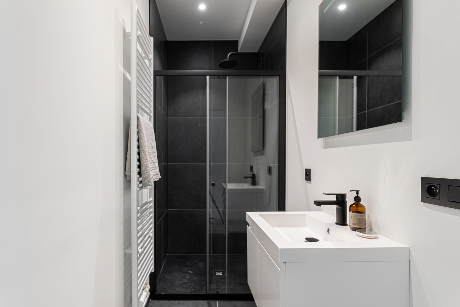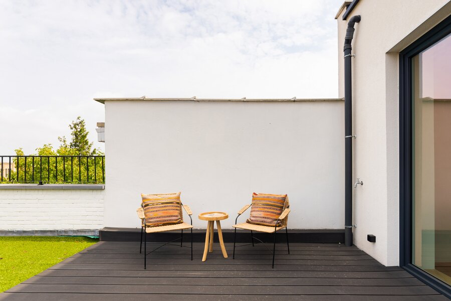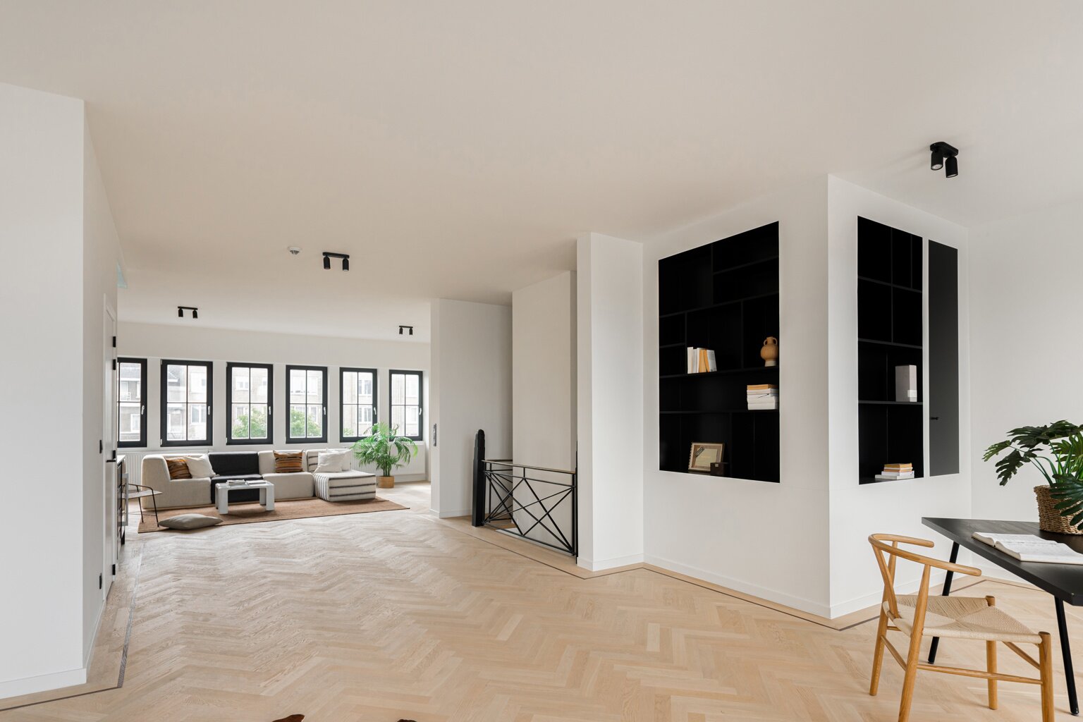 De duplex werd als volgt ingedeeld: via de inkomhal met veiligheidsdeur kom je in de ruime, open leefruimte, waar de keuken met kookeiland en moderne inbouwapparatuur naadloos overgaat in het salon. Fraai eikenhouten visgraatparket met bies geeft een warme uitstraling. Ook op deze verdieping: drie ruime slaapkamers en twee badkamers. De bovenste verdieping: royale tweede living met cocktail corner, ingebouwde wijnklimaatkast en gastentoilet. Openslaande deuren leiden naar het dakterras, de perfecte plek om te genieten van de zon en een gezellige apero of diner. De kelder zit alvast mee in het pakket. Wie wil, kan ook nog een garage aankopen aan de overkant van de straat.