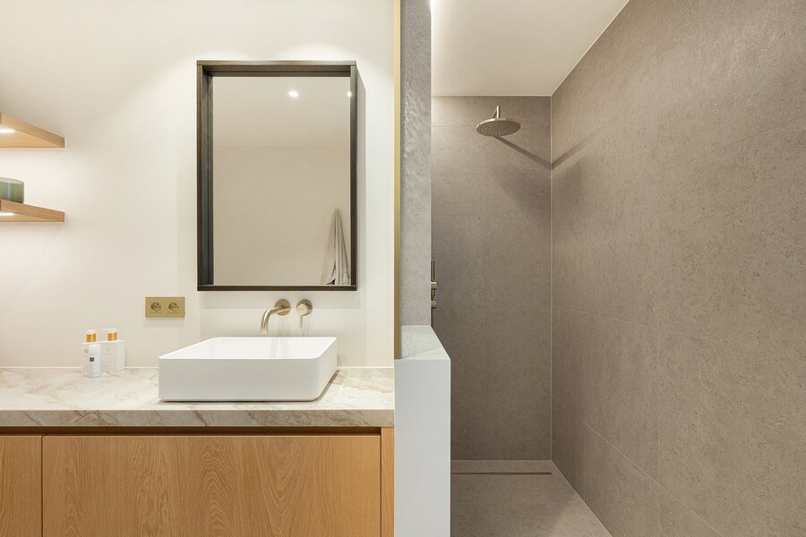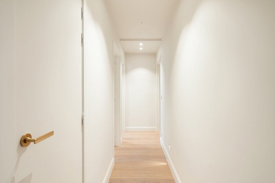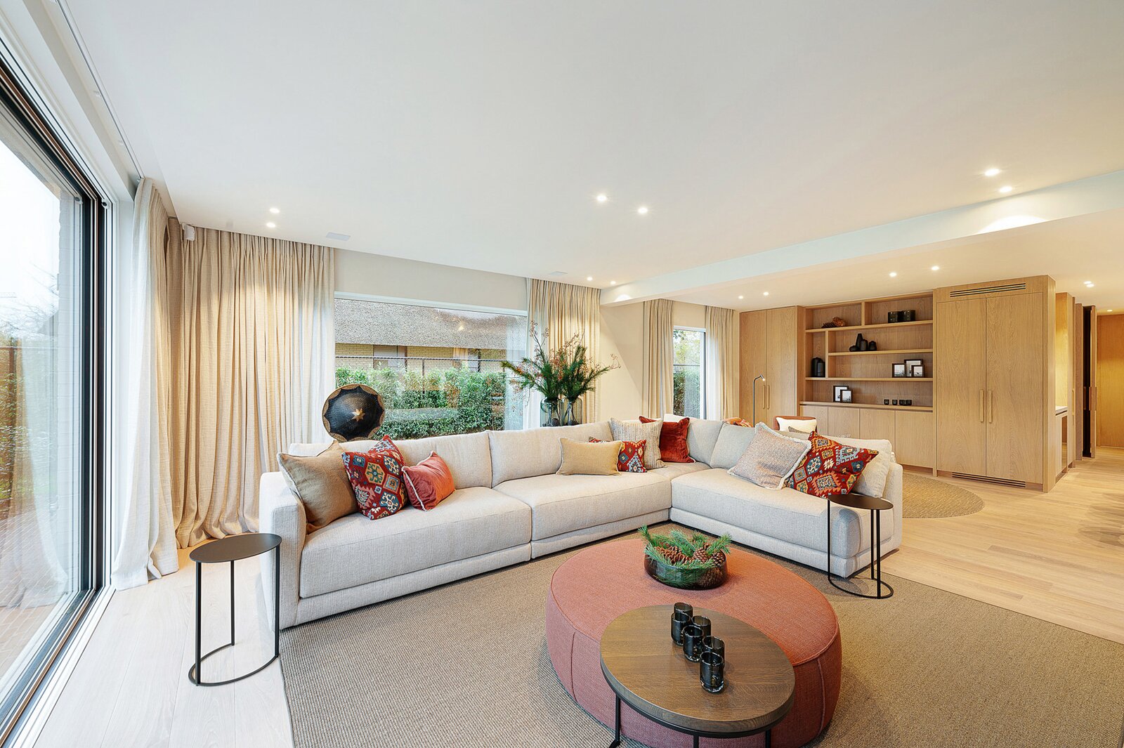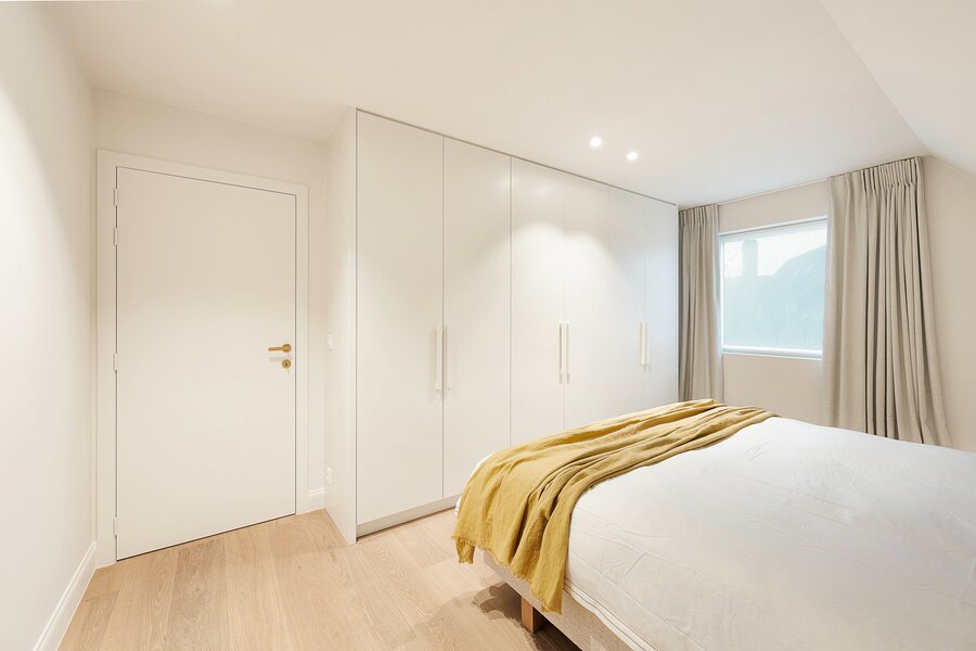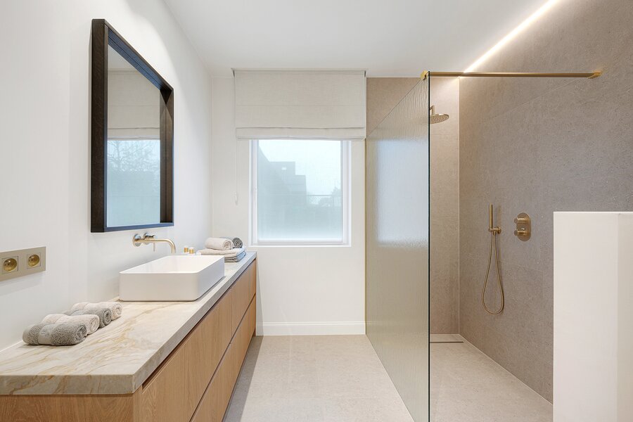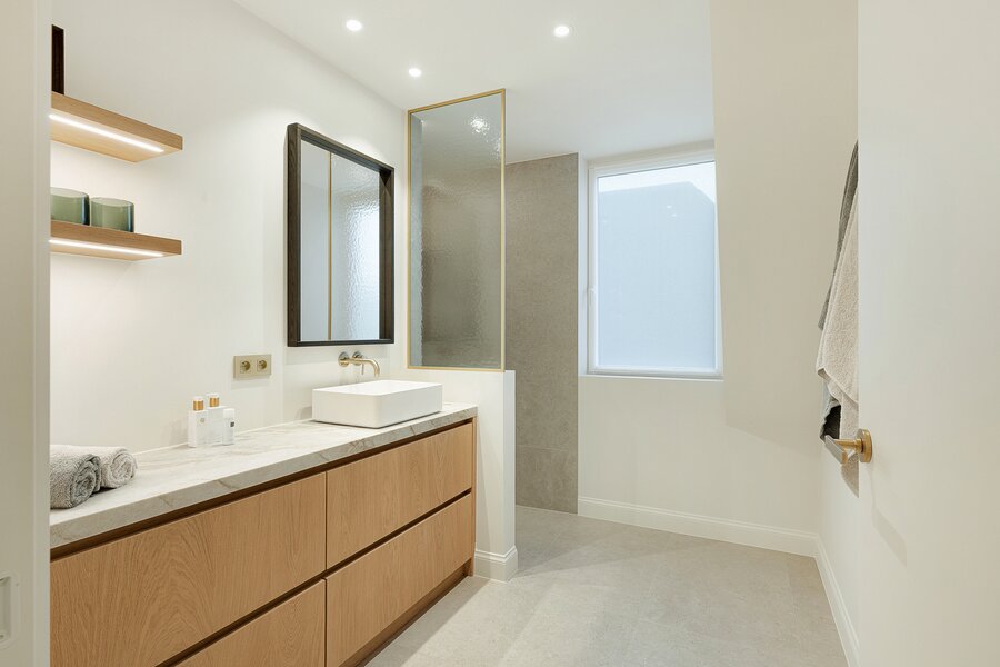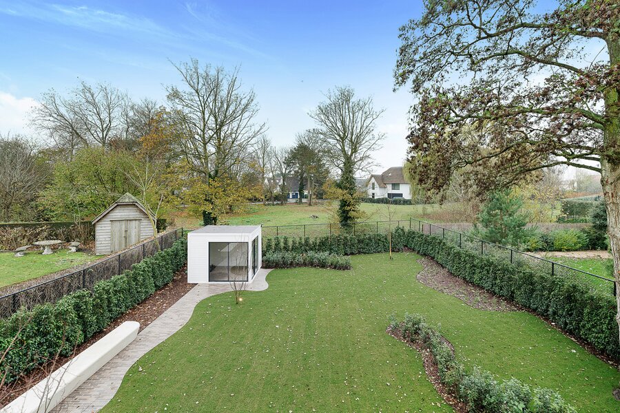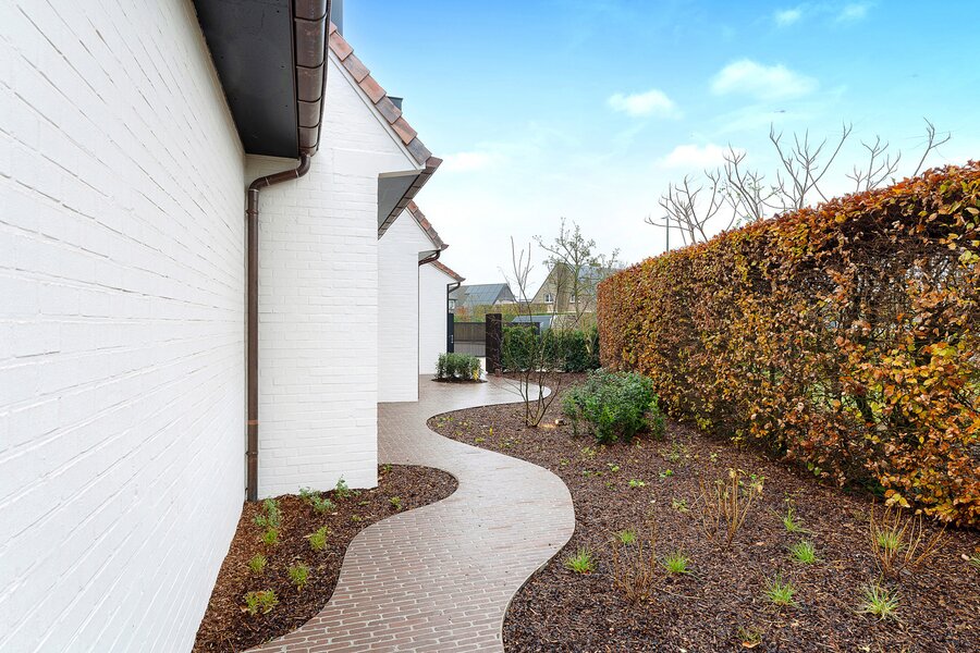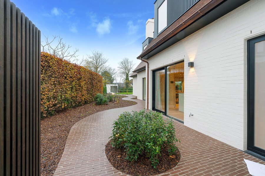 De woning werd hoogwaardig vernieuwd en afgewerkt volgens de hoogste normen, met een sterke focus op licht, ruimte en kwaliteit. Een elegante inkomhal met gastentoilet en uitgebreide maatwerkvestiaire leidt naar de leefruimtes, die dankzij grote raampartijen en minimal windows baden in natuurlijk licht en een mooi zicht bieden op de zuidwestgerichte tuin. De leefruimte omvat een stijlvolle zithoek met gashaard en maatwerk tv-wand in fineer eik, een aparte eetruimte en een volledig uitgeruste designkeuken met hoogwaardige Miele-toestellen en wijnkoeler.