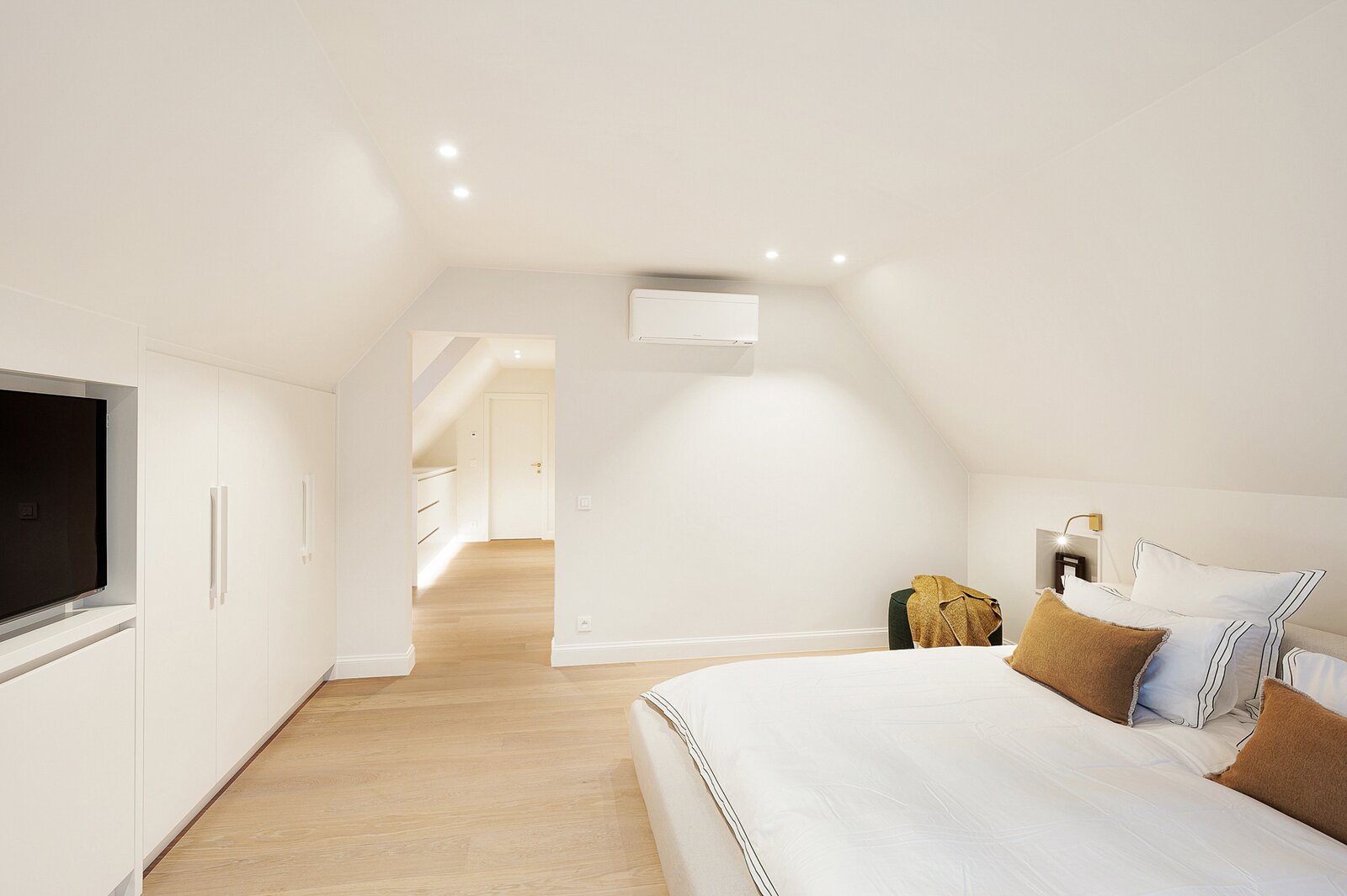 De bovenverdieping herbergt vier ruime slaapkamers en drie badkamers, waaronder een royale master suite met dressing en luxueuze badkamer. Verder beschikt de woning over een dubbele garage, wasplaats met maatwerk kasten en moderne technieken zoals vloerverwarming via warmtepomp en airconditioning.