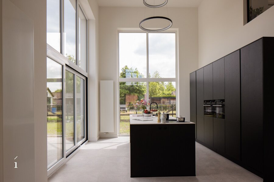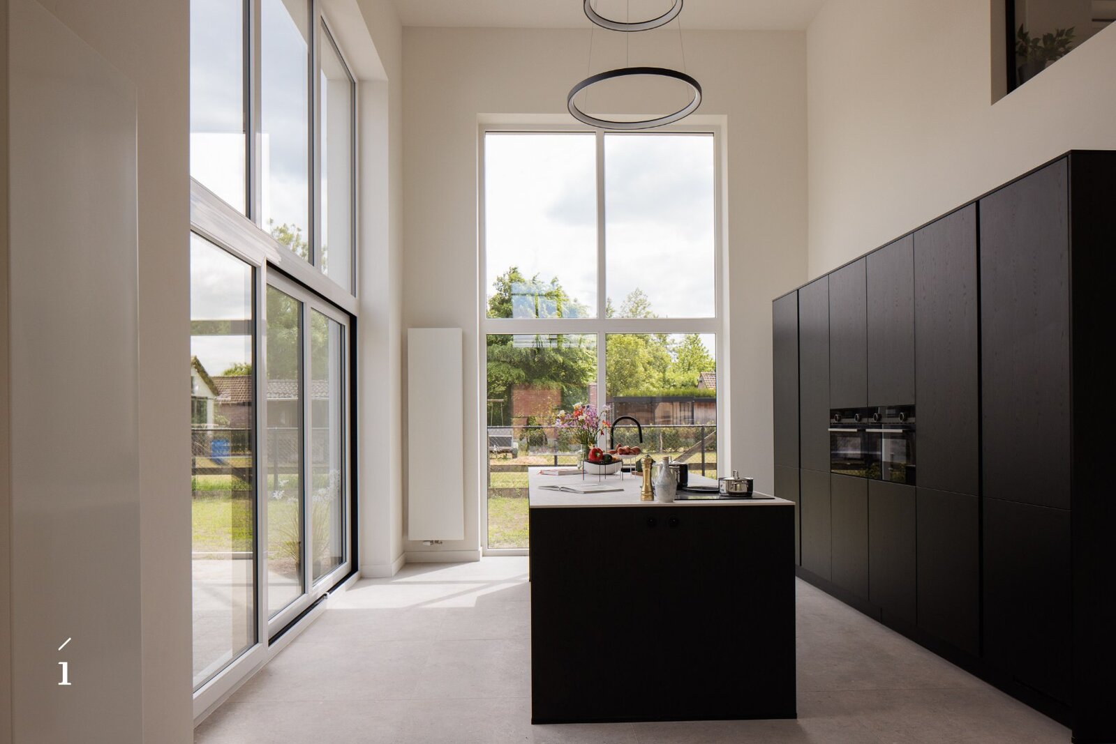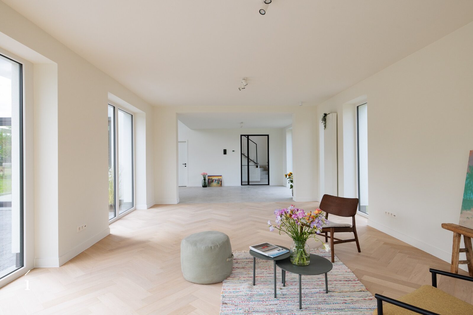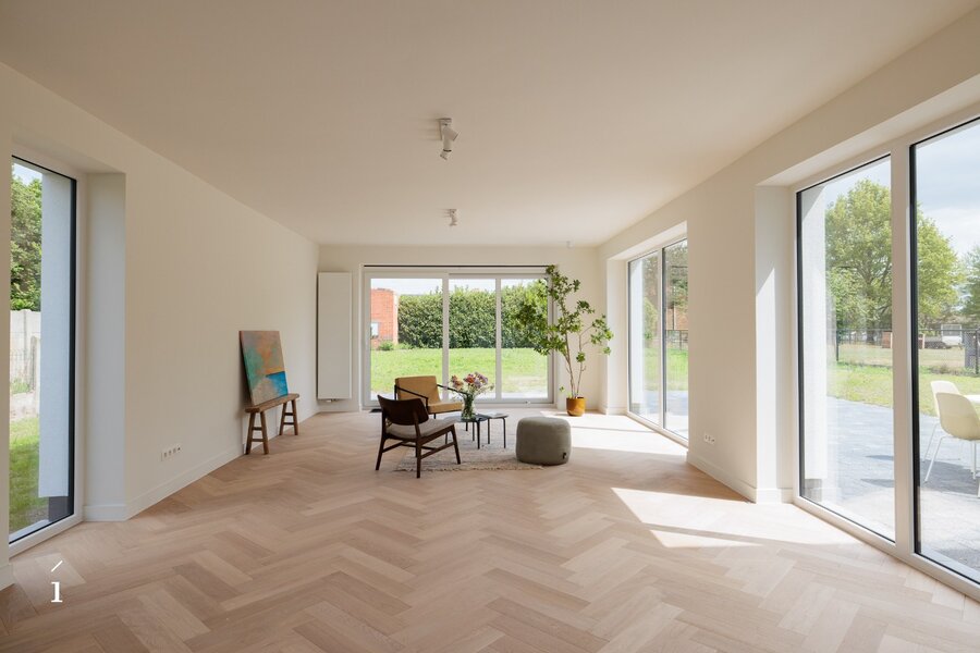 De inkomhal geeft uit op de ruime leefruimte, waar de vide en grote raampartijen zorgen voor een open en luchtig gevoel. De leefkeuken met eetplaats staat in directe verbinding met het terras en de tuin, ideaal voor gezellige familiemomenten of etentjes met vrienden. Naast de keuken vinden we de praktische wasplaats/bijkeuken, voorzien van alle technieken met verder enkele polyvalente ruimten die dienst kunnen doen als berging, fitness, etc.. Ideaal voor wie nood heeft aan ruimte of een handige plek voor vrije beroepers.