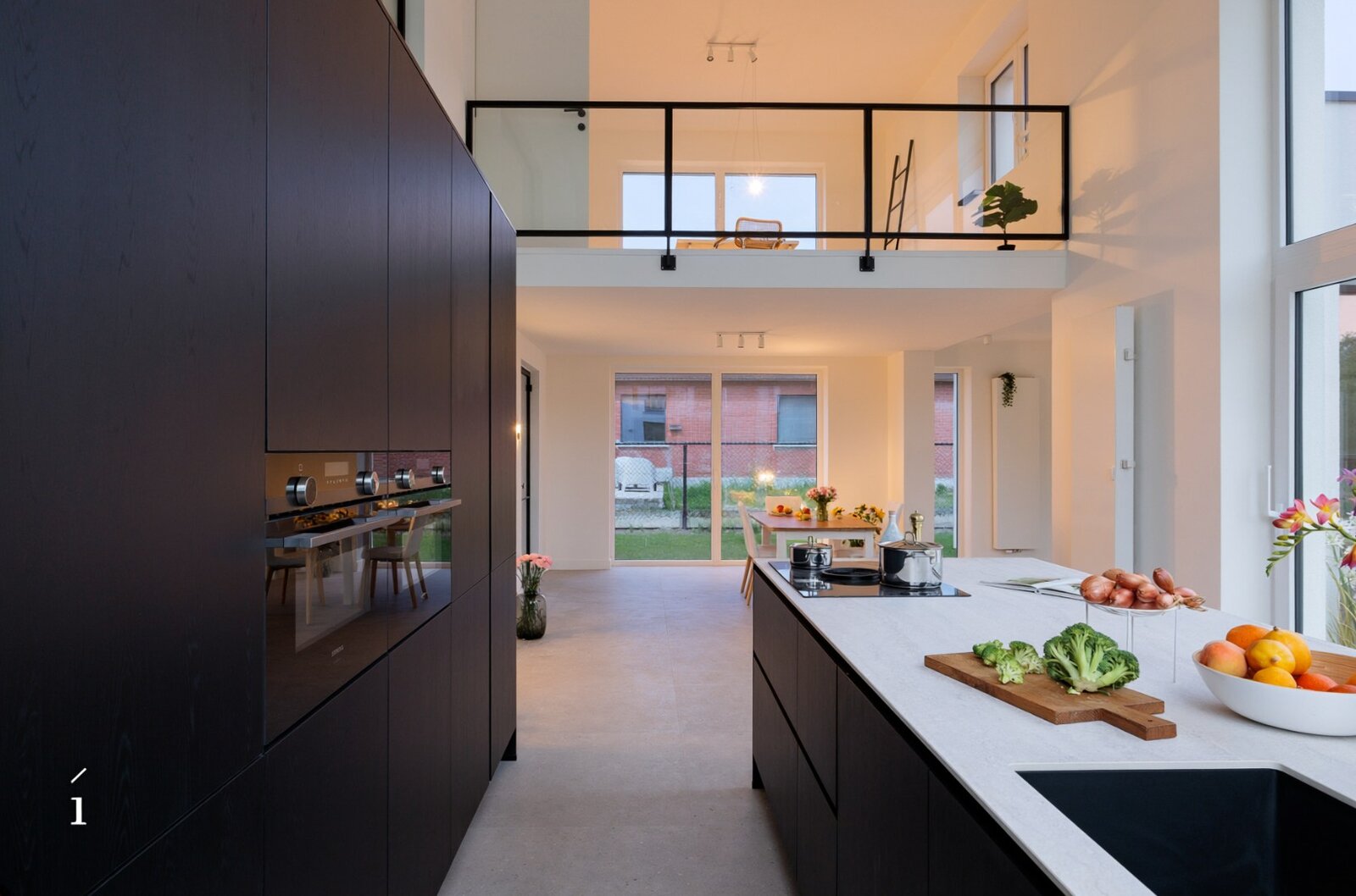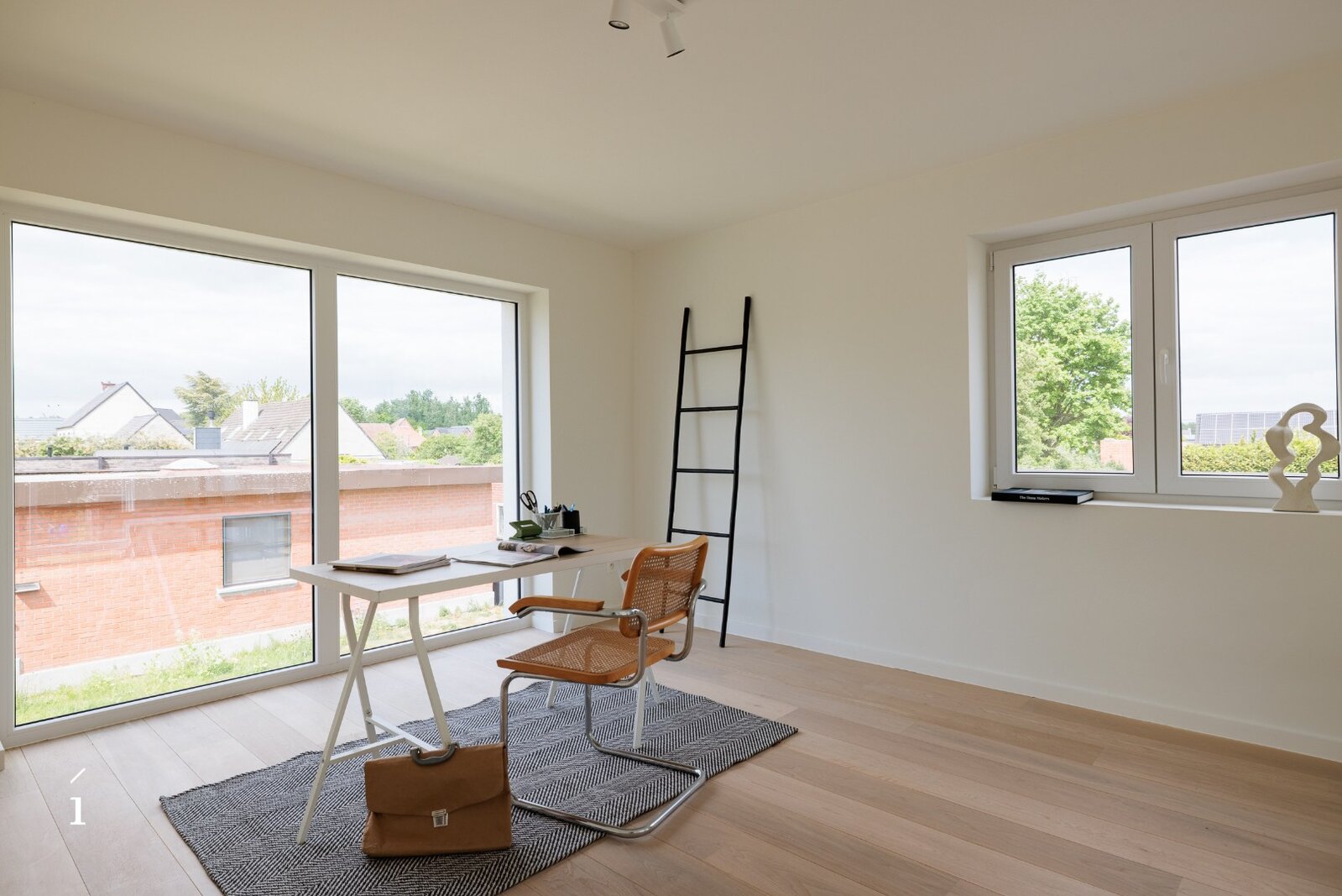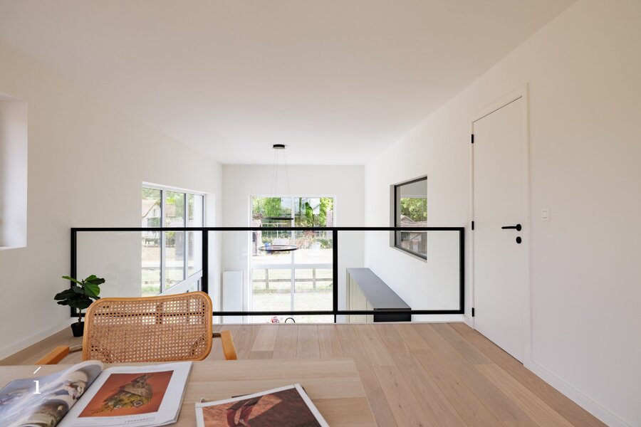De woning is doordacht ingedeeld met oog voor comfort en flexibiliteit. Aansluitend op de keuken bevinden zich een praktische wasplaats en bijkomende ruimtes die u naar wens kunt invullen: als berging, hobbyruimte of werkplek voor een vrij beroep. Op de verdieping biedt een mezzanine zicht op de leefruimte beneden – een lichte plek die zich leent tot werken, lezen of spelen.