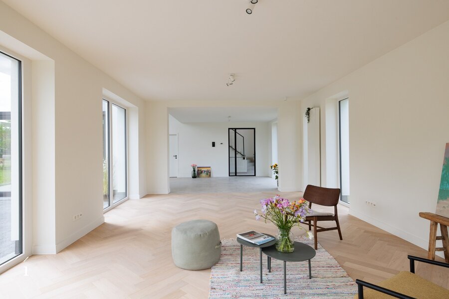 Dankzij de zuidoostelijke oriëntatie en de open indeling baadt de woning de hele dag in natuurlijk licht. Grote raampartijen en een vide versterken het open karakter van de leefruimte. De keuken met eetplaats sluit naadloos aan op het terras en de tuin – een uitnodiging tot samenzijn, of tot stille momenten in het groen.