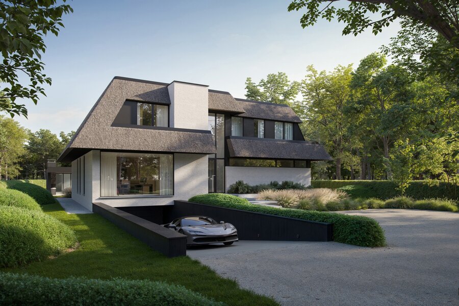 Via een fraaie oprit met bezoekersparking voor 3 auto's bereikt men deze rietgedekte nieuwbouwvilla. Grote stapstenen brengen je naar de overdekte nis aan de voordeur.