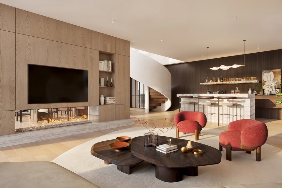 - Een sfeervolle leefruimte met bar, dubbelzijde gashaard en ingemaakte kastenwand