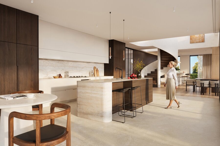 - Een royale eetkeuken met hoogwaardige inbouwtoestellen voorzien van een ruim organisch afgerond kookeiland met zitgedeelte en knusse ontbijthoek voor 4 à 5 personen, koffiecorner.