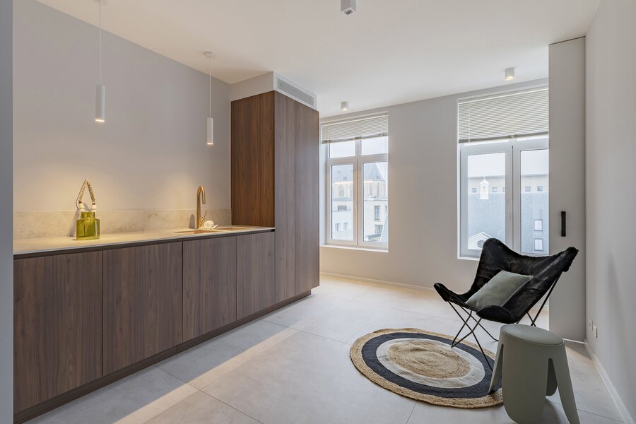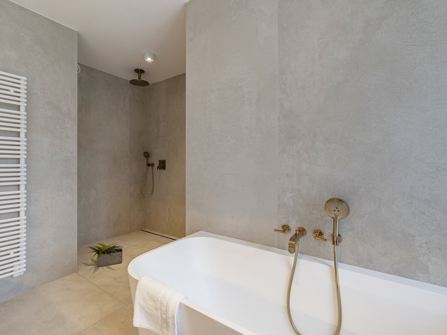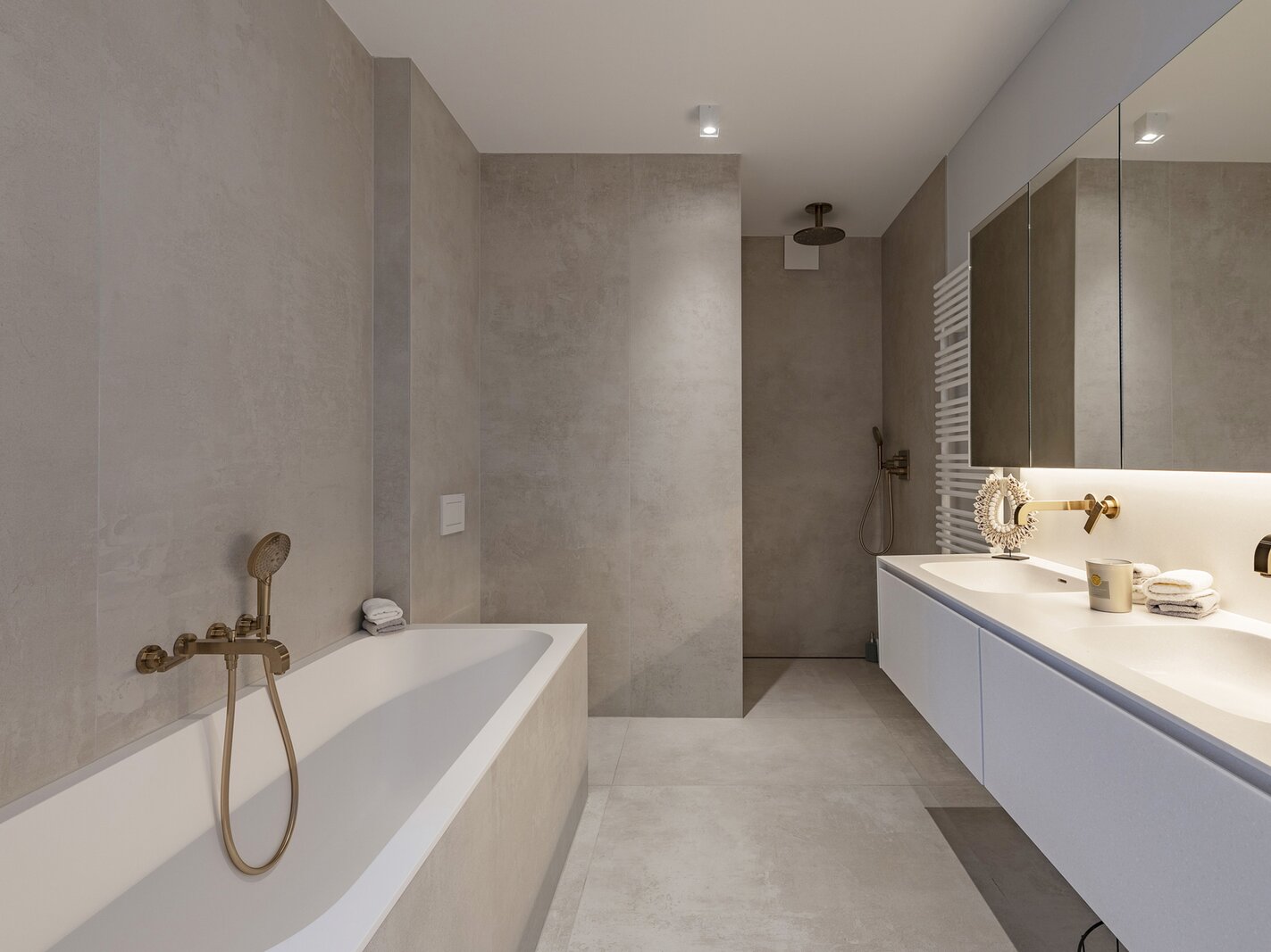 Bij binnenkomst in de ruime inkomhal ervaart u meteen de grandeur van dit penthouse. De open leefruimte met prachtig geïntegreerde gashaard vormt het kloppende hart van het penthouse en staat in directe verbinding met de moderne, volledig uitgeruste keuken. Aansluitend aan de keuken bevindt zich een ruime bijkeuken, perfect voor extra opslag evenals een praktische wasruimte die voorzien is van alle nodige aansluitingen. Verder vind je de ruime master bedroom met dressing en ensuite badkamer, voorzien van een inloopdouche, ligbad, dubbel wastafelmeubel en toilet. Daarnaast zijn er nog twee ruime slaapkamers die eveneens gebruik kunnen maken van een tweede luxueus afgewerkte badkamer.