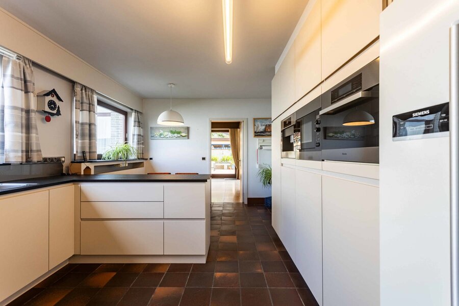 2. inkom met toegang tot de ruime woonruimte met grote raampartijen met zicht op de tuin. De hedendaagse keuken met aansluitend de bijkeuken en extra afzonderlijke bergruimte.