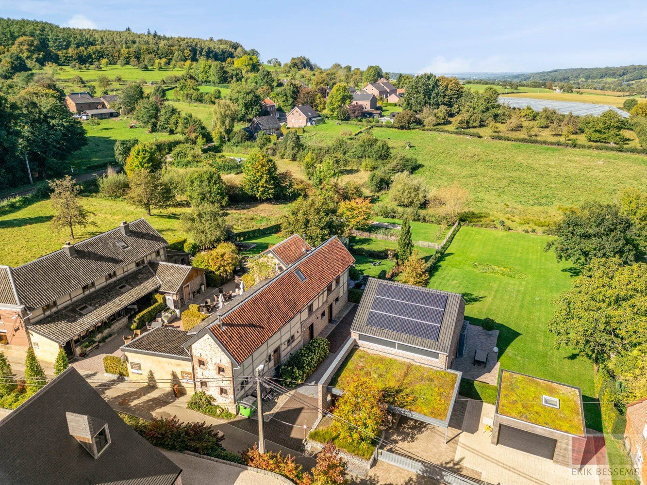 De achterzijde is een luxe privé woning met top uitzicht over de Voerstreek. Het perceel biedt voldoende mogelijkheden voor parkeren en een fijne grote tuin voor zowel vakantiewoning als ook de privé woning.