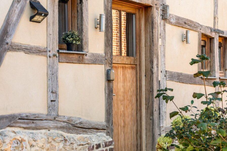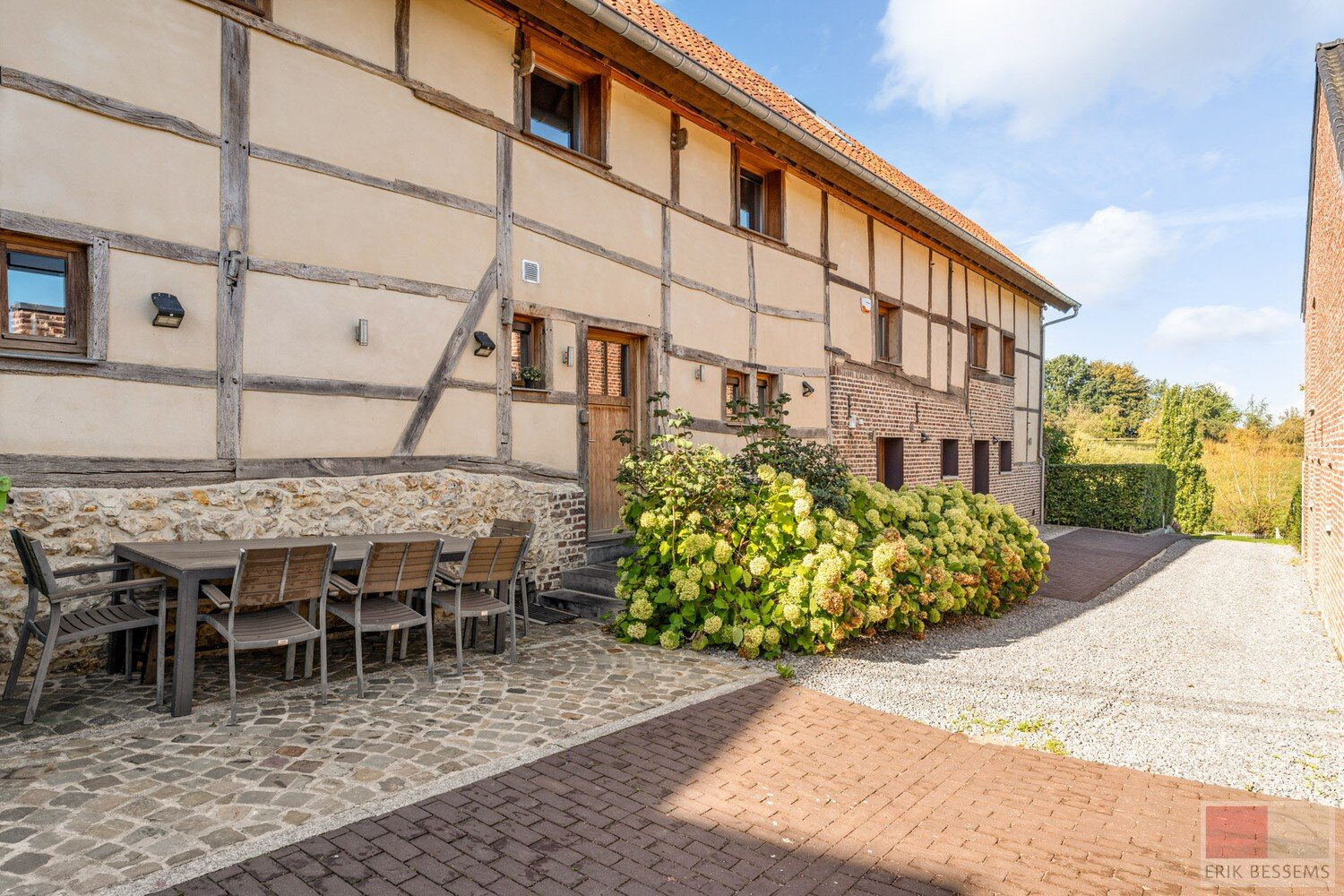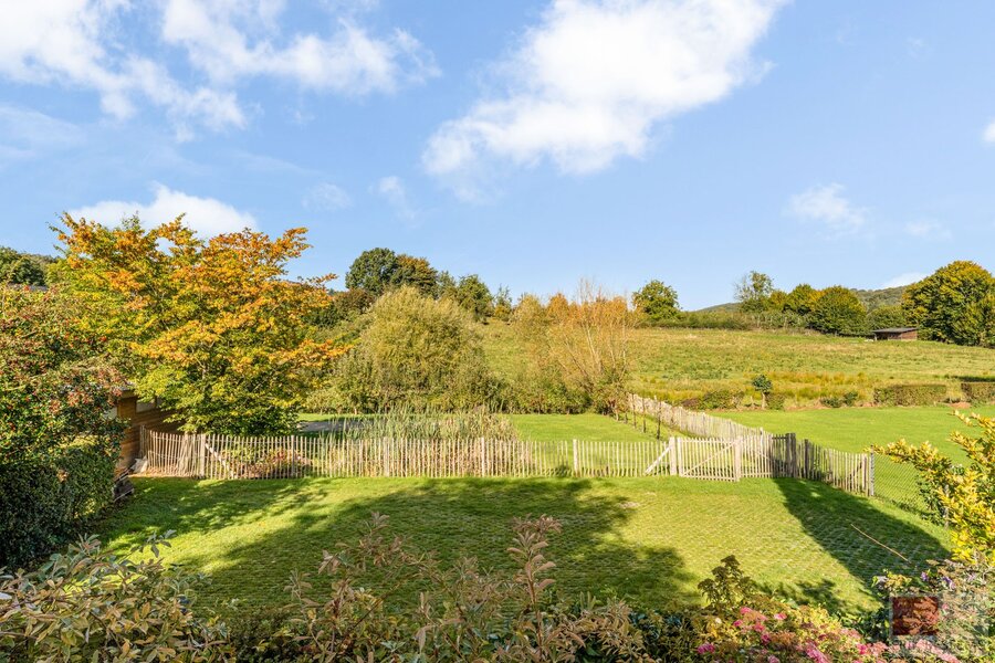 De buitenkant in vakwerk is indrukwekkend, met een prachtig aangelegde tuin omgeven door rustieke houten hekken beidt mogelijkheden voor tuinliefhebbers. De buitenruimte is perfect om te ontspannen en gasten te ontvangen, met ruime zitjes en weelderig groen die een rustig toevluchtsoord creëren.