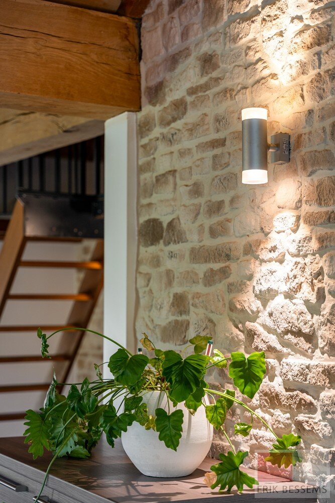 De woonruimtes stralen warmte en comfort uit, met zichtbare houten balken, stenen muren en een houtkachel die een gezellige sfeer creëren. Grote ramen laten natuurlijk licht de kamers binnenstromen, terwijl zorgvuldig gekozen kunstwerken kleurrijke accenten toevoegen aan het neutrale kleurenpalet.