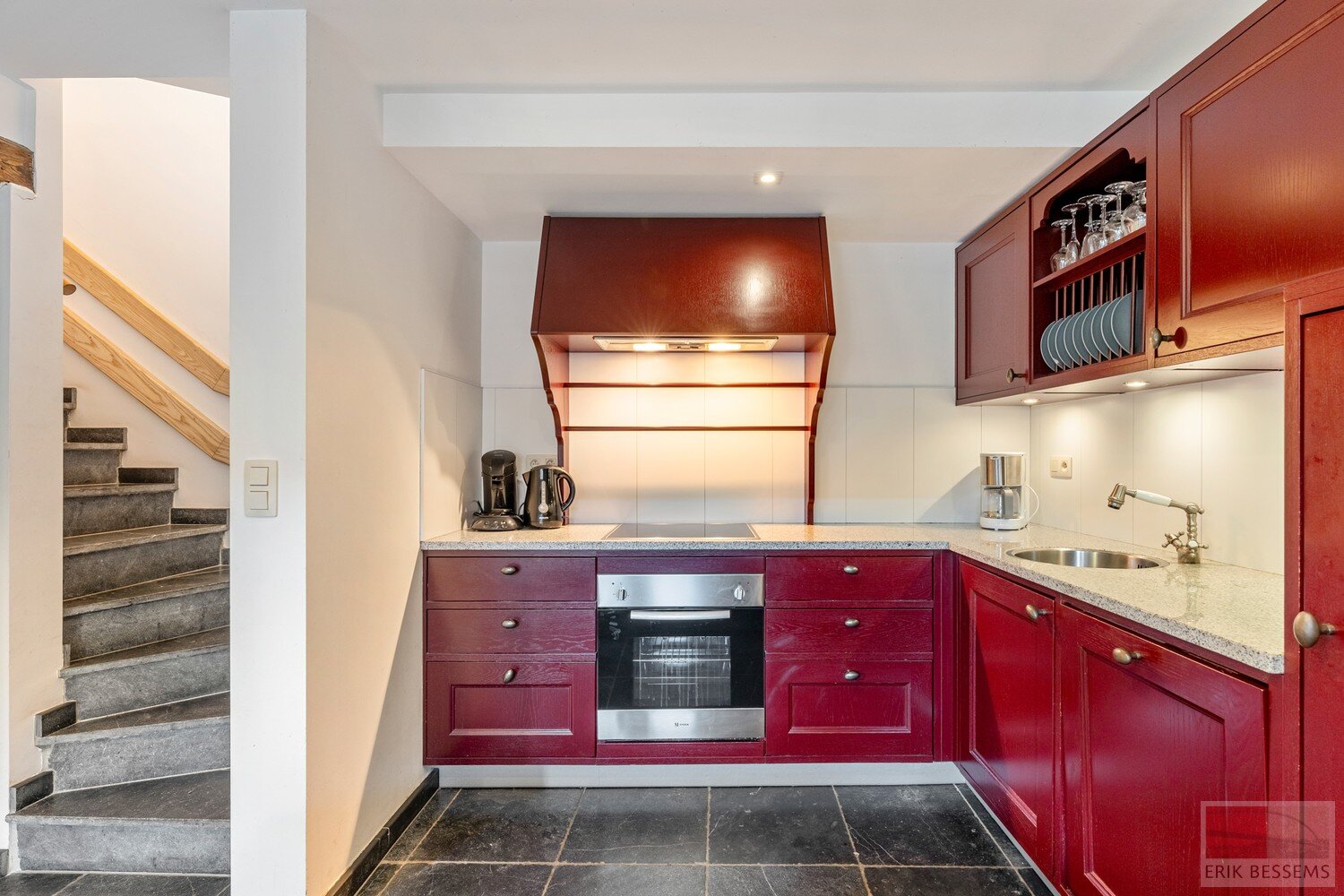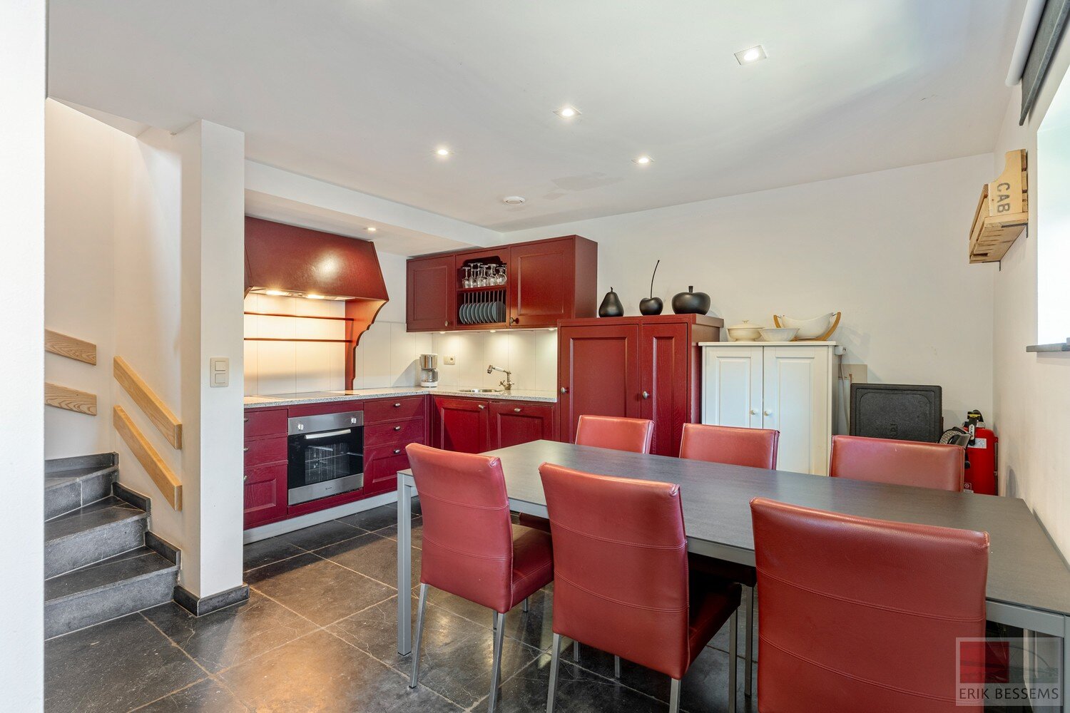 -Keuken met hardstenen vloer en luxe aanbouwkeuken voorzien van een compleet apparatuur pakket.