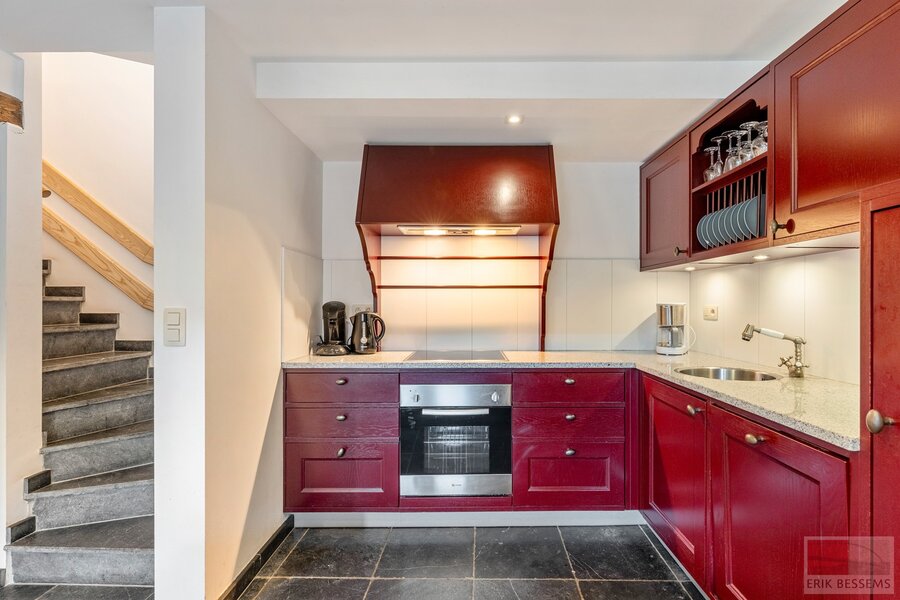 Het interieur is een harmonieuze mix van moderne voorzieningen en rustieke charme. Beide keukens zijn goed uitgerust. De hoofd keuken is een opvallend kenmerk, uitgerust met moderne apparatuur, waaronder meerdere ovens en een strakke inductiekookplaat. De lichtgekleurde kasten en de ruime indeling maken deze keuken ideaal voor culinaire liefhebbers.